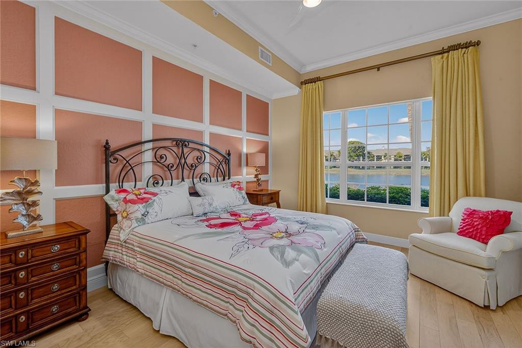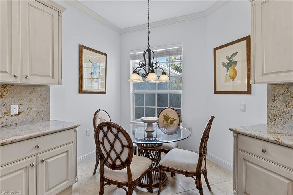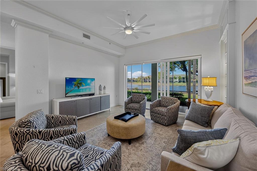 Framed by sweeping long lake views and spectacular western sunsets that paint the evening sky, this beautifully maintained former Laguna model home in Laguna at Fiddler’s Creek offers an exceptional blend of luxury, light, and effortless Naples living. Sold furnished and featuring an attached two-car garage with expansive lake views, this elegant Gulf Bay-built residence captures the best of Florida living. A charming courtyard entry welcomes you into a bright, thoughtfully designed three-bedroom, three-full bath floor plan offering approximately 2,100 square feet under air. Volume ceilings, crown molding and walls of sliding glass doors fill the home with sunshine while framing tranquil water vistas throughout. The spacious great room design is ideal for relaxed daily living and gracious entertaining, seamlessly connecting to an expansive screened lanai overlooking the wide lake and open green space beyond. Positioned for breathtaking sunset skies, the lanai serves as an outdoor living room with generous space for lounging, dining and enjoying the peaceful waterfront setting. The well-appointed kitchen blends style and function with granite countertops, a full granite backsplash, cream cabinetry, GE Profile stainless steel appliances including a natural gas range, bar seating and a sunlit breakfast area. A separate dining space with elegant architectural detailing provides a refined setting for hosting dinners and gatherings. The owner’s suite is a serene retreat featuring calming lake views, private lanai access, engineered wood flooring and two walk-in closets with organizers. The spacious en-suite bath includes dual vanities, a soaking tub, a separate glass-enclosed shower, and a private water closet. Two additional guest bedrooms are generously sized and thoughtfully positioned for privacy, each with its beautifully appointed bath, ideal for guests. Meticulously maintained, the residence includes impact-resistant windows and sliders installed in 2021, a new roof in 2021, new exterior paint, new lanai screens, and a tankless water heater for added efficiency and comfort. This residence, offering first-floor living, a two-car garage, wide lake views, and western sunset exposure, is rarely available. Residents of Laguna enjoy tropical landscaping, tree-lined sidewalks and a private neighborhood pool, along with access to Fiddler’s Creek’s exceptional amenities, including a clubhouse, resort-style pools, fitness center, spa services, tennis, pickleball, bocce, dining and a vibrant social calendar. Optional memberships are available for the championship golf course, beach club and marina. Ideally just minutes from Marco Island’s white-sand beaches, downtown Naples, dining, shopping and the executive airport.