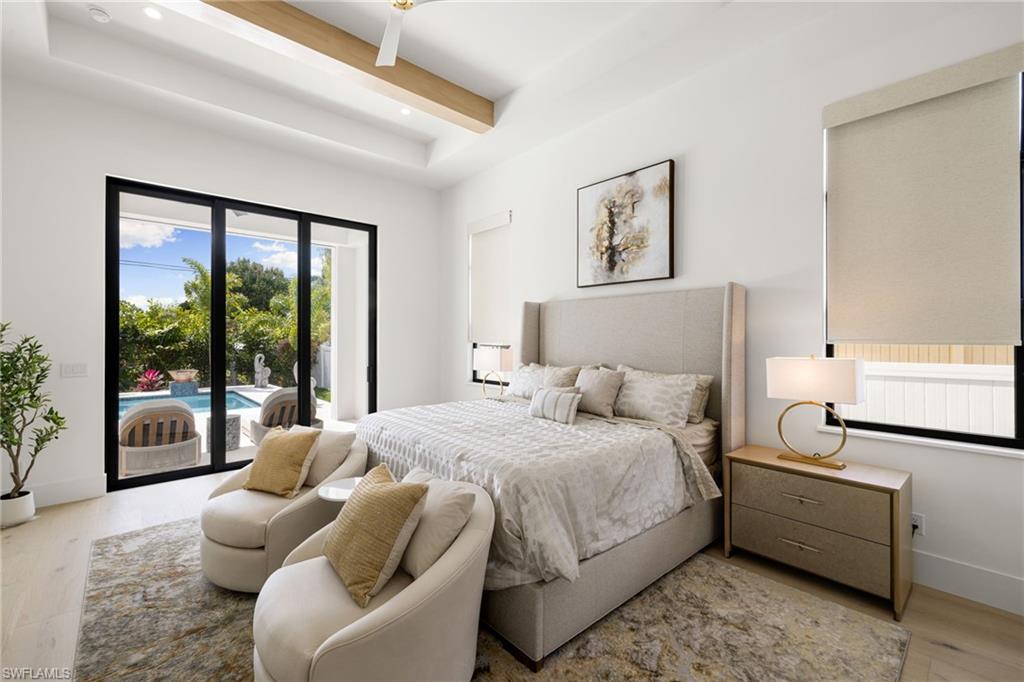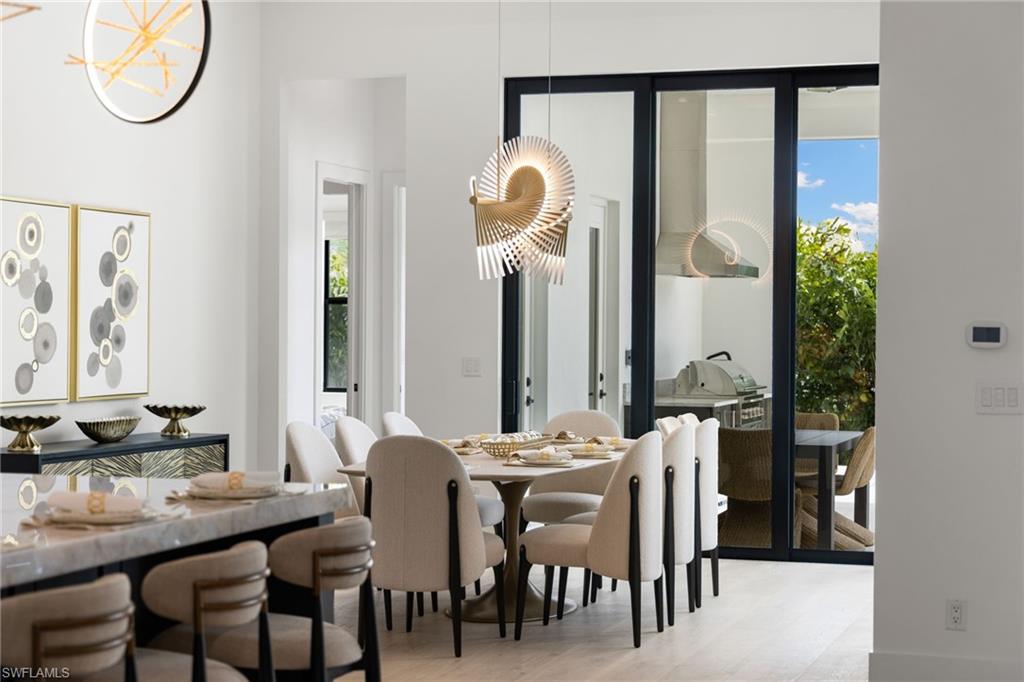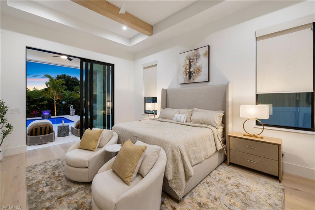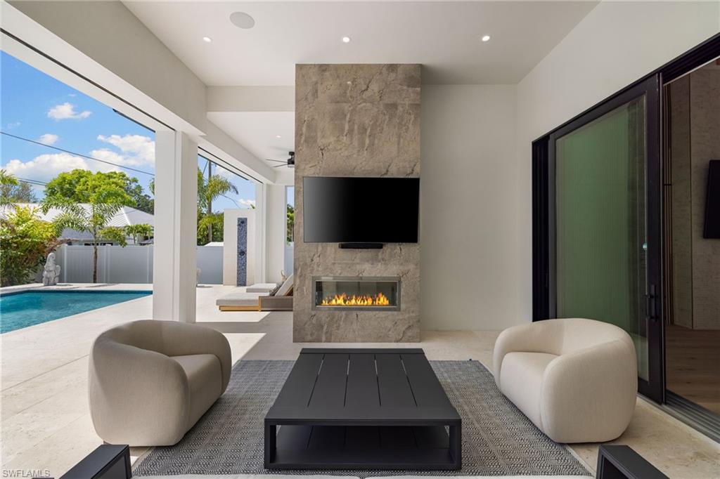 This remarkable new construction home sets a new standard for Naples Park. Upon arrival, a striking double iron-and-glass main entry door sets the tone for what lies within. Light-filled interiors unfold beneath soaring ceilings—reaching up to 21 feet—revealing four beautifully proportioned bedrooms, a private study, and 4.5 thoughtfully designed baths. The dramatic great room, anchored by a warm fireplace, balances grandeur with comfort, creating an inviting space for everyday living and elegant entertaining. Every detail reflects exceptional craftsmanship, from the Thermador appliances and gas range to the handcrafted brass custom range hood, Cristallo and Pompeii quartz countertops, dual gas instant hot water heaters, and impeccable luxury finishes throughout. A resort inspired outdoor space features a custom pool with spillover spa, gentle waterfalls, outdoor shower, expansive sun deck, and an intimate gas fireplace create a setting for relaxed days and unforgettable evenings beneath the Florida sky. The fully equipped outdoor kitchen with gas grill makes entertaining effortless, while the home’s coveted southern exposure fills every space with natural light year-round. This home is offered fully furnished with exquisite, high-quality selections from Arhaus and Robb & Stucky. All bedrooms feature custom window treatments, and TVs with Sonos sound bars are placed throughout the home for seamless living. And for peace of mind, the home includes a full-house 24kW generator, a 1,000-gallon underground propane tank, and a security camera system. Located just moments away from the white sand of Vanderbilt Beach, the iconic new Ritz-Carlton Residences, and the charm of Mercato offering premier restaurants, boutique shopping and a vibrant night life. This home is truly Naples at its finest.