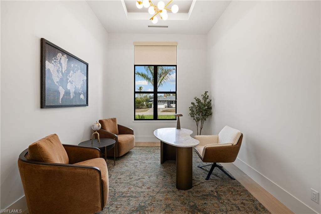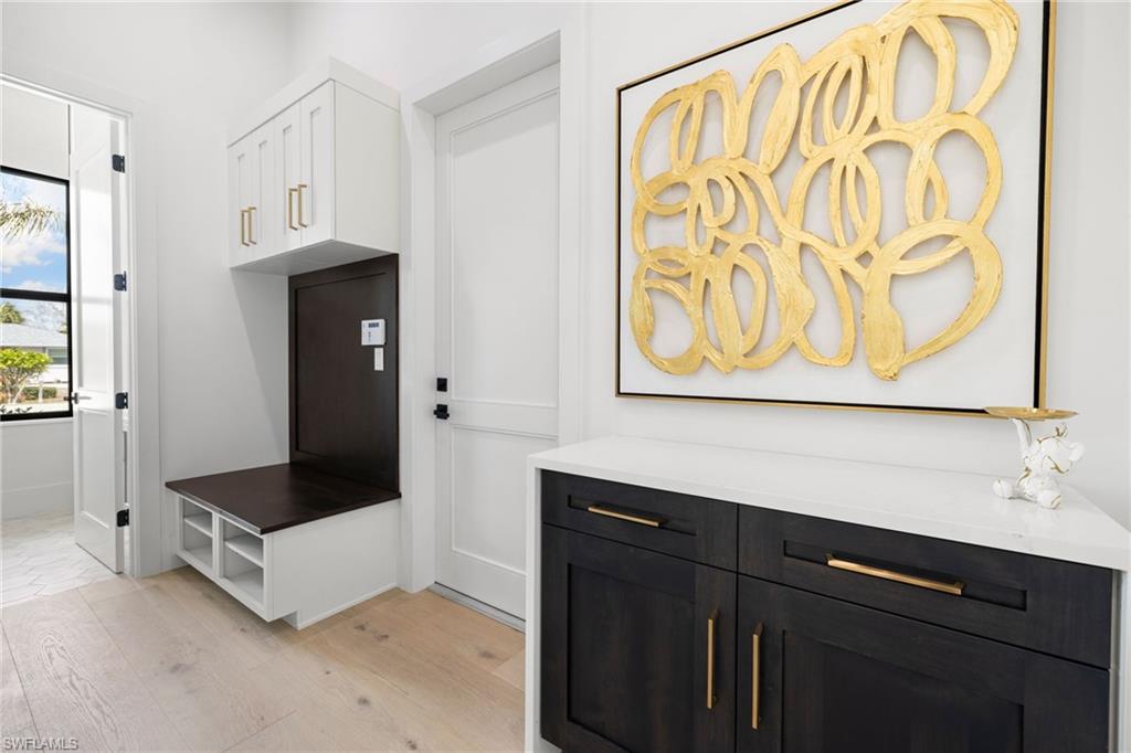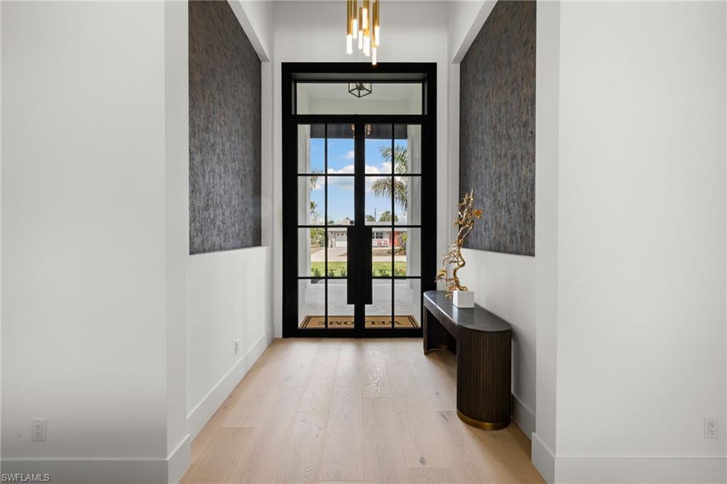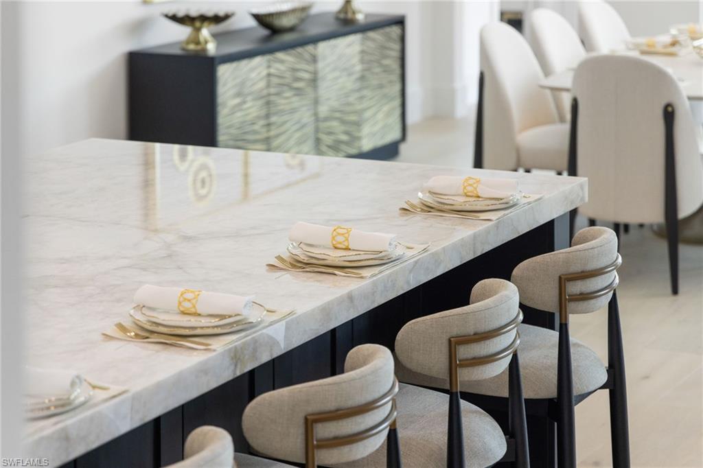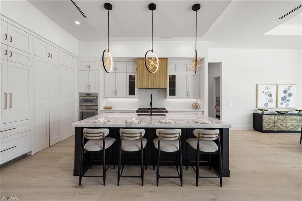 This remarkable new construction home sets a new standard for Naples Park. Upon arrival, a striking double iron-and-glass main entry door sets the tone for what lies within. Light-filled interiors unfold beneath soaring ceilings—reaching up to 21 feet—revealing four beautifully proportioned bedrooms, a private study, and 4.5 thoughtfully designed baths. The dramatic great room, anchored by a warm fireplace, balances grandeur with comfort, creating an inviting space for everyday living and elegant entertaining. Every detail reflects exceptional craftsmanship, from the Thermador appliances and gas range to the handcrafted brass custom range hood, Cristallo and Pompeii quartz countertops, dual gas instant hot water heaters, and impeccable luxury finishes throughout. A resort inspired outdoor space features a custom pool with spillover spa, gentle waterfalls, outdoor shower, expansive sun deck, and an intimate gas fireplace create a setting for relaxed days and unforgettable evenings beneath the Florida sky. The fully equipped outdoor kitchen with gas grill makes entertaining effortless, while the home’s coveted southern exposure fills every space with natural light year-round. This home is offered fully furnished with exquisite, high-quality selections from Arhaus and Robb & Stucky. All bedrooms feature custom window treatments, and TVs with Sonos sound bars are placed throughout the home for seamless living. And for peace of mind, the home includes a full-house 24kW generator, a 1,000-gallon underground propane tank, and a security camera system. Located just moments away from the white sand of Vanderbilt Beach, the iconic new Ritz-Carlton Residences, and the charm of Mercato offering premier restaurants, boutique shopping and a vibrant night life. This home is truly Naples at its finest.