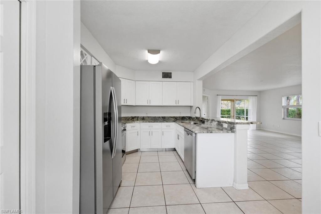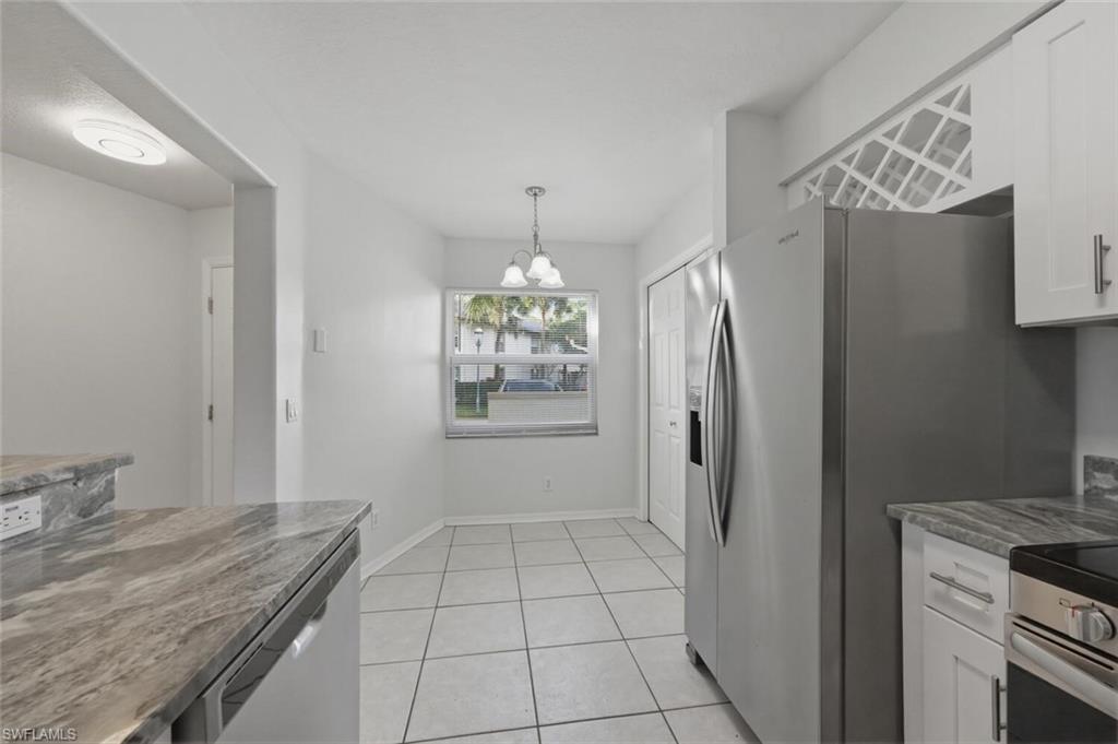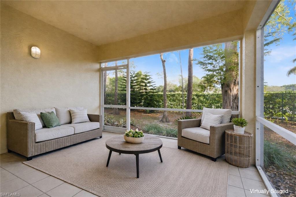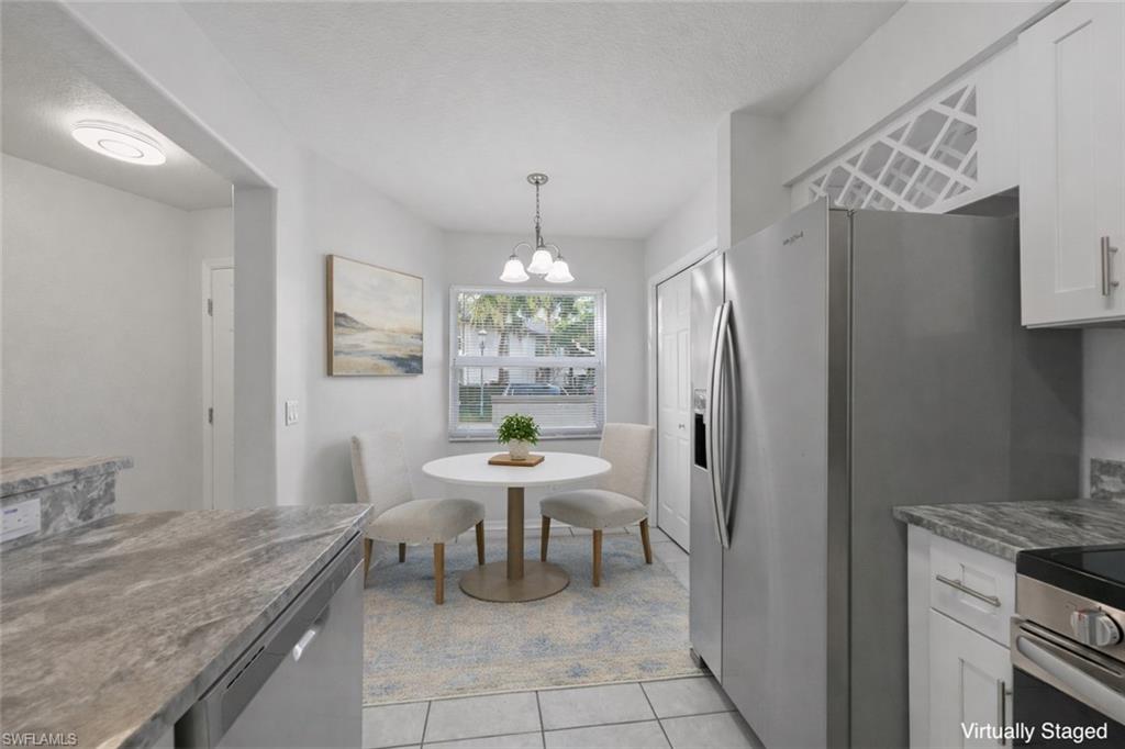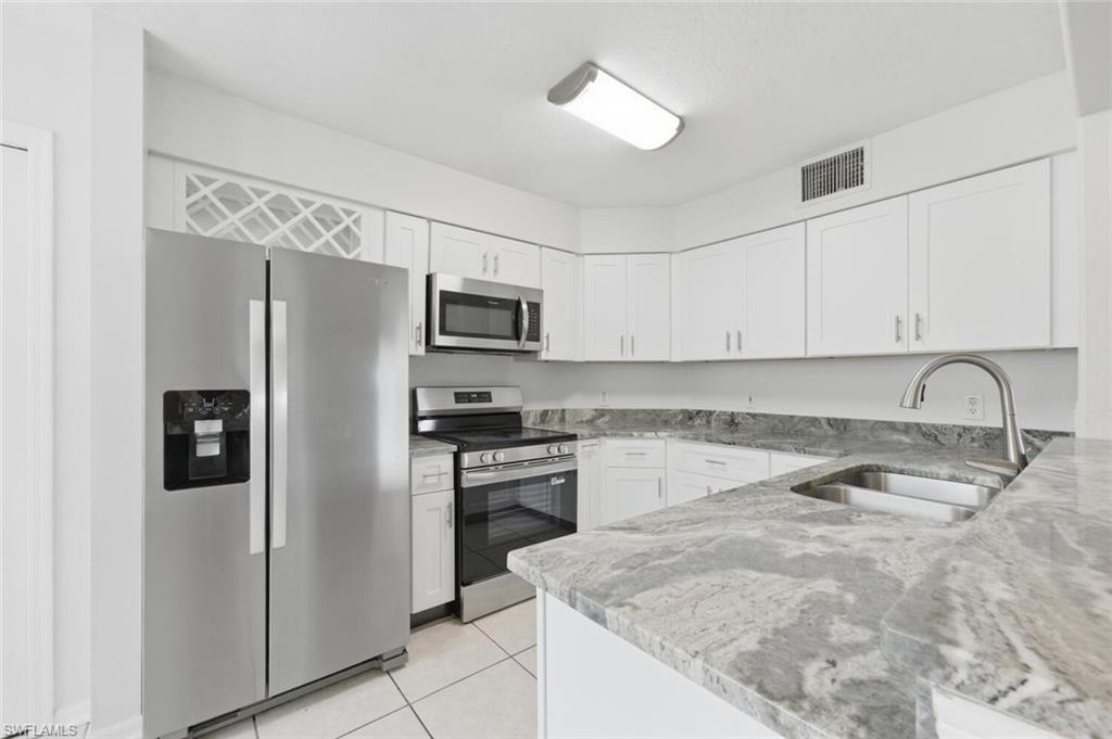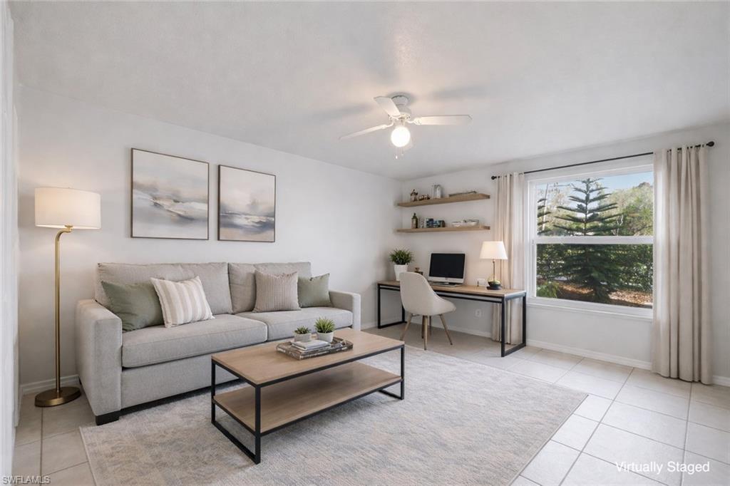 One or more photo(s) has been virtually staged, AI generated or rendered. Priced to sell! Welcome to Crescent Gardens in desirable North Naples. This well maintained first floor 3 bedroom residence, with the option to use the third bedroom as a den, offers 2 bathrooms and the convenience of single level living with no stairs in a quiet, low density community. The updated kitchen features newer appliances, countertops and cabinets with an eat-in kitchen, pantry and breakfast bar. Both bathrooms have updated countertops, and the primary bathroom also has new cabinetry. The spacious primary suite offers two walk-in closets. Tile flooring runs throughout the main living areas and bathrooms, with new wood-look vinyl plank flooring in the guest bedroom. BRAND NEW impact resistant windows throughout, a new dryer and newer washer add additional value and peace of mind. Enjoy your private patio and the convenience of a one car private garage along with one parking space directly in front of the residence. The buildings feature newer roofs and have recently been painted. Crescent Gardens offers a community pool with lounge chairs and a prime North Naples location minutes from beautiful beaches, Mercato, and dining, shopping & entertainment to complete the ultimate Naples lifestyle! Also conveniently located within walking distance to Pelican Marsh Elementary School. One or more photo(s) has been virtually staged, AI generated or rendered.