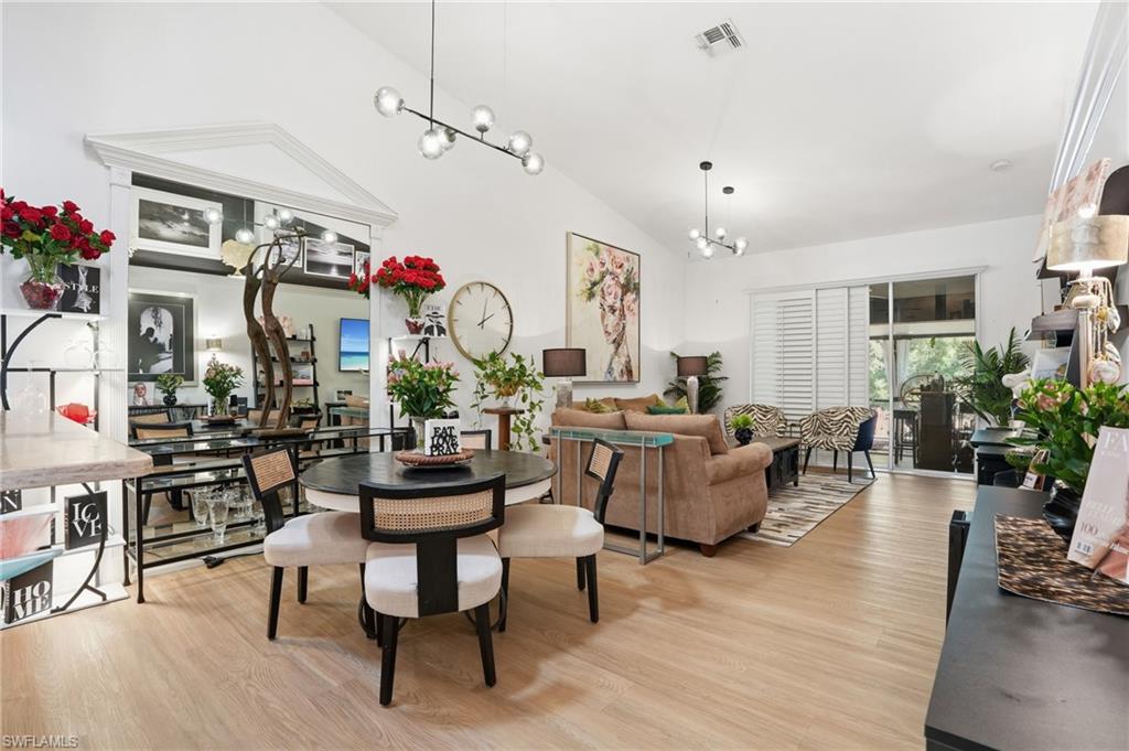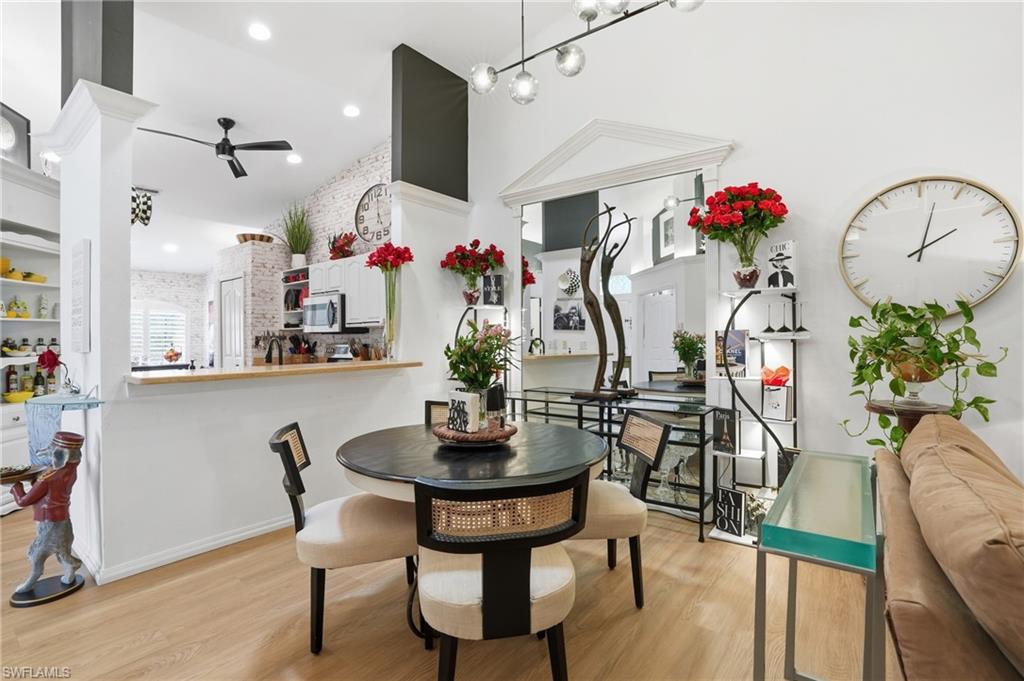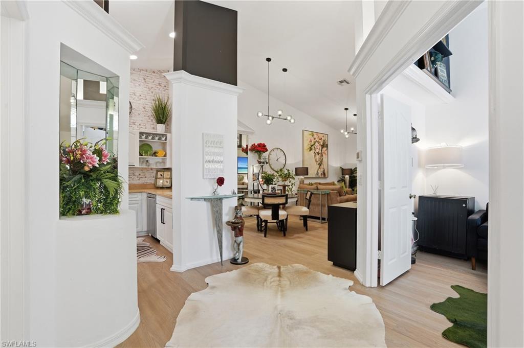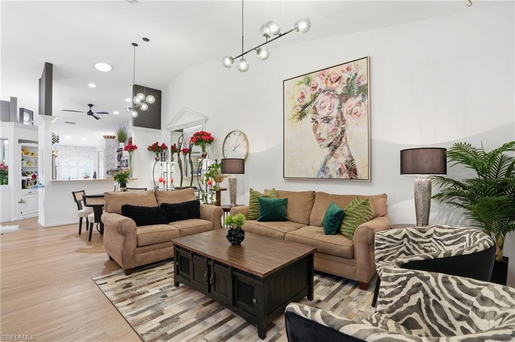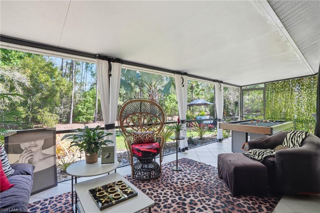 Magazine-worthy style without the magazine-worthy price. Set on a private corner lot in a gated community, this beautifully remodeled 3 bedroom, 2 bath villa delivers the kind of design, warmth, and indoor-outdoor living that buyers dream about. Designed by renowned interior designer Faith Ashley and offered fully furnished, this is a true move-in-ready showstopper. Just bring your toothbrush and start living the Naples lifestyle in style. Inside, the home is filled with thoughtful upgrades and elevated finishes, including luxury vinyl flooring, plantation shutters, fresh paint throughout, designer lighting and fans, California Closets, and an updated guest bath vanity with a clean, modern feel. Every space has been curated with a polished eye, creating a home that feels stylish, welcoming, and effortlessly livable. Step outside and the charm continues. Surrounded by a lush preserve for added privacy, the outdoor living spaces create a true tropical retreat. Relax in the step-down fireplace lounge with sofa seating, a cantilever umbrella, and fire feature for cozy evenings. Enjoy meals on the elevated dining patio, or entertain on the expansive screened lanai, which adds approximately 300 square feet of additional living space and features a full bar, comfortable seating, and a brand-new pool table. There is also room to add your own private pool, giving the next owner the opportunity to make this special property even more spectacular. Additional highlights include extra guest parking just steps away, very low HOA fees, a private sprinkler system, no flood zone location, and the ease of purchasing a home that is sold beautifully furnished. Located in a peaceful community with convenient amenities, this villa is ideal as a full-time residence, seasonal getaway, or smart Naples retreat for someone who loves beautiful spaces without overspending. Stylish, furnished, and full of personality, this is the Naples home that proves great taste does not have to come with an over-the-top price tag.