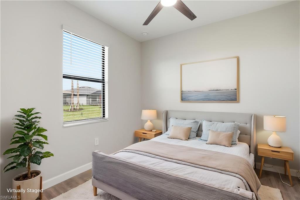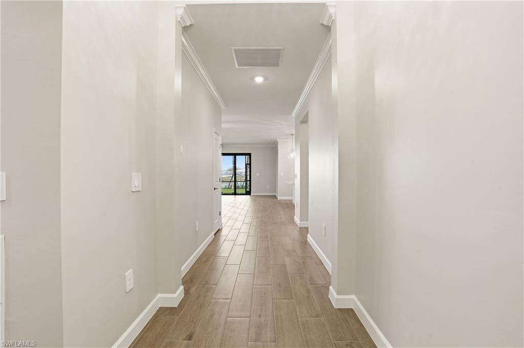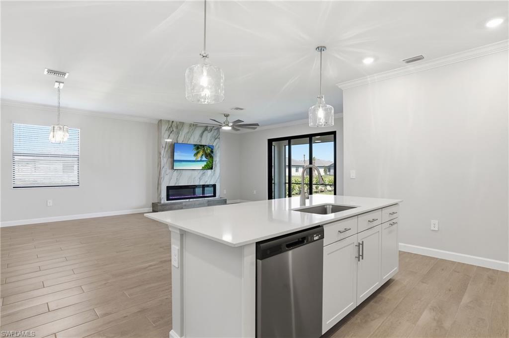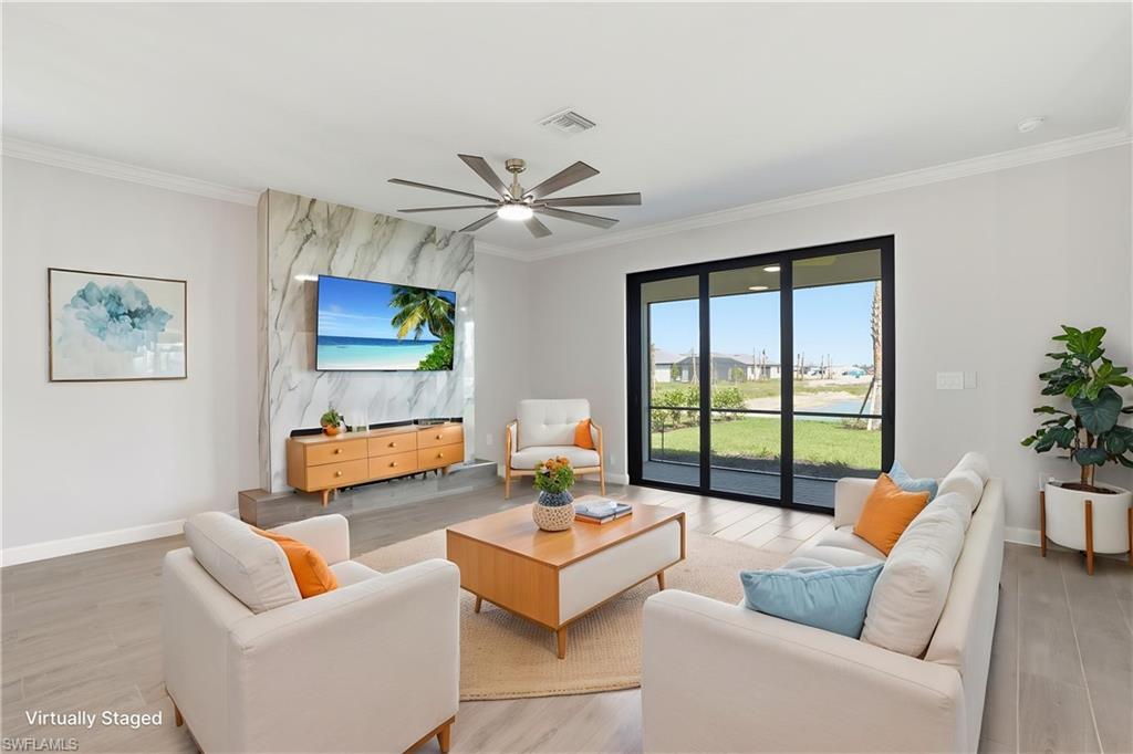 Welcome to 19213 Gentry Place, an exquisite brand-new, never-lived-in Trevi model located in the highly sought-after Verdana Village in Estero, Florida. This stunning four-bedroom, three-bathroom home offers 2,032 square feet of thoughtfully designed living space with luxurious upgrades and high-end finishes throughout. Step inside to an inviting open-concept floor plan featuring elegant tile flooring, recessed lighting, and crown molding in both the main living area and the owner’s suite. The dining room showcases beautiful custom trim details that add a touch of elegance and architectural character to the space. The spacious family room is highlighted by a custom marble entertainment wall with a built-in fireplace and mounted TV, creating a warm yet modern focal point that is perfect for relaxing or entertaining. The gourmet kitchen is ideal for both entertaining and everyday living, featuring a large center island, stainless steel appliances including a gas cooktop, gas oven, and refrigerator, a custom glass tile backsplash, walk-in pantry, and a cozy breakfast nook. Additional highlights include under-cabinet and above-cabinet lighting that provide both ambiance and functionality. Each bedroom is generously sized with walk-in closets, while the bathrooms feature dual vanities and upgraded custom glass shower doors. The owner’s suite serves as a private retreat complete with a spa-inspired en-suite bath and designer finishes. Step outside to a private covered lanai with northern exposure overlooking a beautiful lake view, along with a private side yard and upgraded Calusia landscaping, creating the perfect setting to enjoy Southwest Florida’s outdoor lifestyle. Additional upgrades throughout the home include a built-in entertainment center with fireplace and mounted TV in the living room, designer ceiling fans and upgraded lighting fixtures, custom tile accents, laundry room cabinets, and an epoxy-coated garage floor. Located in a no-flood zone, this home offers peace of mind while still being conveniently close to Southwest Florida’s beautiful beaches, premier shopping, dining, and Southwest Florida International Airport. Residents of Verdana Village enjoy access to world-class amenities including indoor and outdoor pickleball courts, indoor and outdoor tennis courts, a state-of-the-art fitness center, an indoor sports complex, and a resort-style pool with a full-service pool bar. The community also features onsite dining at the Drift Restaurant and Craft Lounge, as well as a playground and dog park. For added convenience, residents have golf cart access to nearby retail shops including Publix, Dunkin’ Donuts, The UPS Store, Fifth Third Bank, and New York Pizza and Pasta. This is your opportunity to own a designer-upgraded, move-in-ready home in one of Southwest Florida’s most dynamic communities and experience the Florida lifestyle where every day feels like a vacation. Schedule your private showing today.