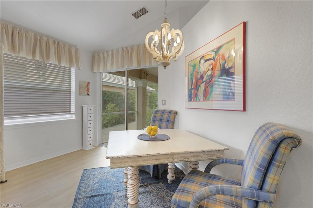 Close to the beautiful sandy beaches of Naples lies this 3 bedroom 2 bathroom single family home with a 2 car garage and private back yard. Upon entering you are wowed with cathedral ceilings and views of a paradise setting. semi open floor concept make it a great entertainment space. New stainless steel appliances, granite counters and mosaic back splash are amongst some of the upgrades the home offers. Large overhang area on your screened in patio is great to enjoy that Florida Lifestyle. At the club at Sterling oaks you will enjoy great amenities including a gated entry, tennis courts and pickle ball courts, an olympic sized lap pool, poolside cabana offering adult beverages and amazing meals, all delivered to you while sitting poolside! The community also has a newly remodeled fitness center, and a beautiful restaurant and clubhouse. All of this is just minutes away from four award winning Gulf beaches, an array of restaurants, shopping, and entertainment!