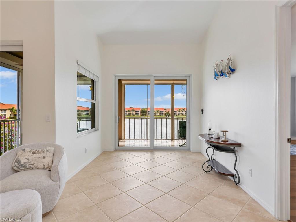 Welcome to this two bedroom, two bathroom plus den condominium in Huntington Lakes in Naples. This upstairs unit offers a functional layout, a two car garage, and a peaceful lake view along with several recent updates throughout the home and the phase. The interior of the condo has recently been fully repainted, giving the space a bright and refreshed feel. The layout includes a comfortable living area, a dining space, and a den that can be used as a home office, sitting room, or additional guest space. The large eat in kitchen offers ample cabinetry and counter space along with room for a casual dining table. Recent updates include a new refrigerator and replaced faucets in both the kitchen and laundry room. The primary suite provides direct access to the screened lanai overlooking the lake. This spacious bedroom includes a walk in closet and an ensuite bathroom with dual sinks, a separate soaking tub, and a walk in shower. The screened lanai creates a relaxing outdoor space to enjoy the water view. Two new ceiling fans with lights and remote controls were recently installed to add comfort to the lanai. Additional updates in the home include a hot water heater installed approximately two years ago and recently serviced hurricane shutters. The phase has also completed several major improvements. Approximately two years ago brand new hurricane impact windows, sliding glass doors, and entry doors were installed throughout the phase. The buildings in the phase were repainted last year. Residents of Huntington Lakes have access to several community amenities. There are three heated pools located throughout the community, and the clubhouse features a resort style pool and hot tub. Grills are available at all three pools, along with tennis courts and a variety of community activities. The community is located close to shopping, dining, and everyday conveniences throughout Naples.