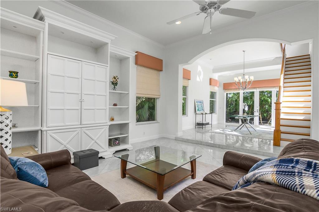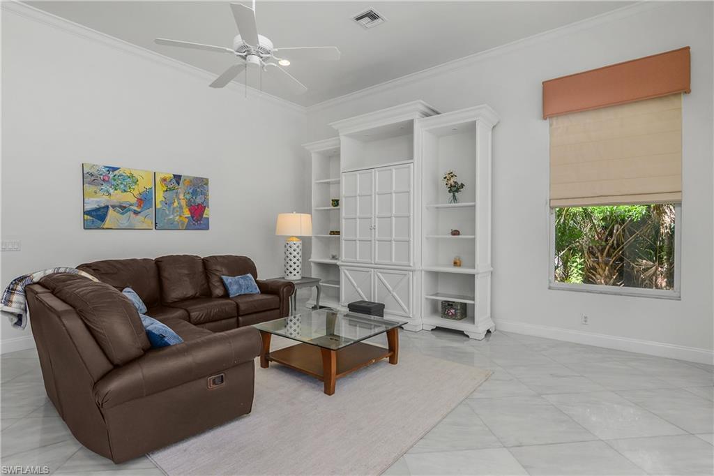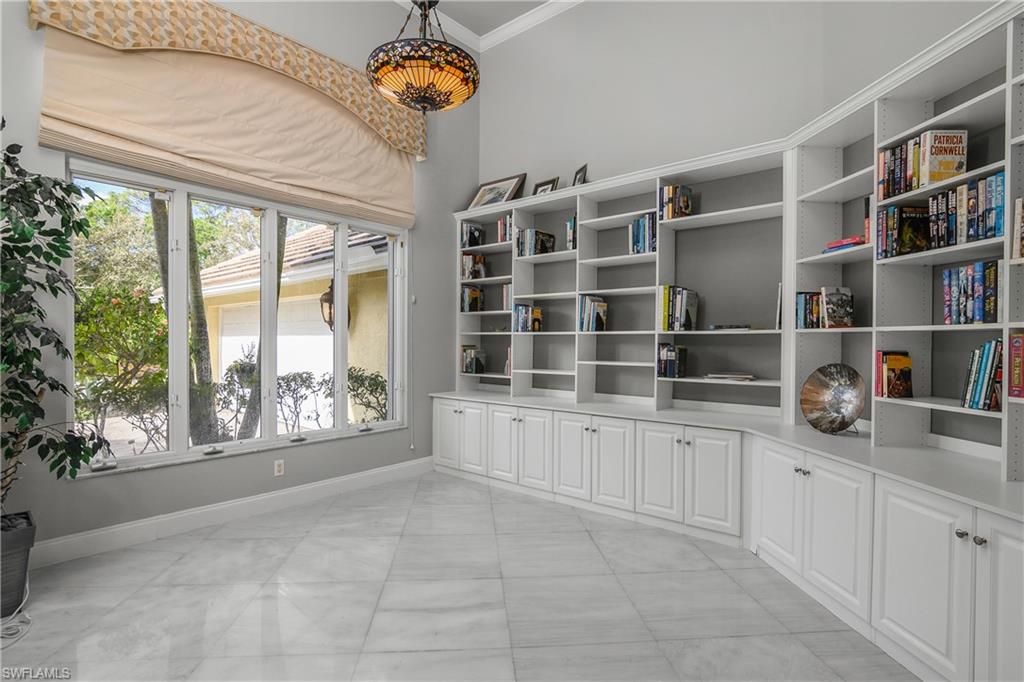 Located at the end of a quiet cul-de-sac on an oversized .46-acre lot, this expansive home offers exceptional privacy with only one neighboring property and tranquil preserve views. The residence features 3 bedrooms plus a den, 4 full bathrooms, a library, and an upstairs loft, providing flexible living space for guests, work, or hobbies. Marble flooring runs throughout the main living areas, all 3 bedrooms, the den, and the library. A spacious dining area surrounded by windows sits beside the staircase leading to the loft, filling the home with natural sunlight. Each bedroom includes its own ensuite bathroom, offering comfort and privacy for family and guests. The primary suite, located on one side of the home for added privacy, features electric blackout shades and two walk-in closets with upgraded wood shelving, including an oversized main closet. The additional bedrooms are situated on the opposite side of the home, creating a thoughtful split floor plan ideal for both owners and guests. Additional highlights include a full pool bathroom, electric storm shutters on the back lanai, and an oversized two-car garage. Recent updates include a tile roof installed in 2017, a new electrical panel (2024), newer dishwasher in 2024, newer pool pump, and air conditioning units replaced in 2022 and 2024. This unique property combines space, privacy, and thoughtful upgrades in a highly desirable setting. Pelican Landing is located just west of US-41, south of Coconut Point Mall, and bordering Estero Bay. This prestigious community encompasses 2,365 acres of lush preserves, sparkling lakes, and mature palms and oaks, creating a beautifully landscaped natural setting. Pelican Landing is known for its exceptional amenities, highlighted by the Pelican Landing Island Beach Park on Big Hickory Island. Residents access the 34-acre beach park via a scenic 12-minute shuttle boat ride across Estero Bay. The beach park features an elevated beach house, restrooms, open-air pavilions, and a large screened pavilion with deck seating. Additional amenities include a 3,200-sq-ft community center with a state-of-the-art fitness center, an adjacent 1,200-sq-ft aerobics and yoga studio, and a full calendar of social activities. Outdoor recreation options include 12 Har-Tru tennis courts (7 lighted), 6 pickle ball courts, bocce courts, a butterfly garden, a canoe and kayak park, and a sailing center at the marina. Pelican landing also features three golf courses with two separate golf membership opportunities, offering additional options for golf enthusiasts.