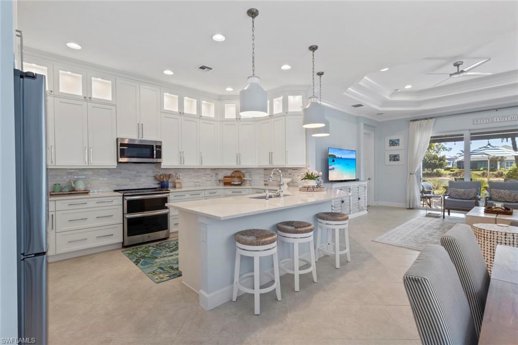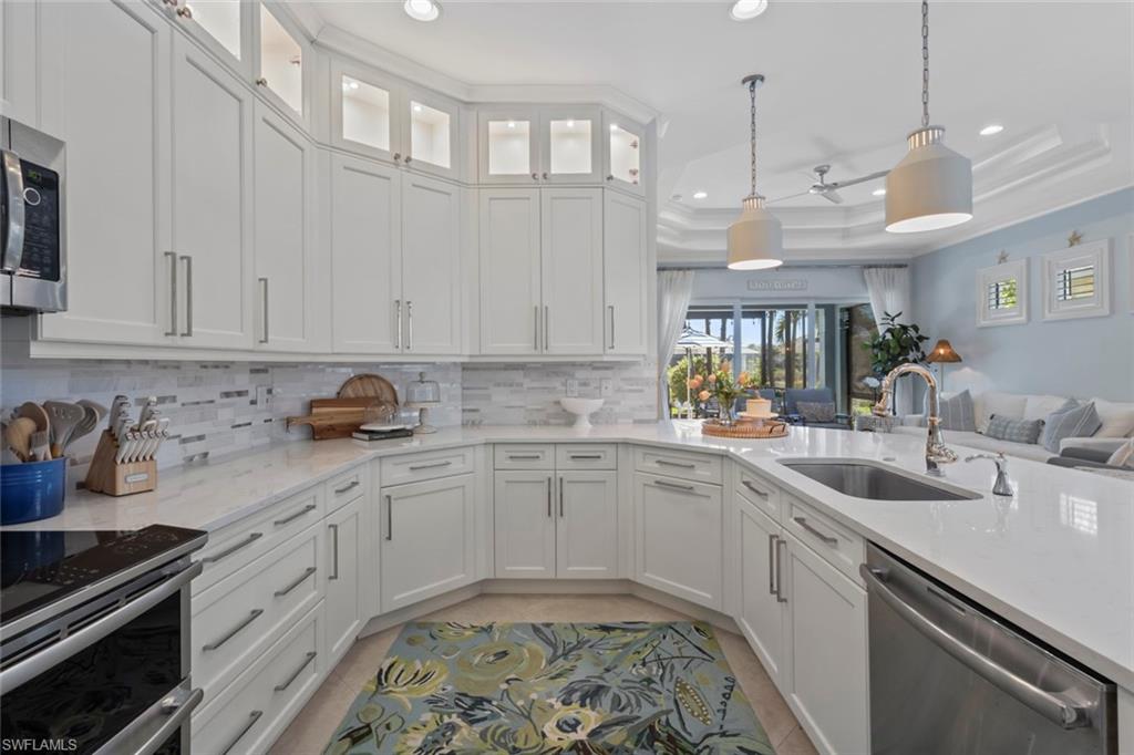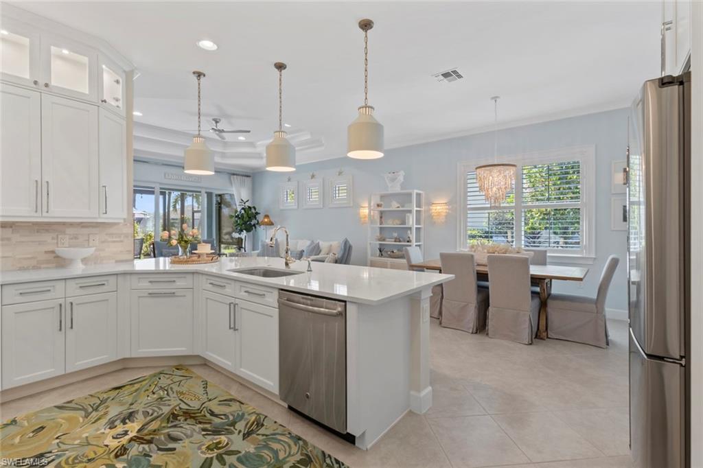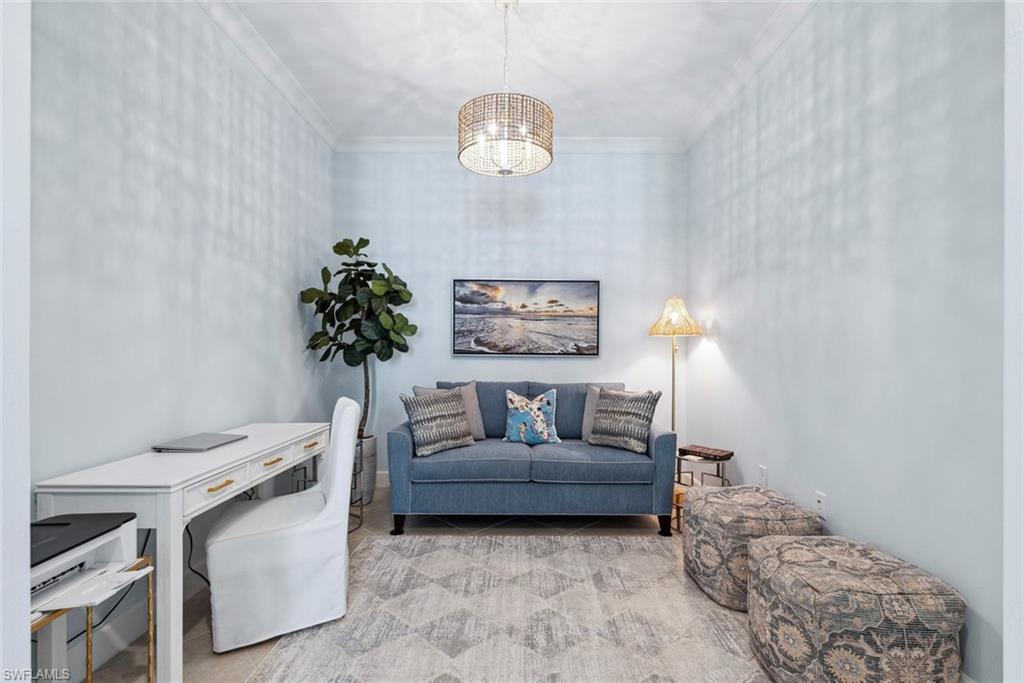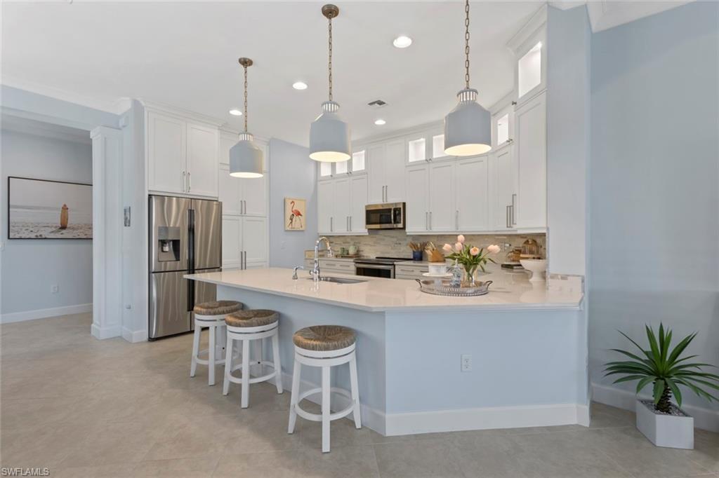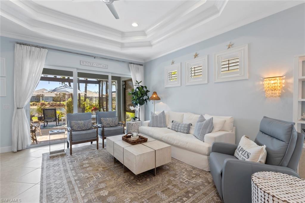 Welcome to 5690 Elbow Ave, one of the most beautifully maintained villas in the community. This Mimosa model offers both elegance and functionality, blending coastal-inspired design with modern upgrades. Immaculately kept and professionally decorated, this home boasts luxurious features, including a California-style walk-in closet, stacked bright white kitchen cabinets with recessed lighting, impact windows and doors, and tray ceilings with crown molding. Designer furnishings throughout create a sophisticated yet inviting atmosphere. The home is located on one of the most picturesque streets in the community, overlooking a serene lakefront setting. Enjoy seamless indoor and outdoor living with an expansive extended lanai, complete with a panoramic view and a screened cage, all surrounded by custom landscaping. Added peace of mind comes with remote-controlled hurricane shutters for security. Living in The Isles of Collier Preserve offers a wealth of amenities including 24-hour gated security, low HOA fees, and an impressive array of recreational options such as 8 miles of hiking and biking trails, tennis, pickleball, bocce, resort and lap pools, kayaking, a fitness center, dog park, and a restaurant. Plus, you'll be just minutes away from the botanical gardens, Bayview Park, Celebration Park, and the US Open Pickleball Championship Courts. For those who love shopping, dining, and enjoying beautiful beaches, downtown Naples is only a short drive away, with easy access to 3rd Street South and 5th Avenue for upscale shopping, fine dining, and entertainment. Don’t miss out on this exceptional home in one of the most sought-after communities in Naples!