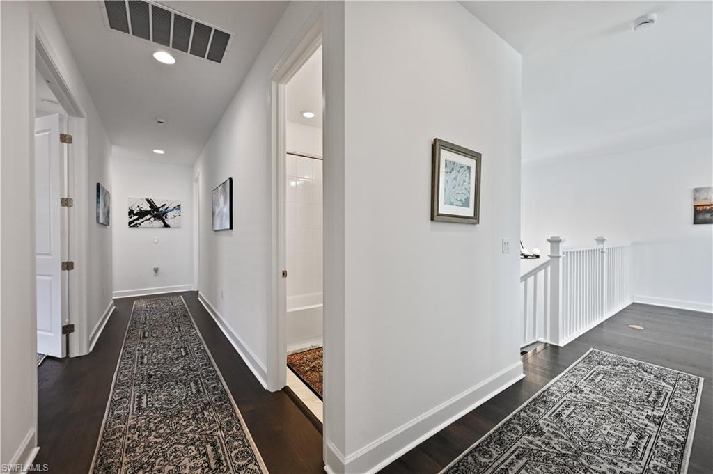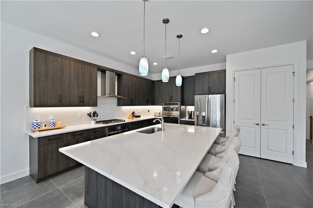 Stunning Olympia Home with Upgraded Glass Tile Pool & Spa – Premier Preserve Views in Rivercreek, Estero. Step into your tropical paradise in this immaculate Olympia floor plan on a premium lot overlooking a tranquil nature preserve. With a rear southern exposure, your upgraded glass tile pool and spa with LED lighting enjoys sun all day with stunning sunsets, making it perfect for relaxing or entertaining. The open-concept first floor features a gourmet chef’s kitchen with GE Profile stainless steel appliances, premium quartz countertops on your extra-large island, and designer flooring. Large sliding doors extend seamlessly to the screened lanai with ambient lighting, your private outdoor oasis. Upstairs, the luxurious primary suite boasts two walk-in closets and a spa-inspired bath, complemented by 3 additional bedrooms upstairs, 1 bedroom downstairs, 5 full baths, a loft, a den, and an upstairs laundry. Enjoy custom lush landscaping, a professionally finished garage with epoxy floors, custom shelving, and designer finishes throughout. Located in Rivercreek Estero, with resort-style amenities only minutes from Miromar Outlets, Coconut Point, Gulf beaches, sports parks, and fine dining. Do not miss out on this rare luxury retreat—truly one-of-a-kind!