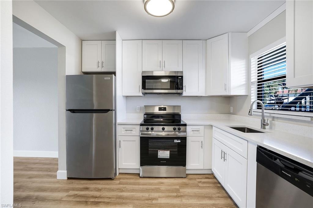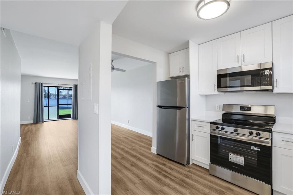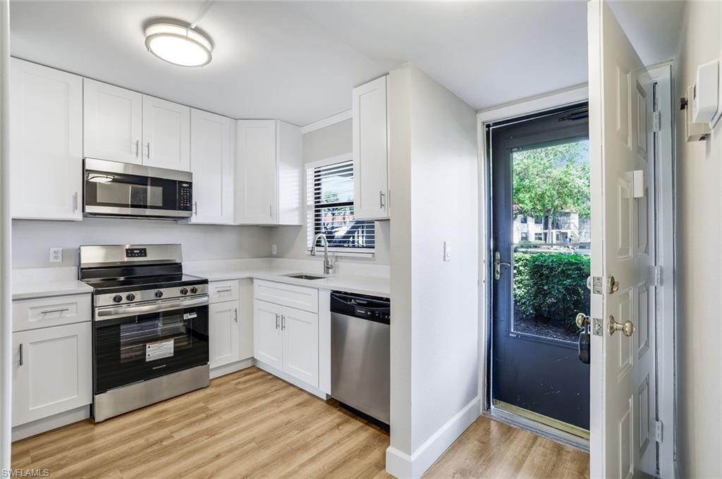 One or more photo(s) has been virtually staged, AI generated or rendered. Step into this newly renovated FIRST FLOOR CORNER CONDO.This 2 bedroom / 2 full bath home is overlooking a golf course that highlights the seamless blend of luxury, serenity, and manicured nature. It is often described as "picturesque as a postcard," where lush green fairways and high-contrast white sand bunkers offer a visually stunning panorama views! This home has it all! New floors, doors, cabinets, quartz counter tops, fixtures, A/C, appliances, hot water heater, NO popcorn ceilings, and new paint. Come and view this amazing unit! This will go quickly, bring your offers! The staging helps understand placement of furniture!