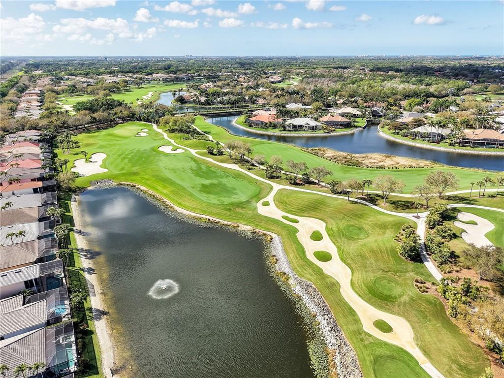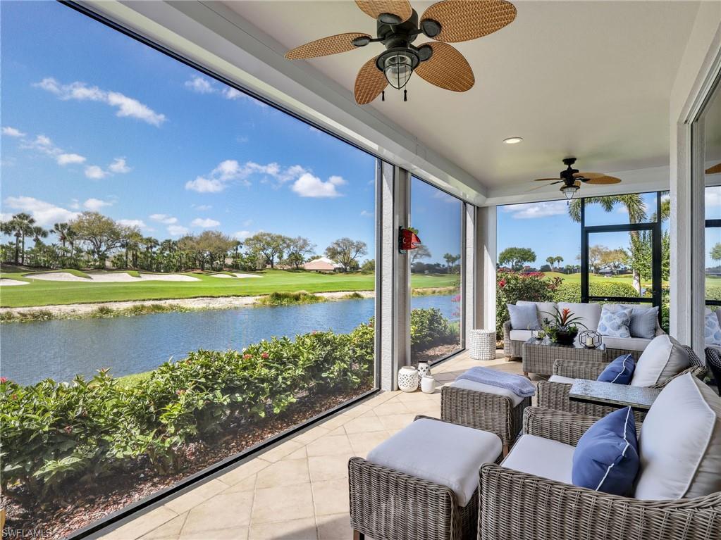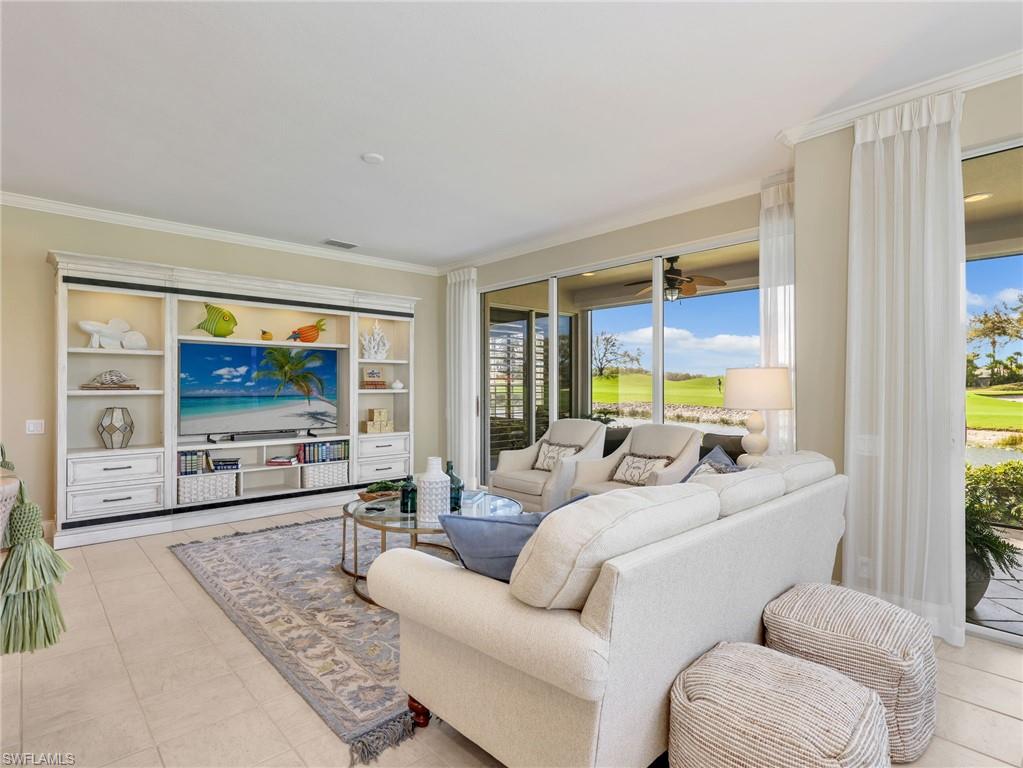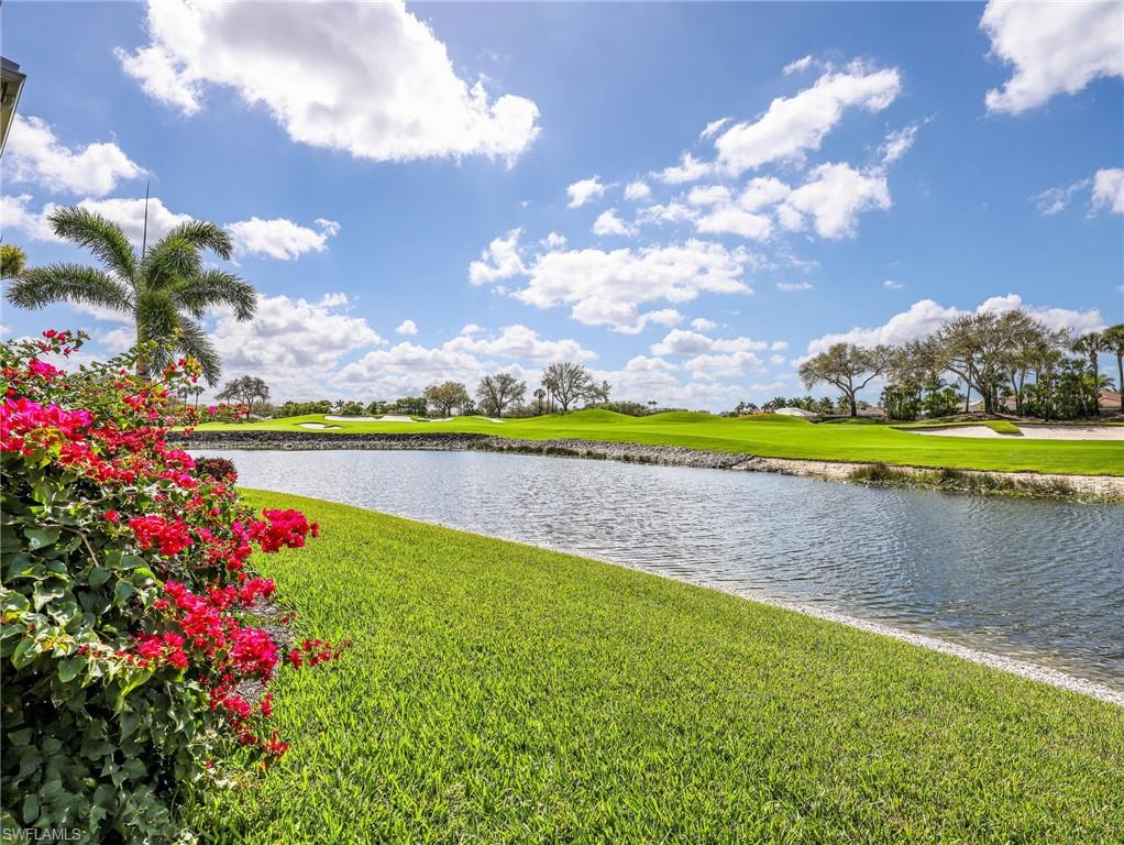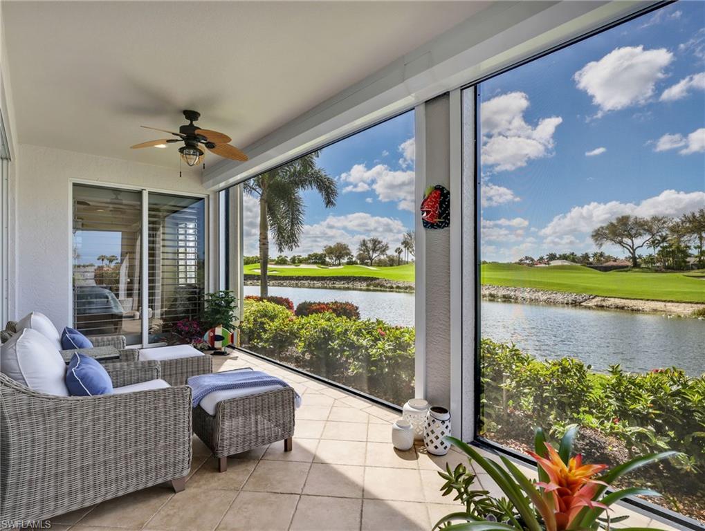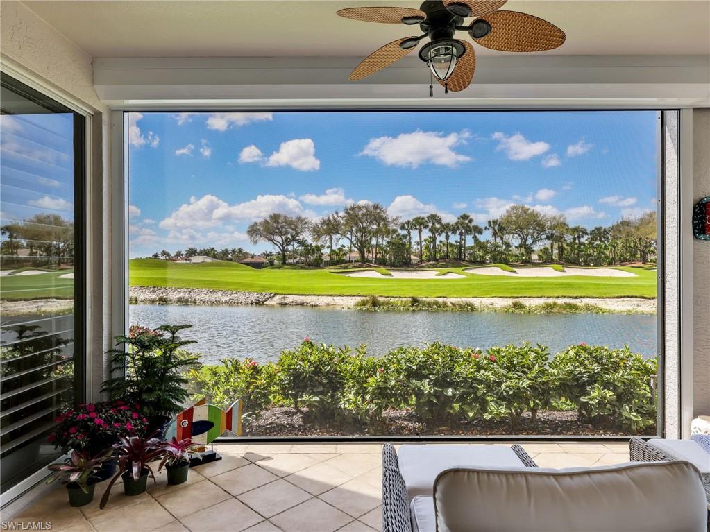 Front-row golf course living awaits in this first-floor 2+den, 2-bath coach home in Hamlet at Kensington, where sweeping lake and fairway views create a stunning backdrop for everyday living. Perfectly positioned with coveted southern exposure, this residence is filled with natural light and picturesque vistas across the greens. Designed for effortless Florida living, the wide-open floor plan allows the kitchen, dining area, and spacious family room to flow seamlessly together and out to the expansive 24-foot covered lanai. Featuring a picture-frame screen enclosure, the lanai provides uninterrupted views and truly feels like front-row seating to the action on the course, making it an ideal setting for morning coffee, sunset cocktails, or simply relaxing while taking in the peaceful surroundings. Inside, the home is bright, airy, and comfortable, with tile flooring throughout the main living areas, plantation shutters, and generously sized bedrooms. The guest bath has been stylishly updated with a new vanity, designer lighting, updated hardware, mirror, and chic wallpaper, adding a fresh, modern touch. The 1.5-car garage provides additional space for a golf cart, perfect for embracing the golf lifestyle Kensington is known for. Located within the desirable Hamlet neighborhood of Kensington Golf & Country Club, residents enjoy optional membership opportunities at this member-owned club featuring an award-winning 18-hole championship golf course, tennis and pickleball complex with lighted courts, state-of-the-art fitness center, and full-service day spa. Ideally situated just minutes from Naples’ renowned Gulf beaches and the upscale shopping and dining of Mercato, this home offers the perfect blend of comfort, views, and location.