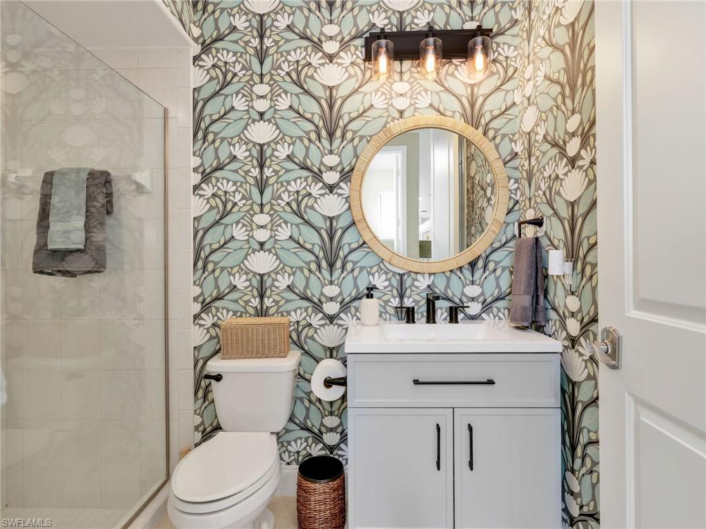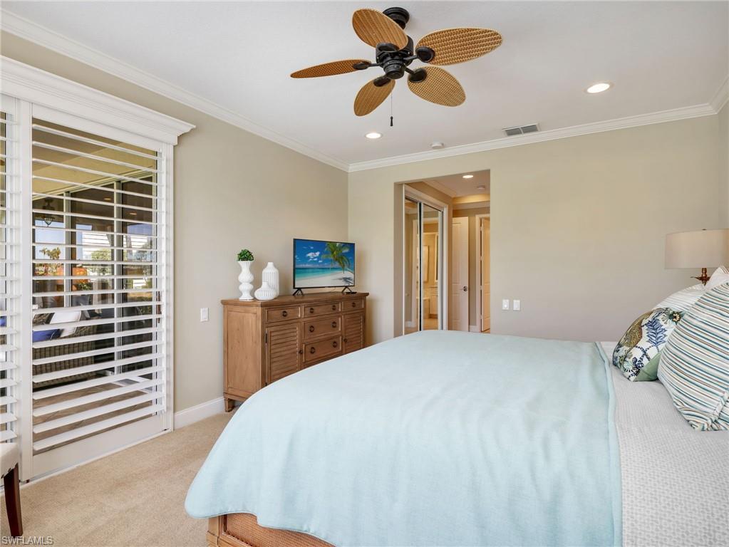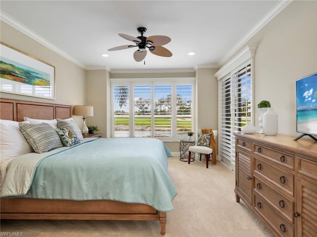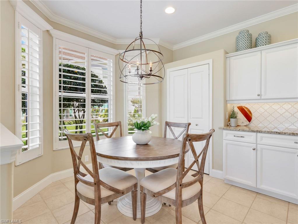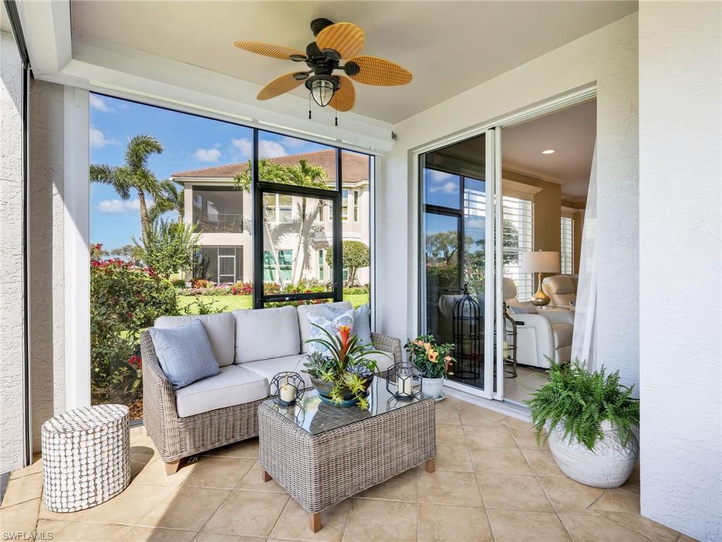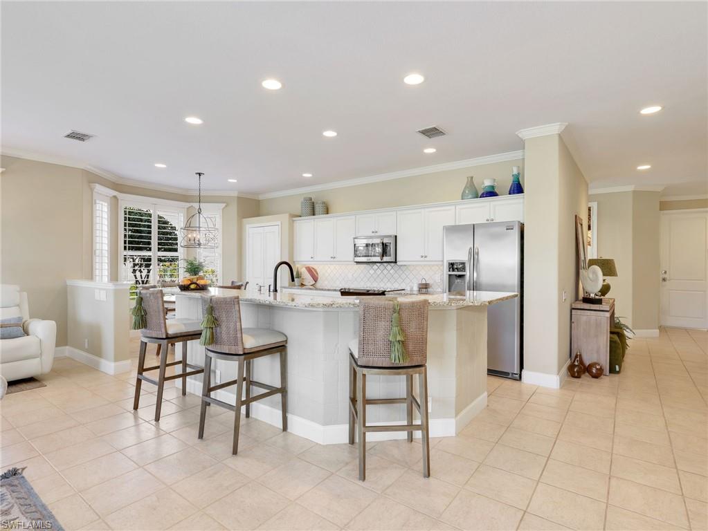 Front-row golf course living awaits in this first-floor 2+den, 2-bath coach home in Hamlet at Kensington, where sweeping lake and fairway views create a stunning backdrop for everyday living. Perfectly positioned with coveted southern exposure, this residence is filled with natural light and picturesque vistas across the greens. Designed for effortless Florida living, the wide-open floor plan allows the kitchen, dining area, and spacious family room to flow seamlessly together and out to the expansive 24-foot covered lanai. Featuring a picture-frame screen enclosure, the lanai provides uninterrupted views and truly feels like front-row seating to the action on the course, making it an ideal setting for morning coffee, sunset cocktails, or simply relaxing while taking in the peaceful surroundings. Inside, the home is bright, airy, and comfortable, with tile flooring throughout the main living areas, plantation shutters, and generously sized bedrooms. The guest bath has been stylishly updated with a new vanity, designer lighting, updated hardware, mirror, and chic wallpaper, adding a fresh, modern touch. The 1.5-car garage provides additional space for a golf cart, perfect for embracing the golf lifestyle Kensington is known for. Located within the desirable Hamlet neighborhood of Kensington Golf & Country Club, residents enjoy optional membership opportunities at this member-owned club featuring an award-winning 18-hole championship golf course, tennis and pickleball complex with lighted courts, state-of-the-art fitness center, and full-service day spa. Ideally situated just minutes from Naples’ renowned Gulf beaches and the upscale shopping and dining of Mercato, this home offers the perfect blend of comfort, views, and location.