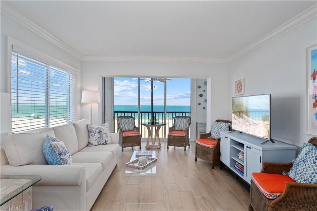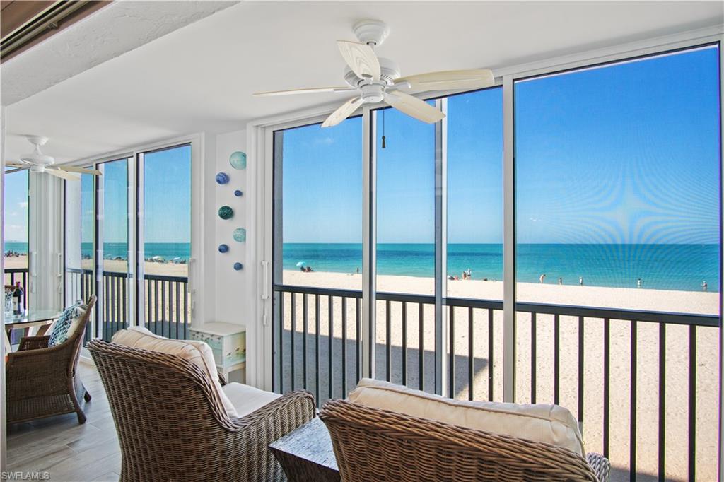 Beautifully renovated, coastal contemporary beachfront condo in Casa Bonita Grande on the peaceful north end of Bonita Beach. With breathtaking views of the turquoise waters and pristine white sands, this 2 bedroom, 2 bathroom condo is the perfect coastal retreat. This unit features a coveted second floor location with an exceptional view of the surf and the pool. Completely updated, this residence boasts brand-new fresh interior paint, freshly painted kitchen cabinetry, beautiful marble countertops, wood-look tile flooring, new hurricane-impact sliders, a new HVAC system (2021), and a new water heater (2023). The enclosed air-conditioned lanai is an entertainer’s dream, offering the option to open the glass sliders and enjoy the sound of the surf. The beautifully remodeled chef’s kitchen is complete with crisp white cabinetry and new GE stainless steel appliances (2021). Additional features include a designated covered parking space, ample guest parking, and convenient access to the second floor sundeck with a gas grill and spacious seating areas - perfect for relaxation or entertaining. Casa Bonita Grande maintains a funded capital reserve and a stable financial standing and offers resort-style amenities, including a beachside pool, community room, a fitness center and more.