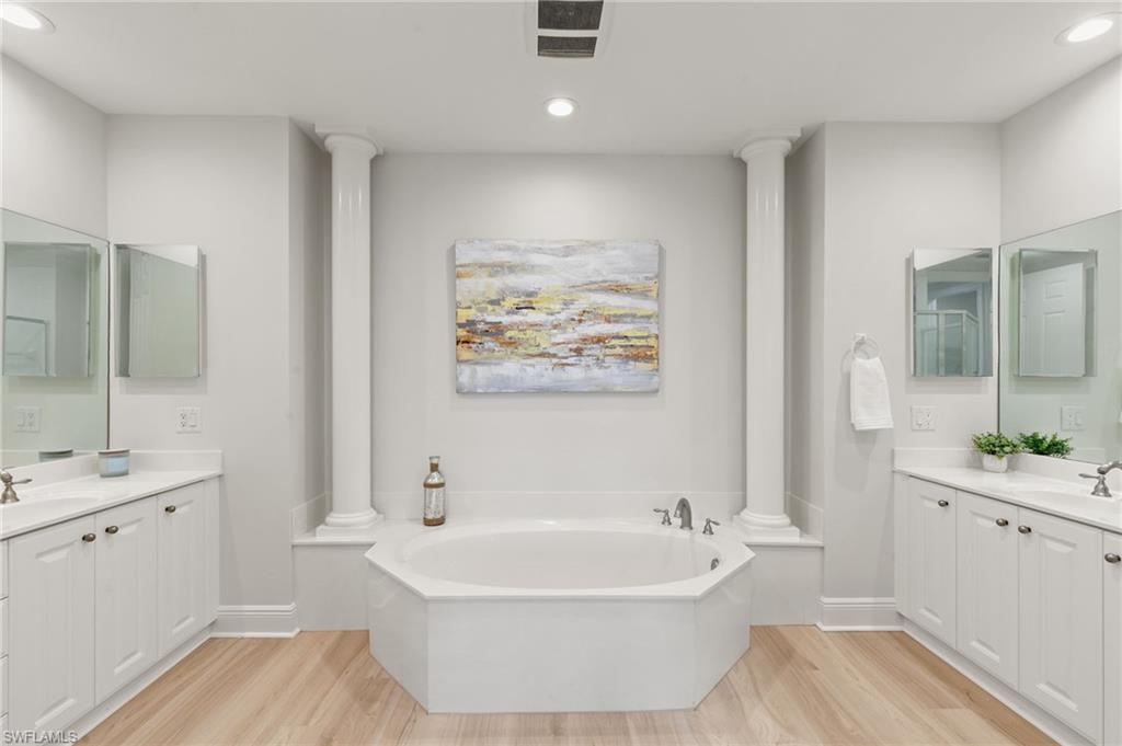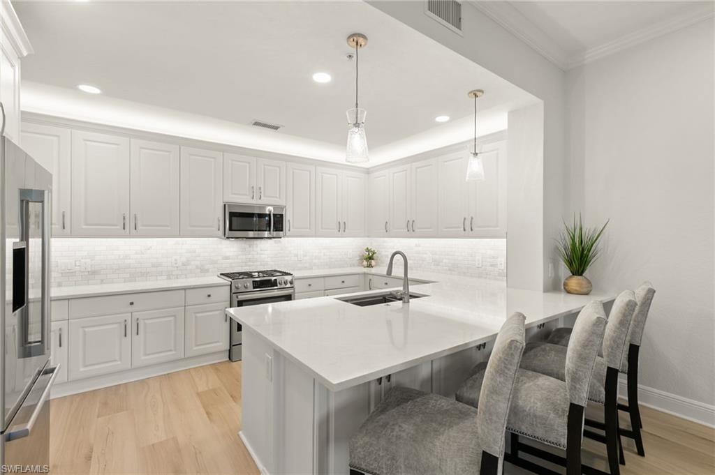 Enjoy stunning wide water views from this beautifully maintained and tastefully furnished 3 bed/3 bath coach home. The beautifully renovated kitchen features chic white cabinetry, white quartz countertops, and stainless steel appliances, creating a bright and modern space for everyday living and entertaining. The space has been further enhanced with the removal of the wall that once separated the great room from the family room, allowing light to pour into the kitchen and family room from the lanai. The wood-look luxury vinyl flooring flows throughout the home, adding warmth and durability. Additional recessed lighting and updated fixtures add a touch of sophistication. The spacious primary suite offers a comfortable retreat with walk-in closets and a well-appointed bathroom featuring dual vanities, a soaking tub, and a separate shower. From the great room or primary suite, step through the sliders and onto your expansive lanai which offers a peaceful setting to unwind while taking in the scenic long-water views. The spacious two garage also features an epoxied floor. The award-winning, resort style community of Fiddler's Creek is enhanced by a club and spa, fitness center, swimming pools, two golf courses, tennis courts, pickleball courts, a bocce court, fine and casual dining, social activities, and miles of biking and walking paths. Optional beach club and marina memberships are available. Experience the epitome of luxury living, where every detail is thoughtfully curated to complement your lifestyle.