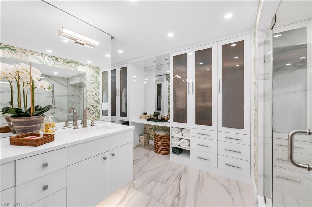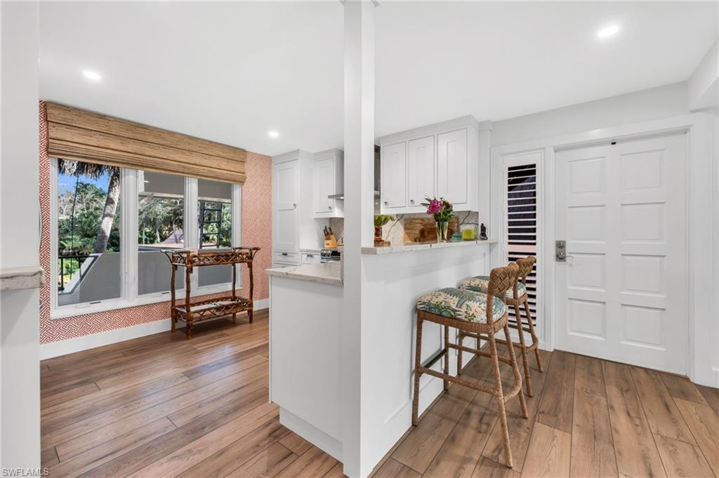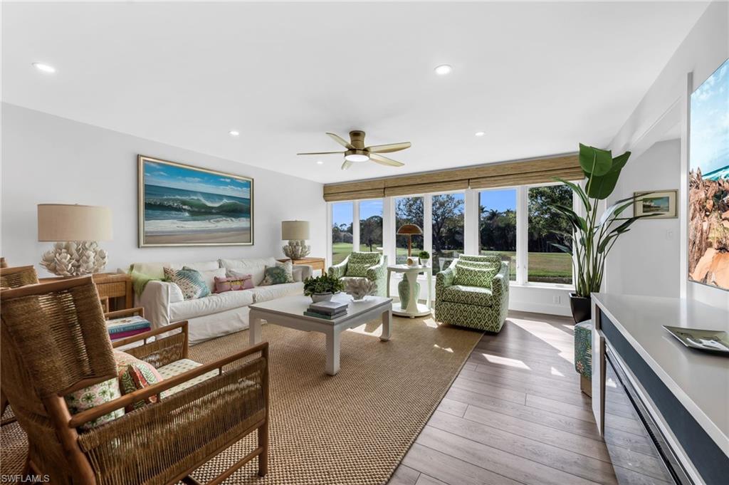 Discover the pinnacle of comfortable living in this rare second-floor 2-bedroom, 2-bathroom residence—one of only 12 units in Wilderness featuring this exclusive floor plan! Perfectly positioned with breathtaking lake-to-golf course views overlooking the 18th hole and the brand-new clubhouse, this unit offers an unbeatable location within the community. Step inside to an open, airy layout, where a wall of floor-to-ceiling windows in the enclosed Florida room seamlessly brings the outdoors in. This beautifully renovated unit features fresh paint and stunning wallpaper, and showcases a gourmet kitchen fully upgraded with quartz countertops, a stunning backsplash, custom white cabinetry with new (Notting Hill) knobs, stainless steel appliances, and a new dining room fixture. The master suite is a true retreat, with dual sinks, custom built-in cabinetry, and an oversized shower with seamless doors. Feel safe and secure with impact windows and doors, or for added privacy, new Hunter Douglas blinds with automated controllers. Residents will also enjoy access to the newly constructed, state-of-the-art 5 Star Clubhouse and practice facility, making this property the ultimate haven for golf enthusiasts. Located in an elevator building, steps away from the pool. Golf cart and cart garage with epoxy floor and cabinets for storage are included and located adjacent to your assigned covered car parking. This gated paradise is set within a 200-acre forest with stunning landscaping and mature trees overhanging roadways. It offers unlimited golf on an 18-hole Arthur Hills course, 5 pools, 4 tennis courts, bocce, croquet, and a dog park. It’s located just minutes away from charming shopping and dining at 5th Avenue and Old Naples. Purchase of a Wilderness Country Club membership is required and immediately available.