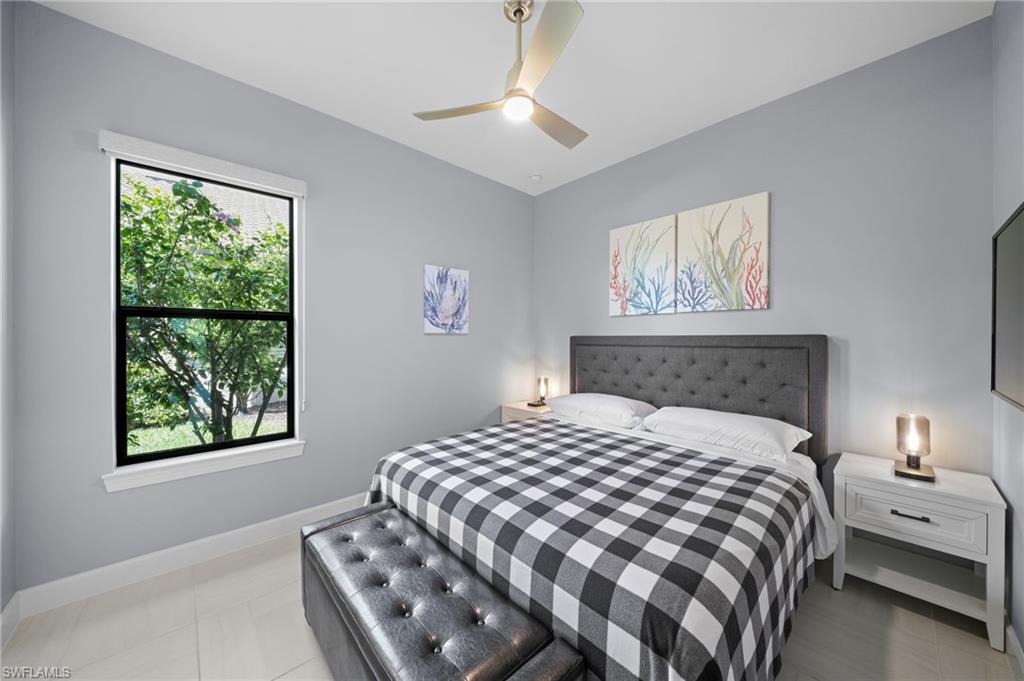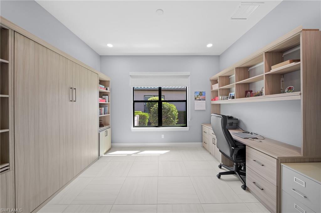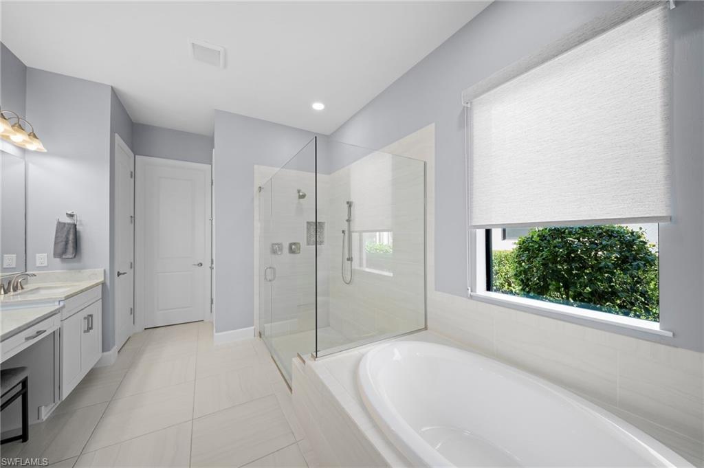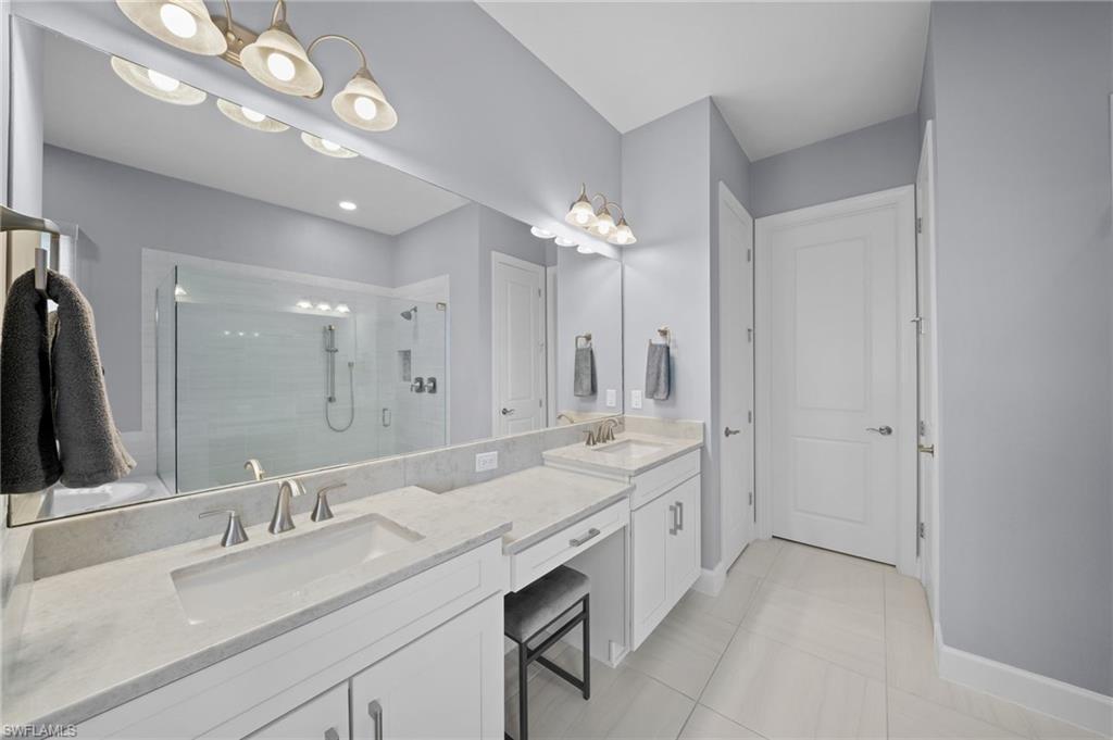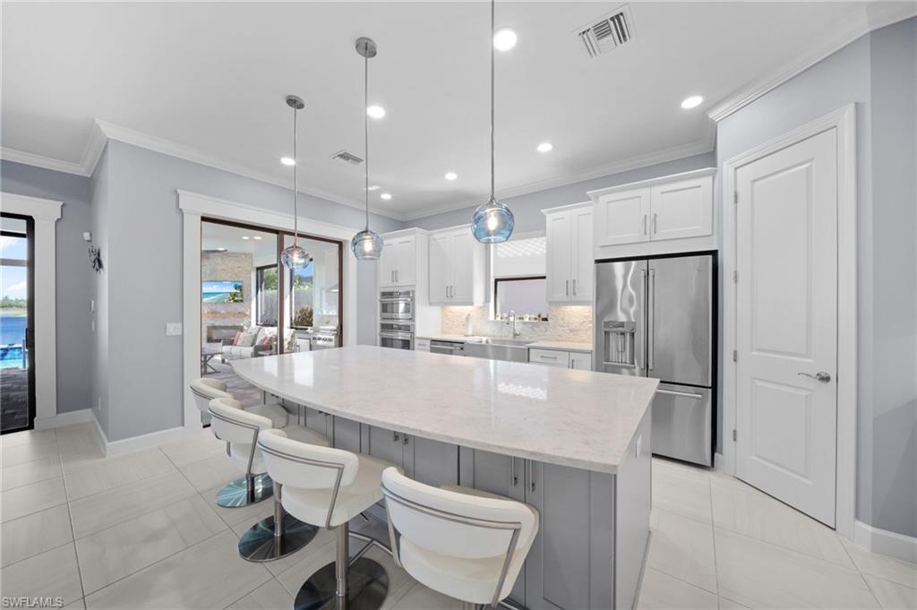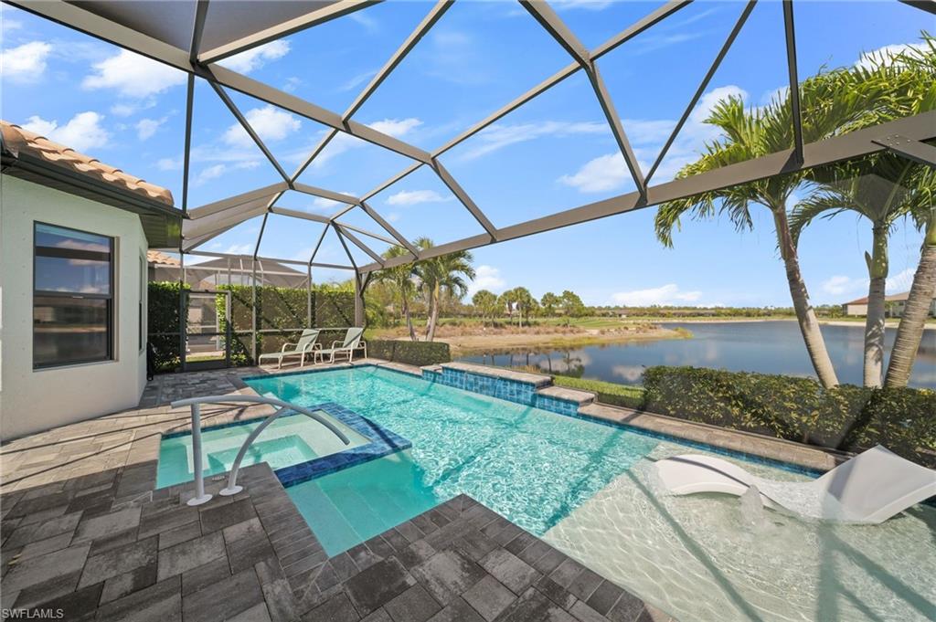 LIVE A VACATION LIFESTYLE IN ESPLANADE! FULL GOLF MEMBERSHIP INCLUDED! This immaculate and well appointed “Lazio” is situated on a premium lot with sweeping views of the lake and 16th fairway. Inside, you will find an open great room floorplan featuring 3 bedrooms + Den, 3 full baths, and just over 2300 sq ft under air. From the moment you walk in the door, you are greeted with oversized 24”x24” porcelain tile floors that flow throughout the entire house. Two sets of sliding glass doors lead to the extended lanai complete with outdoor kitchen and stone accent wall with electric fireplace , which is all enclosed by motorized roll down hurricane screens. Catch some sun around the GAS heated pool with sunken spa and sun shelf. The kitchen is the heart of the home and features shaker style cabinetry, Cambria quartz countertops, and GE Cafe stainless steel appliances including a GAS cooktop & wall ovens. The impressive custom great room feature wall includes custom cabinets, oversized porcelain slab accent detail, custom mirrors, and LED accent lighting. The dry bar includes a wine cooler and bottle/glass storage. Other fine appointments include: expanded primary bedroom & front guest bedroom bay windows; luxurious baths with walk in showers with frames shower enclosures; finished epoxy garage floor; crown molding & custom millwork details; spacious Laundry Room with cabinetry; freshly painted interior and exterior; tankless GAS hot water heater; 8' doors/10' ceilings; and more! Esplanade Golf & Country Club of North Naples offers a true “Lifestyle Community” with world-class amenities, including a resort pool with cabanas and the popular “Bahama Bar,” tennis, pickleball, bocce, a 14-mile network of bike/walking trails, and an 18-hole private golf course. The impressive 15,000 Sq Ft clubhouse features a restaurant, bar, wine-tasting room, wine lockers, and a Starbucks-style café. Best of all, the property’s landscaping, irrigation, golf membership, and all community amenities are covered under a quarterly fee of just $3,743—no additional fees or memberships required! Don't miss your opportunity to own this exceptional home in one of Naples’ most sought-after communities. Schedule your tour of this stunning home and Esplanade Golf & Country Club today! COMING SOON TO ESPLANADE (2026): Fully renovated and expanded poolside Bahama Bar; expanded outdoor bar at the Barrel House; expanded golf practice range; and an AIR CONDITIONED INDOOR PICKLEBALL COMPLEX with four indoor courts.
