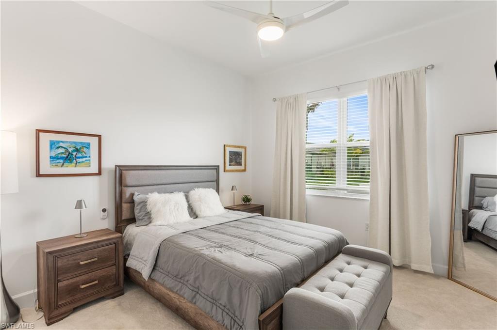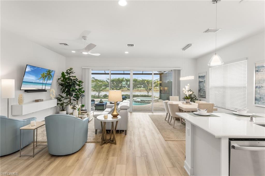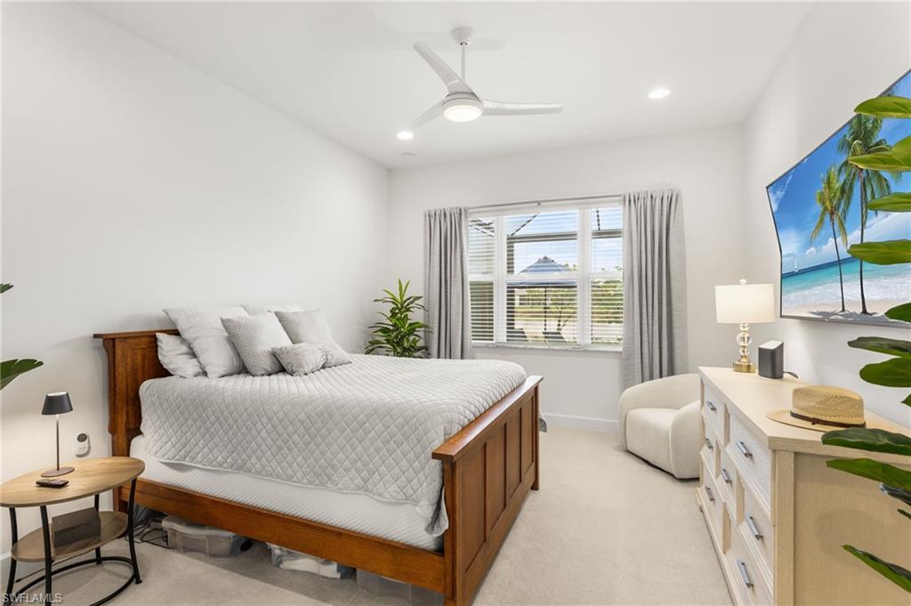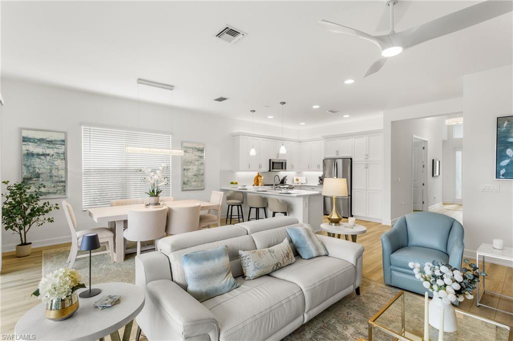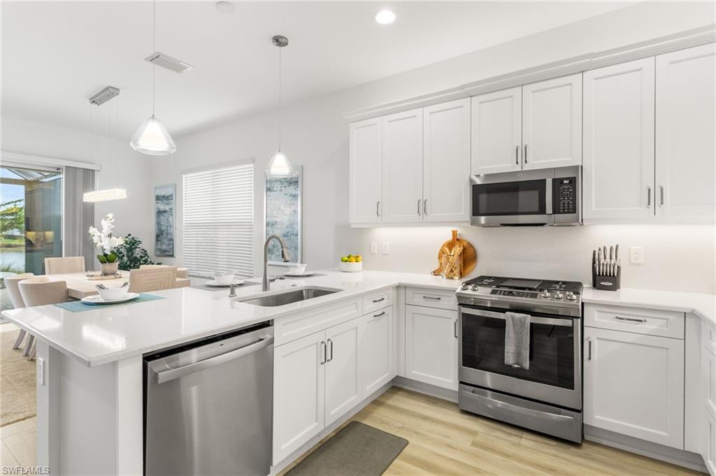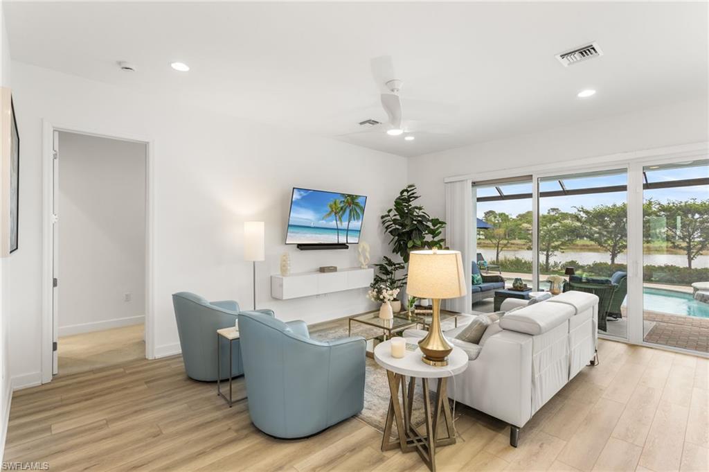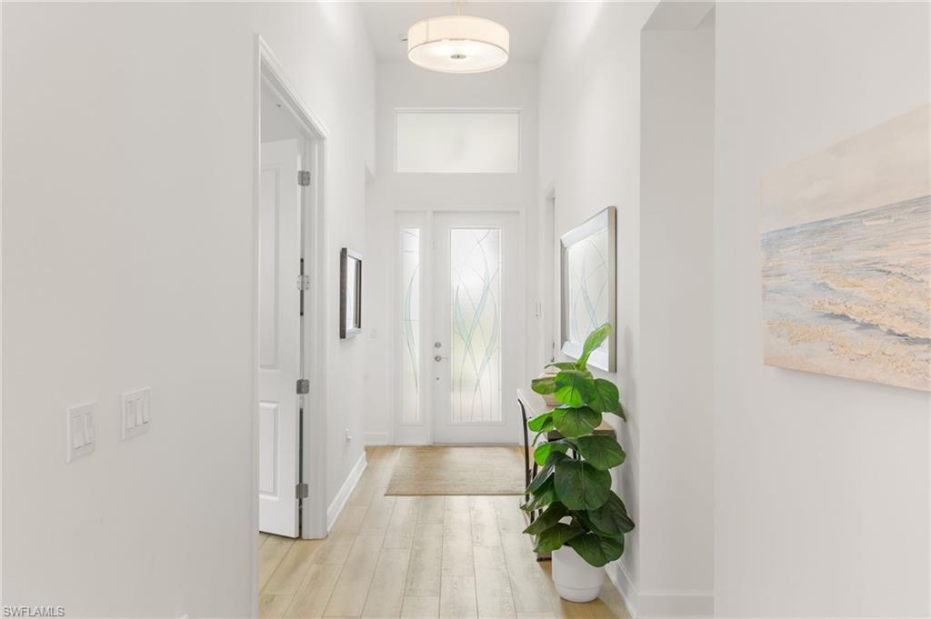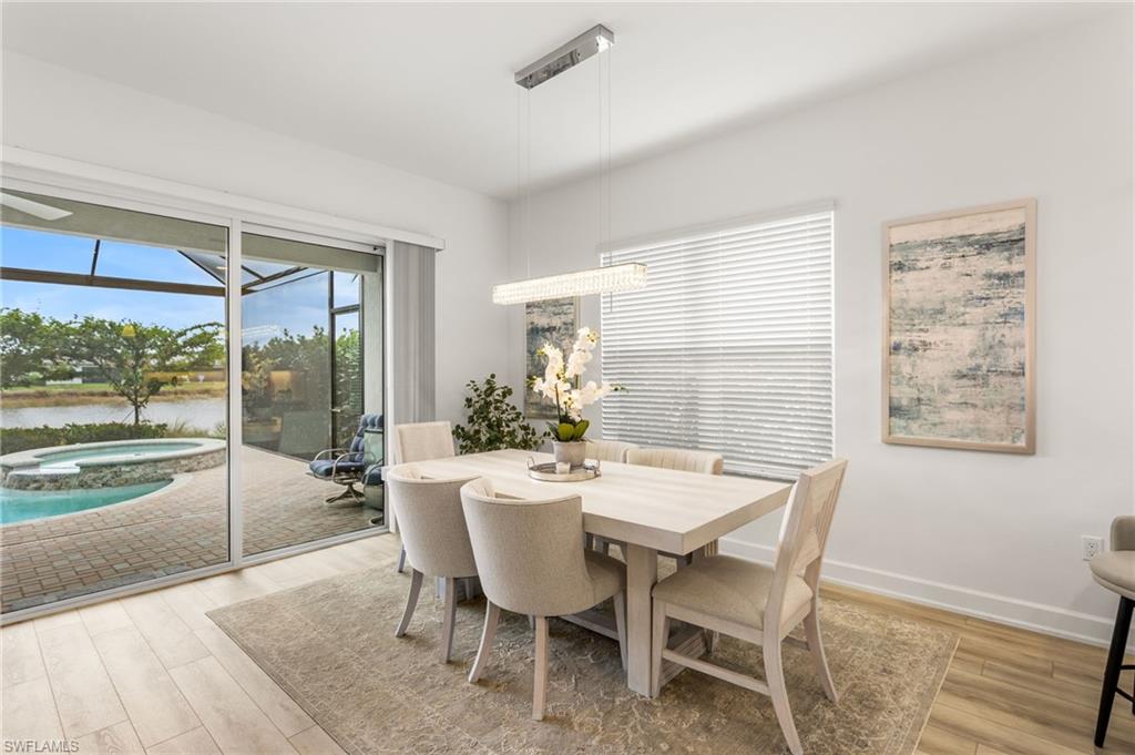 Welcome to this upgraded Pelican model, a residence that redefines luxury living with sophistication. The experience begins the moment you enter through the 14-foot foyer, where the soaring ceiling height and expansive sight lines immediately set a tone. Step into the heart of the home, an impressive chef’s kitchen crafted for both culinary inspiration and effortless entertaining. Here, sleek quartz countertops extend into a fully integrated matching backsplash, creating a clean, cohesive aesthetic. Premium stainless-steel appliances—including a natural-gas range- and soft-close cabinetry with refined molding exemplify thoughtful design. Soft ambient lighting from pendants and recessed LEDs casts a warm, inviting glow. As the main living area flows gracefully toward the outdoors, sliding impact glass doors draw your eye to the home’s outdoor oasis. Step outside to find a heated pool and spa, enveloped by a panoramic no-see-um screen enclosure that allows uninterrupted views of the lake. Inside, the elevated upgrades continue with premium flooring that flows harmoniously throughout the main areas, and cozy carpeting in the bedrooms ensures both style and comfort, enhancing the home’s sophisticated appeal. Impact-resistant windows and doors offer peace of mind and energy efficiency. Beyond the home itself, Valencia Trails elevates the lifestyle even further with active, social, and wellness-focused living. The impressive 43,000-square-foot clubhouse serves as the centerpiece of the community, offering a full-service restaurant and bar, a state-of-the-art fitness facility, a luxurious salon and spa, card and game rooms, art studios, and a fully appointed demonstration kitchen. Outdoors, residents enjoy a resort-style pool, lap and resistance pools, six tennis courts, eight pickleball courts, and miles of beautifully landscaped walking and biking trails. Even four-legged residents are thoughtfully accommodated with two private dog parks. Opportunities to own a home of this caliber—combining privacy, premium upgrades, and an outstanding location, within one of Naples’ most vibrant and prestigious 55+ communities.