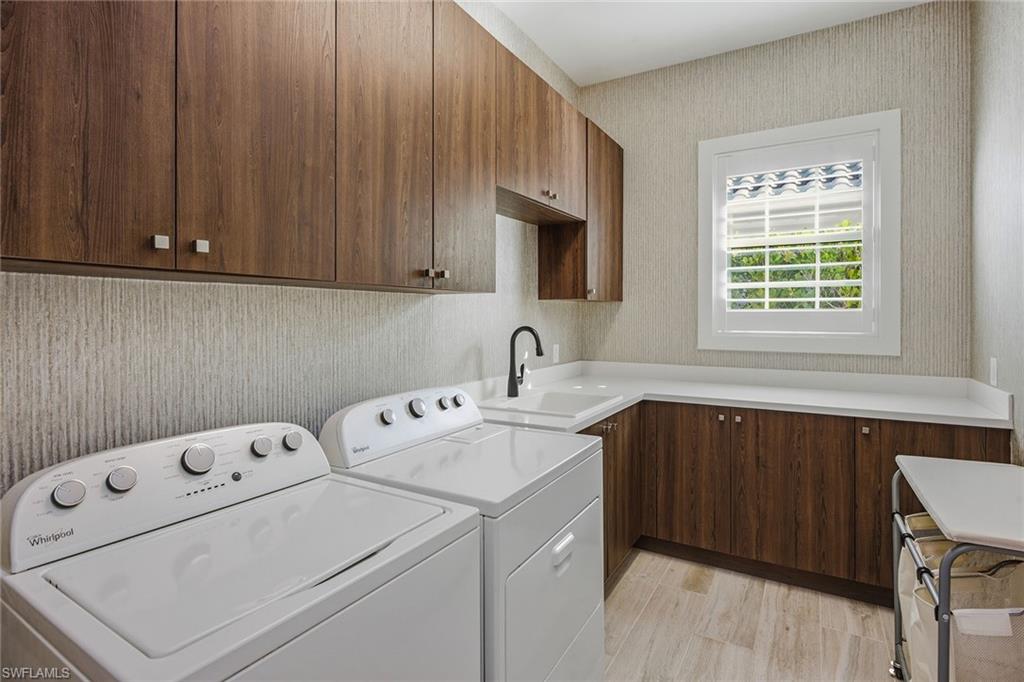 Surrounded by lush tropical landscaping on a nearly half-acre home site, this stunning designer-furnished residence in the desirable Marsh Cove village of Fiddler’s Creek offers exceptional privacy, desired southern exposure and luxury indoor-outdoor living at its finest. Built in 2018 and showcasing the sought-after Pontevedra open floor plan, the home offers four bedrooms plus a den, five baths and nearly 3,600 square feet of thoughtfully designed living space, complemented by a spacious three-car garage and expansive outdoor living areas. From the moment you enter through metal and glass French doors with a transom window, refined finishes and architectural details set the tone, including wood-look porcelain plank tile flooring throughout, volume and vaulted ceilings, recessed LED lighting and plantation shutters. Designed to capture natural light and seamless flow to the outdoors, the main living areas open to a spectacular private lanai retreat framed by mature tropical landscaping and a large backyard. The outdoor living area features natural stone pavers, a heated pool and spa with spillover, decorative fire bowls and fountain, and a picture-frame pool cage maximizing tranquil garden views. Two covered lanai spaces provide inviting areas for relaxing or entertaining and are enhanced by a gas fireplace and lighted pool cage columns, while the summer kitchen includes a stainless gas grill, cooktop and under-counter refrigerator. Additional outdoor features include a poolside bath, electric storm shutters enclosing both lanai areas, and with impact glass throughout. The chef’s kitchen is beautifully appointed with quartz counters, natural stone tile backsplash, center island, white cabinetry with under-cabinet lighting and pullout pantry shelving, and premium appliances including a six-burner natural gas range with griddle. The dining area features custom built-in cabinetry with accent lighting and views of the pool and lanai, while the spacious living area offers a built-in entertainment center, dry bar with under-counter wine refrigerator and sliding glass doors opening to the outdoor living space. The private primary suite includes a sitting area, plantation shutters and direct lanai access, while the luxurious bath offers dual quartz vanities, a freestanding soaking tub, frameless glass walk-in shower with dual shower heads and a large custom walk-in closet. Guest accommodations include two bedrooms connected by a Jack-and-Jill bath and a separate guest suite with en-suite bath and walk-in closet, while the den with built-in desks and cabinetry provides an ideal home office. Additional highlights include a custom wine bar with two wine refrigerators, tankless water heater and a three-car garage with epoxy flooring and built-in storage. Residents enjoy Fiddler’s Creek’s resort-style amenities including pools, dining, tennis, fitness, pickleball and spa services with optional memberships available for golf, marina and beach club access.