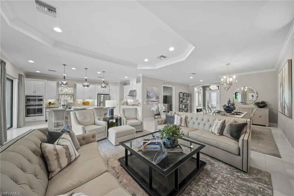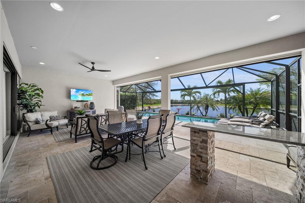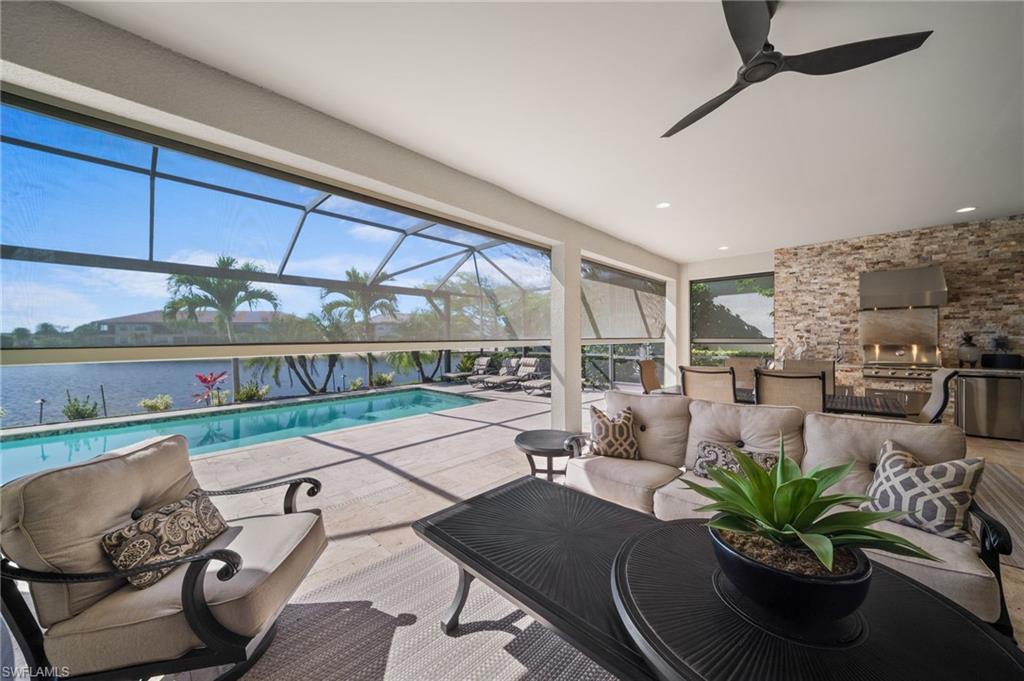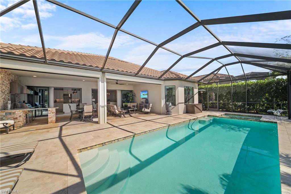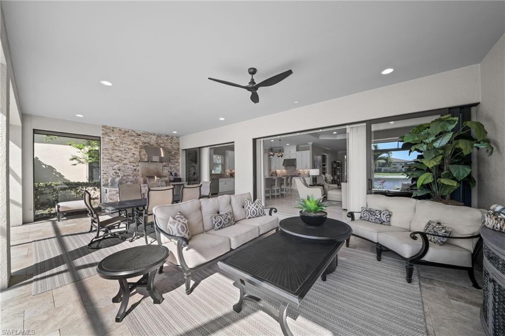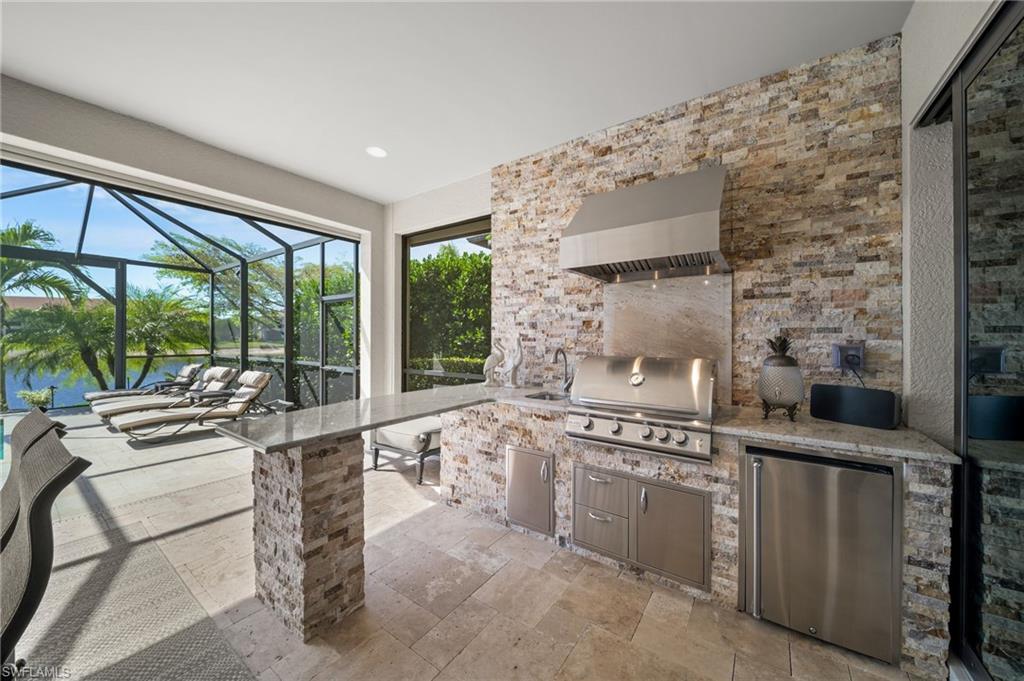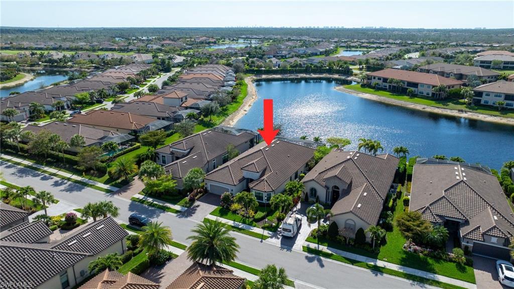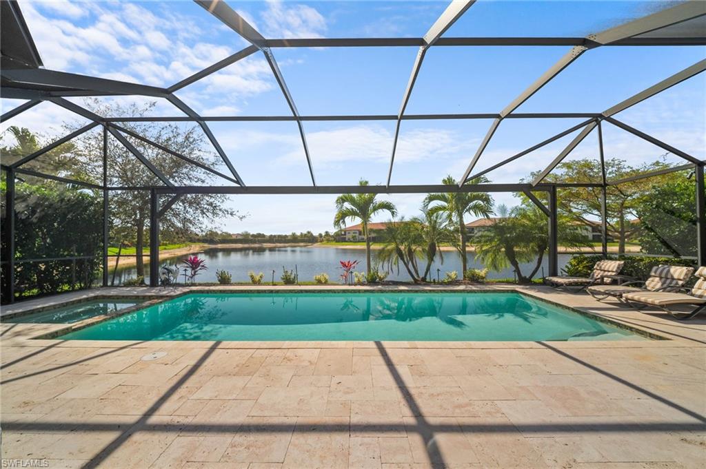 LIVE A VACATION LIFESTYLE IN ESPLANADE! FULL GOLF MEMBERSHIP INCLUDED! Opportunity is knocking! This rarely available 4 BEDROOM+DEN, 3 full bath “Palazzio” offers 3,180 sq ft under air and is situated a premium lakefront lot with long water views and rear west facing exposure. From the moment you step inside this elegant home you are greeted with oversized 24”x24” porcelain tile floors that flow throughout the common areas and oversized den. Oversized rooms and an open concept floorplan including two sets of pocketing sliding glass doors to the lanai is what makes this home so special. Enjoy al fresco dining and entertaining family & friends on the extended covered lanai complete with outdoor kitchen and salt water GAS heated pool/spa with travertine marble deck. A long list of luxury finishes include: HURRICANE IMPACT GLASS WINDOWS/DOORS; motorized roll down hurricane screens on the lanai; impact glass double front doors with matching sidelights; extended 2 car garage (23’x24’); custom great room feature wall with LED fireplace; expanded primary & front guest bedrooms with bay windows; luxurious baths with raised panel cabinetry, quartz countertops, and wallpaper detail; special order lights/chandeliers; custom master closet cabinets; crown molding & plantation shutters throughout; recessed lights in every room; spacious Laundry Room with cabinetry; tankless GAS hot water heater; extensive landscaping with landscaping lighting; NEW gas pool heater & automation system; and more! Esplanade Golf & Country Club of North Naples offers a true “Lifestyle Community” with world-class amenities, including a resort pool with cabanas and the popular “Bahama Bar,” tennis, pickleball, bocce, a 14-mile network of bike/walking trails, and an 18-hole private golf course. The impressive 15,000 Sq Ft clubhouse features a restaurant, bar, wine-tasting room, wine lockers, and a Starbucks-style café. Best of all, the property’s landscaping, irrigation, golf membership, and all community amenities are covered under a quarterly fee of just $3,768—no additional fees or memberships required! Don't miss your opportunity to own this exceptional home in one of Naples’ most sought-after communities. Schedule your tour of this stunning home and Esplanade Golf & Country Club today! NON FLOOD ZONE/NO FLOOD INSURANCE REQUIRED/ZONE X!