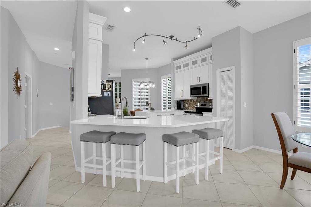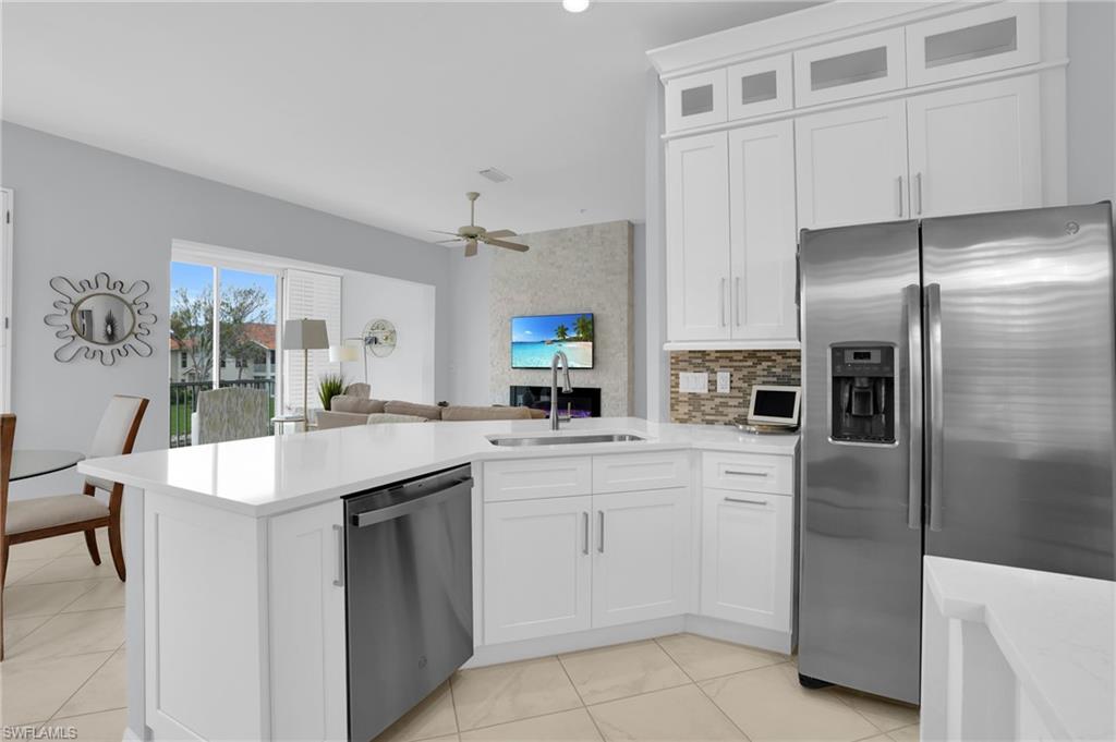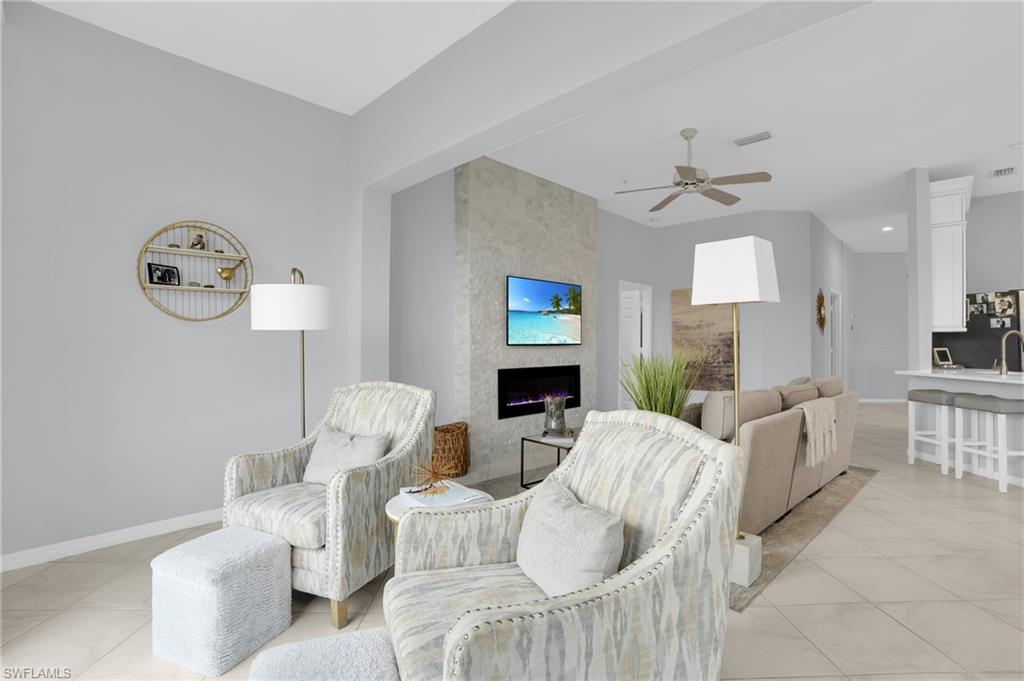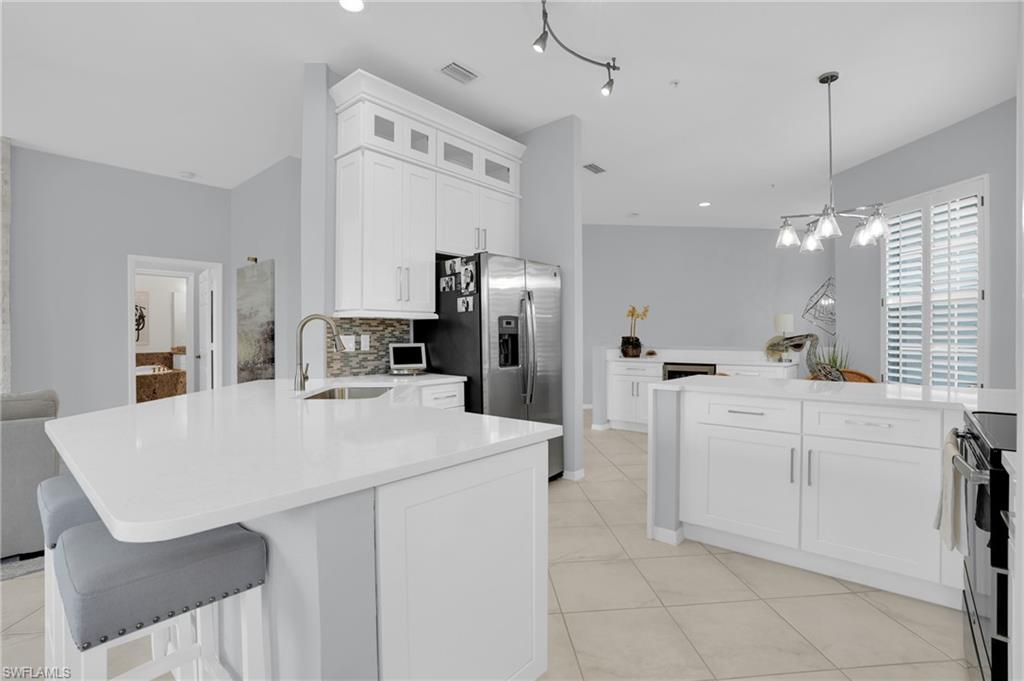 Enjoy the comfort and privacy of single-family style living in this beautifully updated 3-bedroom, 2-bath condominium in the highly desirable Egrets Walk community of Pelican Marsh. Featuring its own private entrance and an attached one-car garage, this residence lives like a single-family home while offering the convenience of maintenance-free living. A welcoming staircase leads to the spacious second-floor main living area where you’ll find an open, light-filled floor plan enhanced by beautiful wood flooring, plantation shutters, and tranquil lake views. The updated kitchen showcases modern white cabinetry, solid surface countertops, quality appliances, and a built-in wine cooler, making it perfect for both everyday living and entertaining. The generous primary suite and guest bedrooms provide comfort and privacy, while the screened lanai offers a peaceful setting to relax and enjoy views of the lake and local wildlife, including visiting egrets. Egrets Walk is known for its lush tropical landscaping and three scenic lakes, and is the only neighborhood within Pelican Marsh offering two saltwater pools, a clubhouse with spa, fitness center, and sauna. Pelican Marsh residents also enjoy a prime North Naples location just minutes to the Gulf beaches and adjacent to the upscale shopping, dining, and entertainment of Mercato. Optional membership to Pelican Marsh Golf Club is available for those seeking an enhanced country club lifestyle. This is the perfect opportunity to enjoy the Naples lifestyle in one of the area’s most sought-after gated communities. EGRETS has its own pedestrian gate access to Mercato