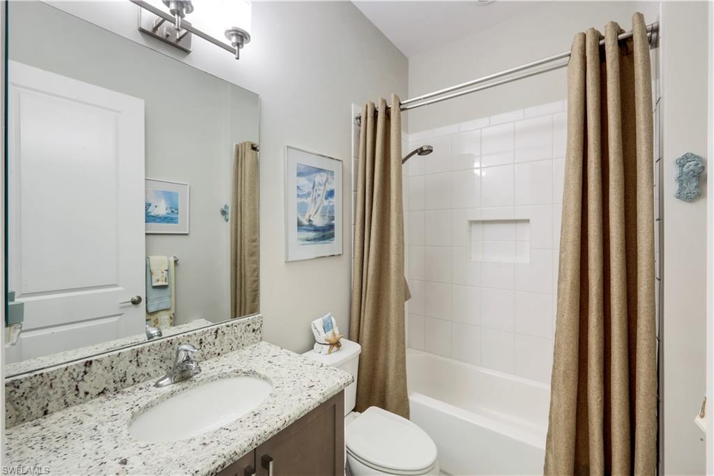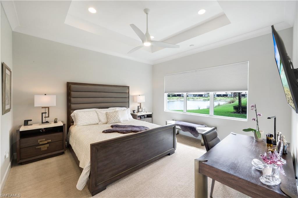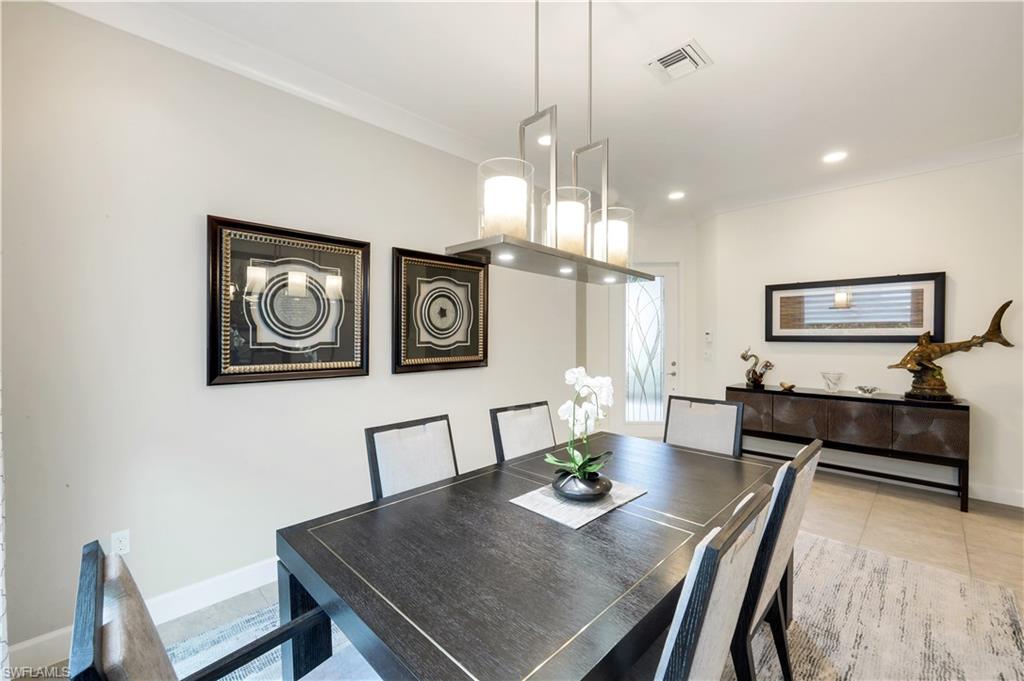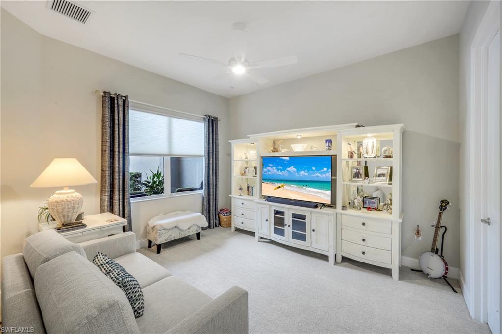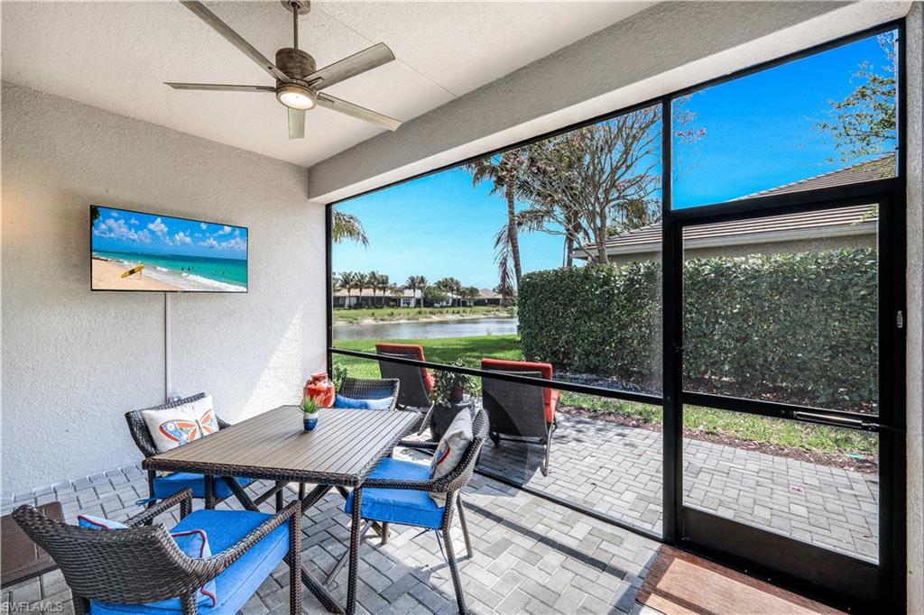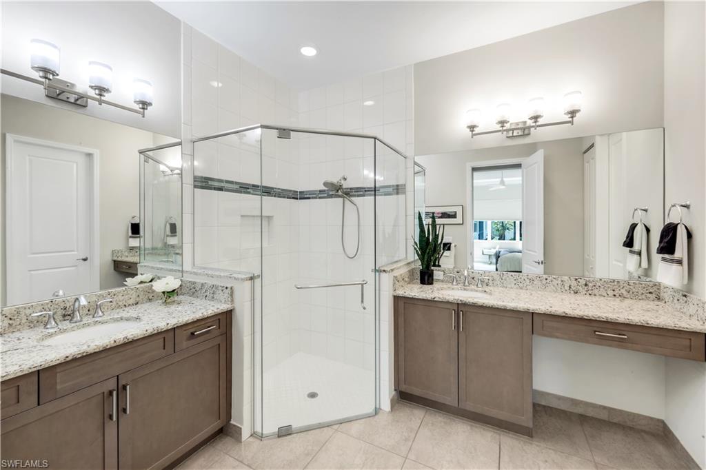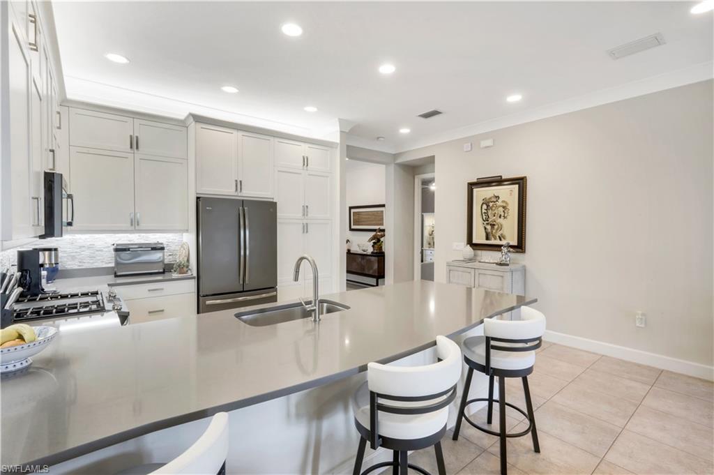 The Brighton floor plan is an attached Villa that offers a private front entry and a spacious open layout with 3 Bedrooms and 3 FULL BATHROOMS along with a 2 car garage. The bright white kitchen features quartz countertops, single bowl stainless steel undermount sink, white shaker style raised panel wood cabinets with builder upgrade upper cabinet boxes, pull outs in kitchen cabinets and pantry, GE builder upgraded slate appliances which includes French door refrigerator, dishwasher, slide in 30” 4 burner with griddle natural gas range, microwave / convection vented outside, large built in cabinet pantry, above & below cabinet lighting with light valence and molding. 5 1/4 “ crown molding found in main living areas along with the primary bedroom. 20” X 20” tiled floors throughout the main living space and plush Berber carpet in the bedrooms . The owner installed a fantastic light fixture package along with ceiling fans. The bathrooms come with large floor tile that includes large wall tile at the bathtub and shower enclosures along with granite countertops and luxury height toilets. There is epoxy coating on the garage floor. Other additions through the builder were upgraded recessed lighting package, IMPACT WINDOWS , tankless hot water heater , decorative glass front entry door and an extended paver patio. Step outside onto your covered paver patio with the additional patio deck where this space provides ample room to entertain or just relax with the opportunity to see a beautiful lake view. All of this is located within Valencia Bonita, a vibrant 55+ community offering unmatched amenities including a spectacular clubhouse, resort-style pools, state-of-the-art fitness center, pickleball and tennis courts, walking trails, full-service salon, restaurant and outdoor bar, and an active calendar of social events and clubs. Don’t miss your chance to own this impeccably upgraded villa. Schedule your private tour today and experience the best of Southwest Florida living.