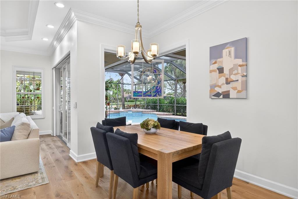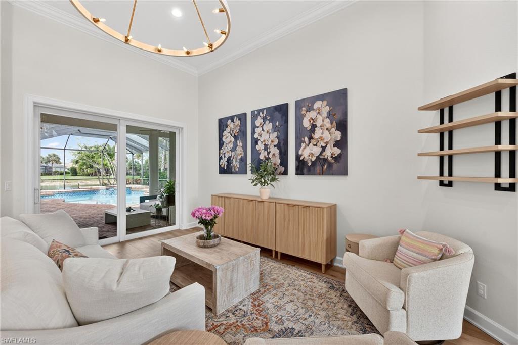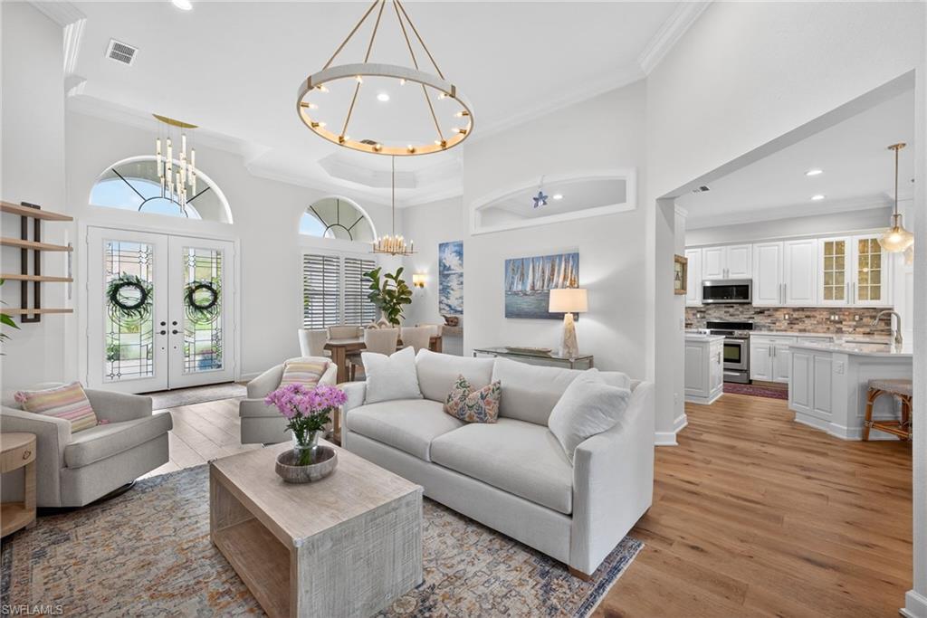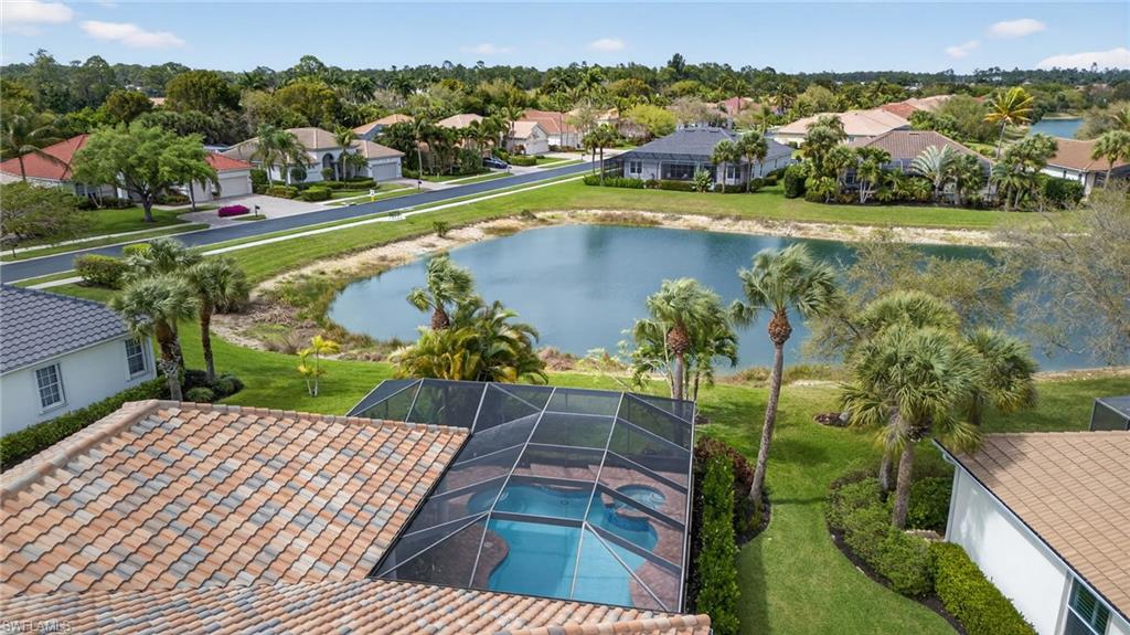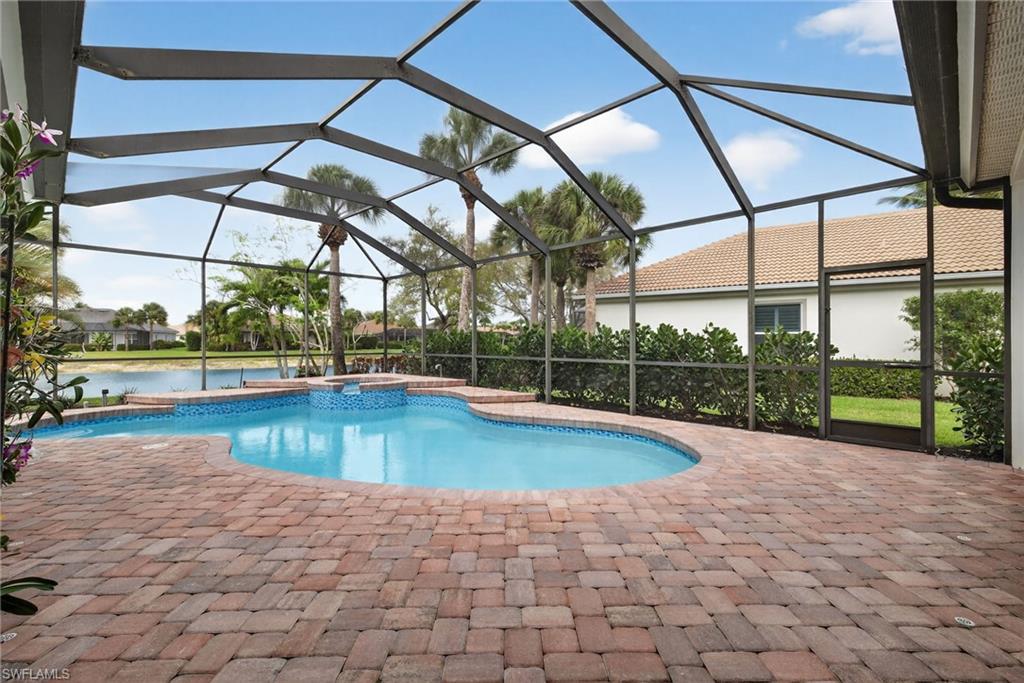 Welcome to Delasol - Where Naples Living Feels Like Home! Nestled within one of North Naples' most sought-after gated communities, this beautifully updated 4-bedroom, 3-bathroom home offers the perfect blend of refined comfort and relaxed Florida living. Sitting on one of the largest lots in Delasol, this move-in ready gem has been meticulously cared for and thoughtfully upgraded, truly a rare find. Step inside and feel the difference. Soaring ceilings up to 14 feet, wide plank white oak engineered hardwood floors, and an open, airy layout create an immediate sense of warmth and space. Crown molding, LED recessed lighting, updated fixtures, and fresh Sherwin Williams paint throughout give every room a polished, curated feel. The home has been professionally cleaned weekly since 2023 and is truly immaculate. Outside, your private paradise awaits. The expansive covered lanai and outdoor kitchen set the stage for effortless entertaining, while the newly resurfaced saltwater pool and spa, complete with updated equipment and lighting, shimmer against a stunning lake backdrop. Whether it's a quiet morning coffee or an evening swim with the kids, this outdoor space delivers every single day. Families will love the location. Delasol is zoned for some of Collier County's best schools, including Veterans Memorial Elementary, North Naples Middle, and the brand new state-of-the-art Aubrey Rogers High School. The neighborhood itself is full of children of all ages, and the community amenities, including a clubhouse, heated pool, fitness center, playground, and tennis, pickleball, and basketball courts, mean there's always something to do just steps from your front door. All of this with remarkably low HOA dues that cover your guarded gatehouse, community amenities, and Xfinity cable and internet, an almost unheard-of value in this school zone. And with no flood zone designation and a newer roof (2018), you can feel confident in your investment. The sellers' high-end furnishings, including pieces from Arhaus, Crate & Barrel, and Restoration Hardware, are negotiable, making this an incredible opportunity to move right in without lifting a finger. West of I-75 and just minutes from Naples' award-winning beaches, top dining, shopping, and the airport, this is the lifestyle you've been waiting for.