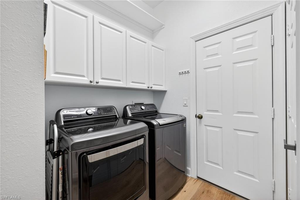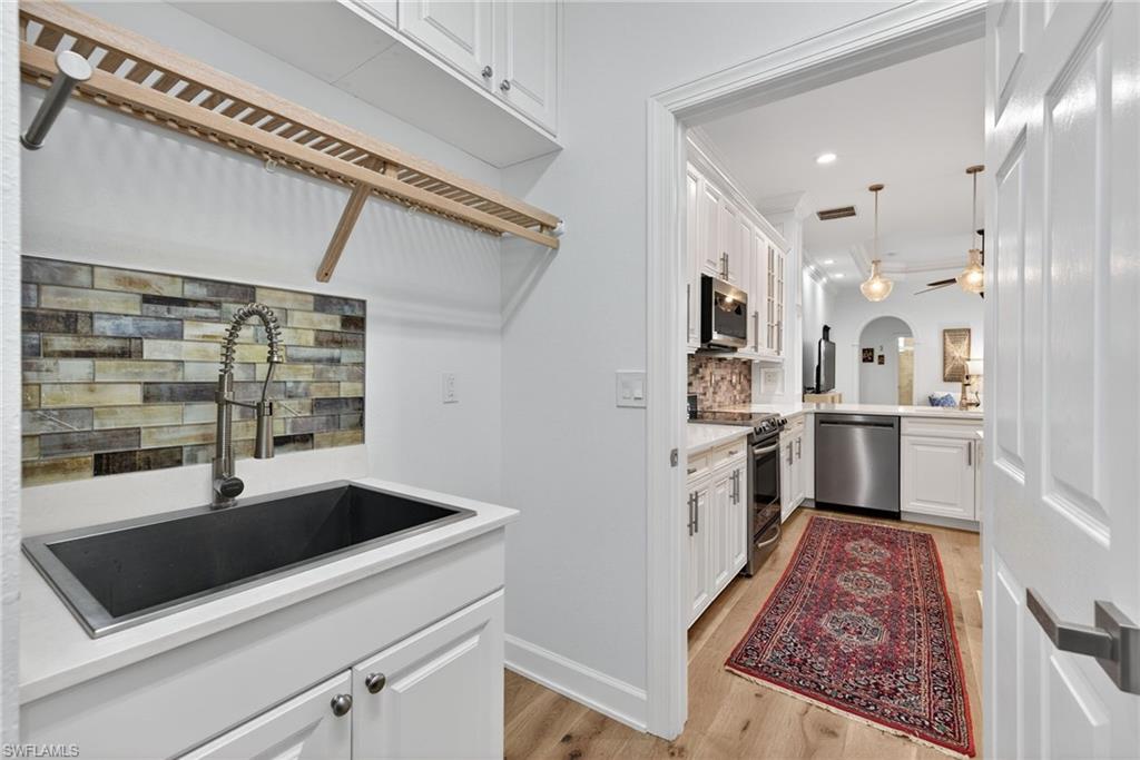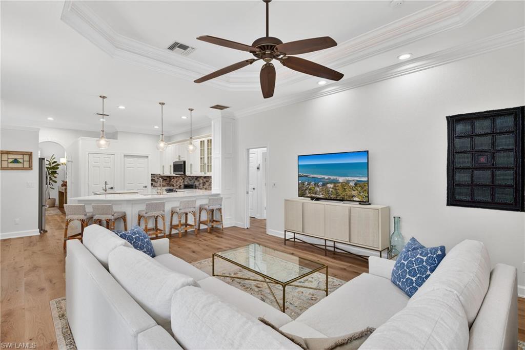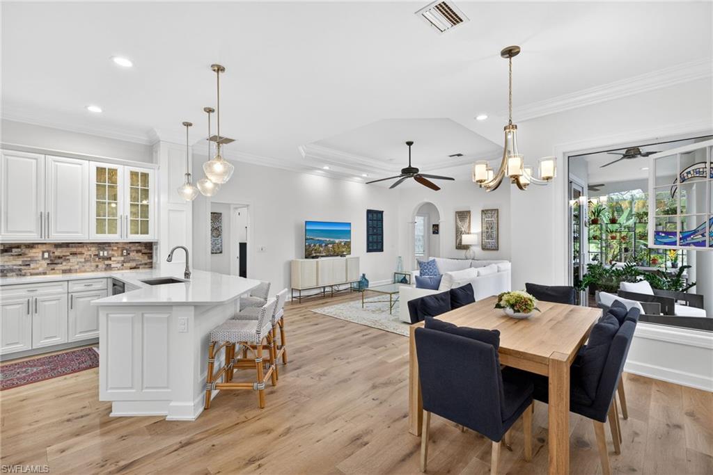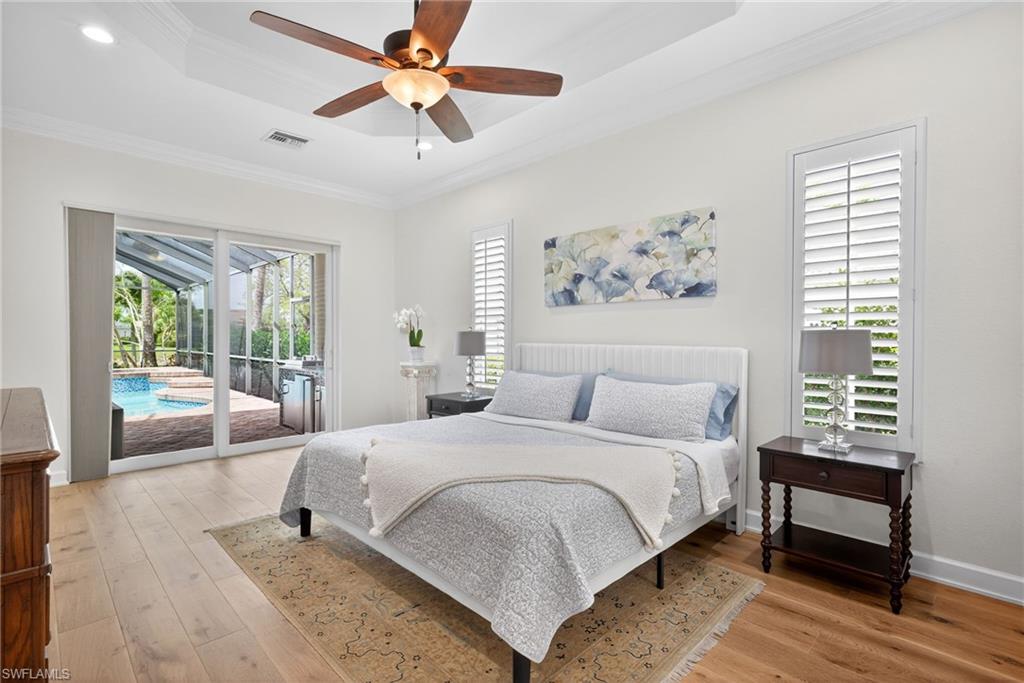 Welcome to Delasol - Where Naples Living Feels Like Home! Nestled within one of North Naples' most sought-after gated communities, this beautifully updated 4-bedroom, 3-bathroom home offers the perfect blend of refined comfort and relaxed Florida living. Sitting on one of the largest lots in Delasol, this move-in ready gem has been meticulously cared for and thoughtfully upgraded, truly a rare find. Step inside and feel the difference. Soaring ceilings up to 14 feet, wide plank white oak engineered hardwood floors, and an open, airy layout create an immediate sense of warmth and space. Crown molding, LED recessed lighting, updated fixtures, and fresh Sherwin Williams paint throughout give every room a polished, curated feel. The home has been professionally cleaned weekly since 2023 and is truly immaculate. Outside, your private paradise awaits. The expansive covered lanai and outdoor kitchen set the stage for effortless entertaining, while the newly resurfaced saltwater pool and spa, complete with updated equipment and lighting, shimmer against a stunning lake backdrop. Whether it's a quiet morning coffee or an evening swim with the kids, this outdoor space delivers every single day. Families will love the location. Delasol is zoned for some of Collier County's best schools, including Veterans Memorial Elementary, North Naples Middle, and the brand new state-of-the-art Aubrey Rogers High School. The neighborhood itself is full of children of all ages, and the community amenities, including a clubhouse, heated pool, fitness center, playground, and tennis, pickleball, and basketball courts, mean there's always something to do just steps from your front door. All of this with remarkably low HOA dues that cover your guarded gatehouse, community amenities, and Xfinity cable and internet, an almost unheard-of value in this school zone. And with no flood zone designation and a newer roof (2018), you can feel confident in your investment. The sellers' high-end furnishings, including pieces from Arhaus, Crate & Barrel, and Restoration Hardware, are negotiable, making this an incredible opportunity to move right in without lifting a finger. West of I-75 and just minutes from Naples' award-winning beaches, top dining, shopping, and the airport, this is the lifestyle you've been waiting for.