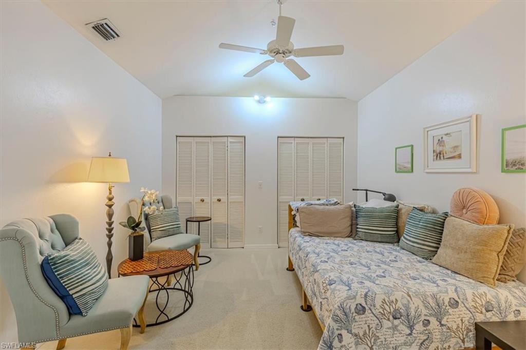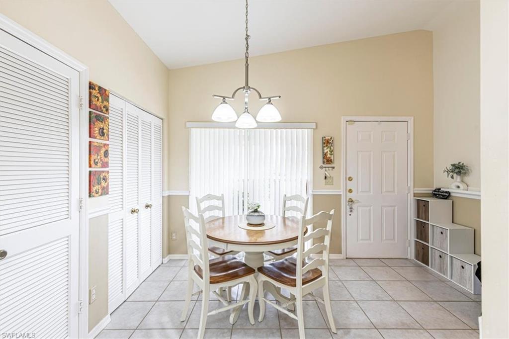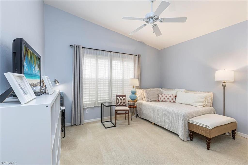 Rarely available top-floor residence in Chardonnay at The Vineyards! This bright and spacious three-bedroom, two-bath condo features vaulted ceilings and a thoughtfully designed floor plan filled with natural light. The expansive living and dining areas flow seamlessly into the kitchen with granite countertops, white cabinetry, and matching appliances, creating a welcoming space for everyday living and entertaining. The primary suite offers a generous layout with beautiful bay windows, abundant natural light, and an en-suite bath with a frameless glass shower. Guests will appreciate the privacy of the split-bedroom design and the well-appointed guest bathroom. The 3rd bedroom can easily function as a third bedroom, home office, or additional guest space. Enjoy the Florida lifestyle with two screened lanais — an eastern-facing front lanai perfect for morning coffee and a western-facing lanai overlooking the community pool and pond, ideal for relaxing sunsets. Additional features include covered carport parking, a private storage unit, and convenient elevator access to the third floor. Furnishings are negotiable, offering the opportunity for a seamless move-in and the ability to begin enjoying the Naples lifestyle immediately. This home enjoys a truly exceptional location adjacent to Vineyards Community Park, home to a variety of outdoor activities, walking paths, community events, and recreational spaces. Located in one of Naples’ most convenient locations, residents are just minutes from shopping, dining, Physicians Regional Hospital, and the Gulf beaches. Easy access to I-75 provides a quick drive to RSW International Airport, making travel simple for both seasonal and full-time residents. Optional membership to Vineyards Country Club offers access to 36 holes of championship golf, tennis, pickleball, a world-class wellness center and spa, and a vibrant social calendar. A wonderful opportunity to enjoy the Vineyards lifestyle in a spacious top-floor residence.