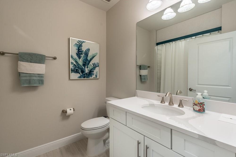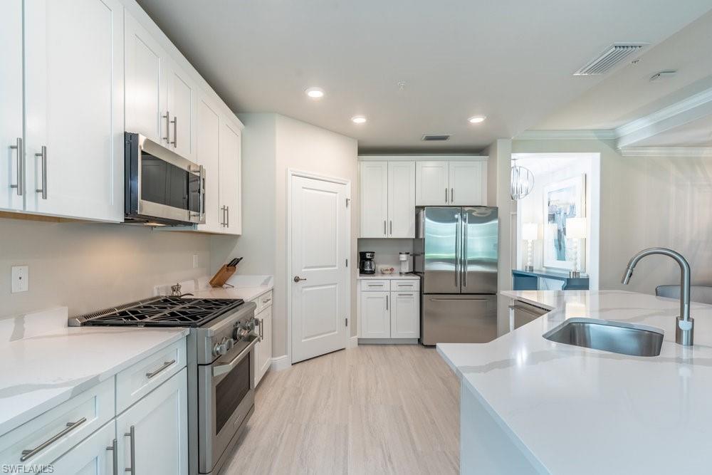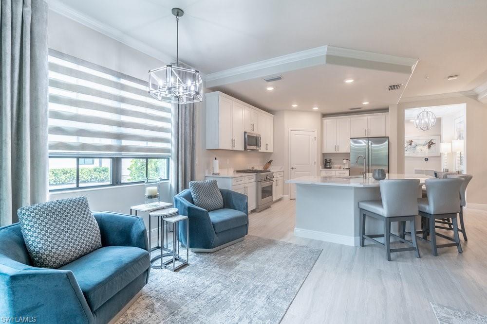 Spacious first floor coach home located in the Viansa neighborhood of Talis Park, offering a refined modern coastal interior and a private preserve setting. This three-bedroom, two bath residence features an open great room layout with large sliding doors that extend the living space to a screened lanai with southern exposure allowing for lots of natural light. The kitchen includes a center island, quartz countertops, premium cabinetry, and stainless-steel appliances. The primary suite provides lanai access, dual walk-in closets, and an ensuite bath with a large shower and double vanities. Two additional guest suites offer privacy for visitors. Additional features include an attached garage, impact resistant windows and doors, and a private building entry. The home is offered TURNKEY and was professionally decorated by Robb & Stucky allowing for a streamlined move in experience. Residents of Talis Park enjoy access to a variety of amenities, including a clubhouse, dining venues, fitness center, spa, resort style pool, tennis, pickle ball, bocce, and walking paths. The community is located in North Naples near shopping, dining, and Gulf beaches.