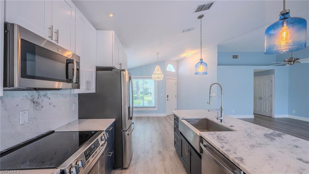 Perfectly positioned on one of the most coveted lots in Country Creek, this completely reimagined residence offers breathtaking, unobstructed water and golf course views that define the ultimate Florida lifestyle. No detail has been overlooked in this top-to-bottom renovation. This home has been completely gutted and meticulously redesigned with today’s most sought-after finishes and features. Enjoy peace of mind with a brand new roof and HVAC system, along with fresh interior and exterior paint. New ceramic tile installed on the lanai offers a great back drop for your outdoor living space. The stunning kitchen is a true showpiece, featuring elegant white granite countertops and backsplash, all-new custom cabinetry, white and navy shaker, and a full suite of stainless steel appliances. The home flows beautifully with luxury vinyl flooring throughout, complemented by all-new modern lighting inside and out. Both bathrooms have been transformed into spa-like retreats with floor-to-ceiling marble tile, rain pod shower head and soaker tub in the primary bath. The entire home is curated in a sophisticated palette of whites and soft blues, creating a light, airy ambiance that perfectly captures the essence of coastal living. Offered with immediate occupancy, this property also includes a golf membership w/ immediate access to golf. Country Creek is a lush, resort-style community offering an 18-hole executive bundled golf course w/ low cart fees, five clay tennis courts, bocce leagues, and five sparkling swimming pools. The vibrant Village Clubhouse features a full-service restaurant and bar, fitness center, card rooms, and endless activities to enjoy. Perfectly located between Naples and Fort Myers, you’ll be just minutes from I-75, RSW International Airport, Florida Gulf Coast University, Coconut Point Mall, Miromar Outlets, dining, and world-class beaches. This is a rare opportunity to own a completely renovated home with some of the best views in the community.