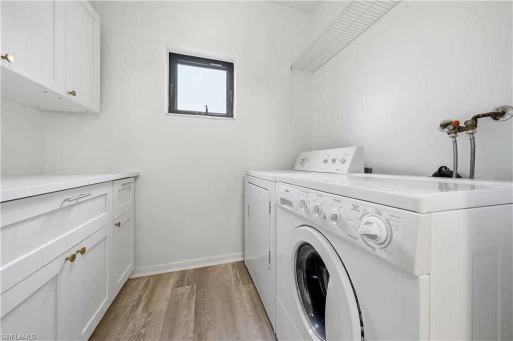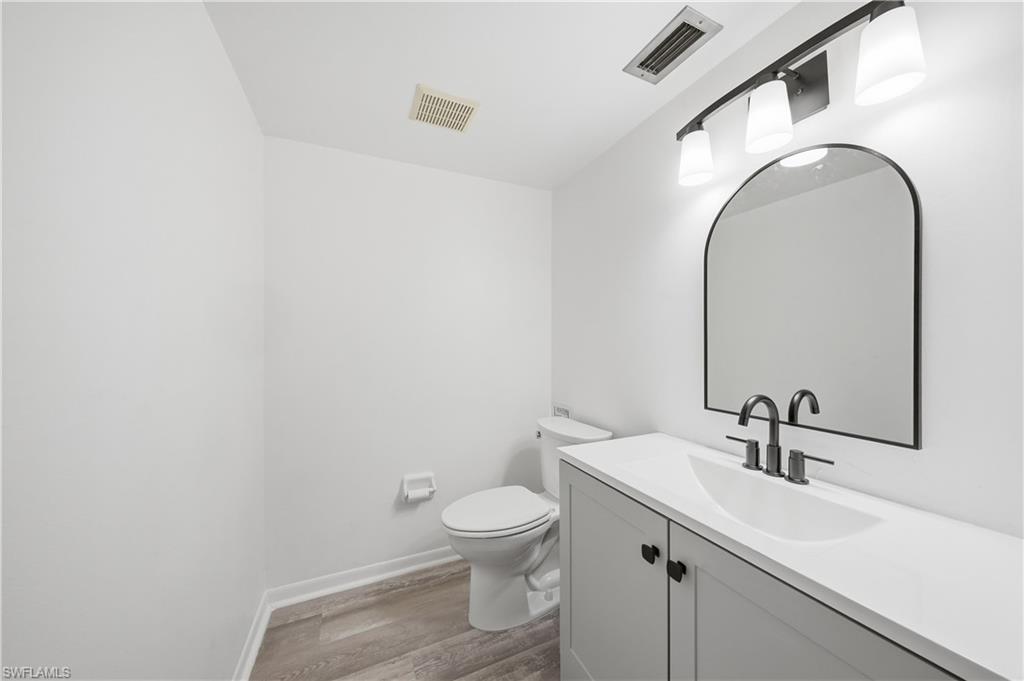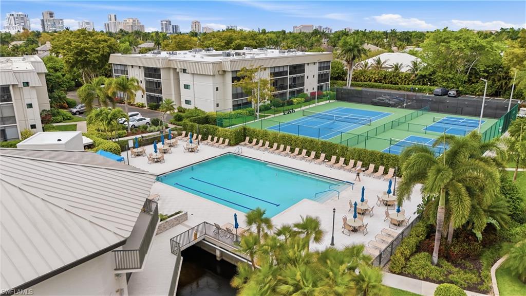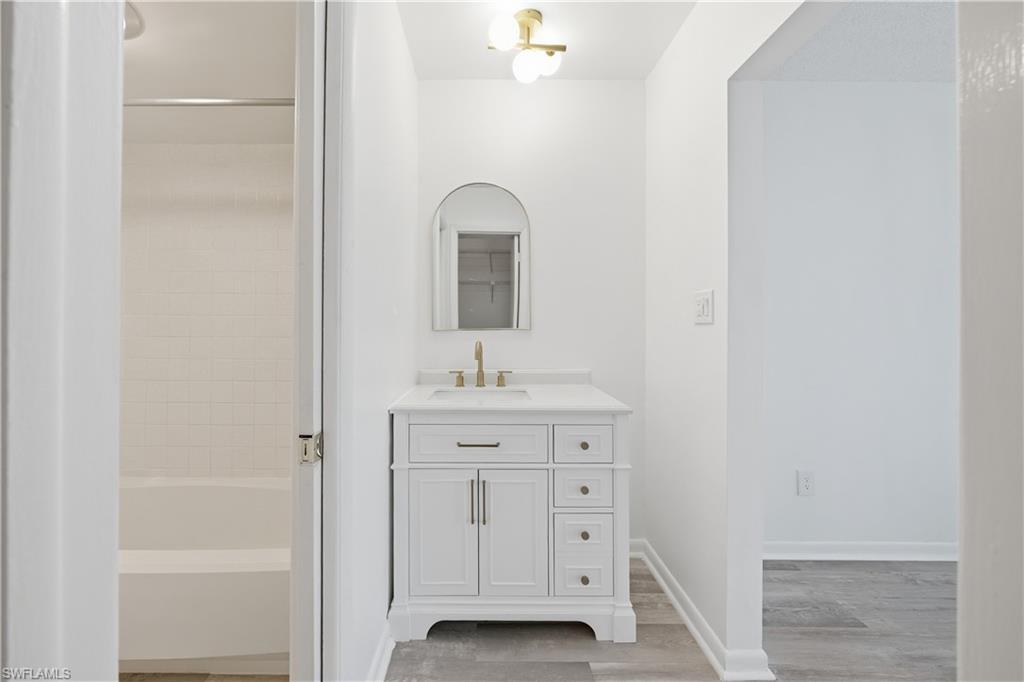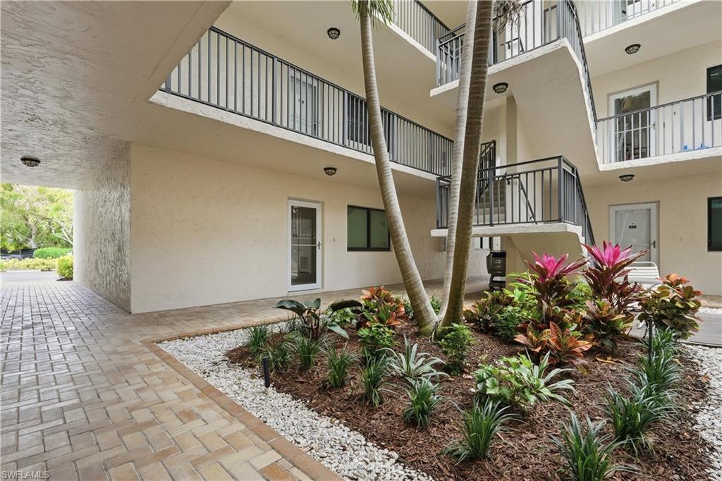 We welcome you to this beautifully updated 1 bedroom and 1 and a half bath condo in the heart of Naples, west of US 41 in Park Shore at Hidden Lake Villas with nearly 900 SqFt of living space. Curb appeal is on full display when pulling up to this gorgeous building. With your designated parking just off from the enclosed ground floor balcony, you are just moments away from the front door with views of the gorgeous courtyard with mature landscaping throughout. Greetings from the entryway lead you to your generously sized living room with the dining room, enclosed balcony, and kitchen just beyond all with updated luxury laminate flooring. The kitchen has been completely redone with gorgeous quartz counters, stainless steel appliances, cabinetry, breakfast bar, walk-in pantry, and beautiful backsplash. Entertaining is made easy with effortless flow from the living/dining area and out to the enclosed balcony. The enclosed balcony enjoys North facing exposure with tons of natural light and separate access to the outdoors and primary bedroom. The primary bedroom also enjoys tons of natural light, vanity, combination shower/tub, and large walk-in closet. An additional powder room off the living area is an added bonus for nights intended for entertaining. Peace of mind is enhanced with 2 parking spaces, laundry in residence, storm shutters off the balcony, and central location within the community. Residents of Hidden Lake Villas enjoy an abundance of amenities from pickleball, tennis, clubhouse, community pool, gym, library, and fantastic A+ rated school system. This meticulously kept unit is only moments from Venetian Village of Naples, the white sandy beaches of the Gulf, a less than 10 minute drive to famed Downtown Naples, and loads of nearby Shopping and world class dining.