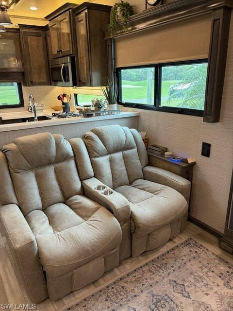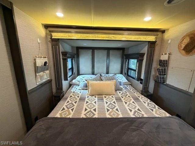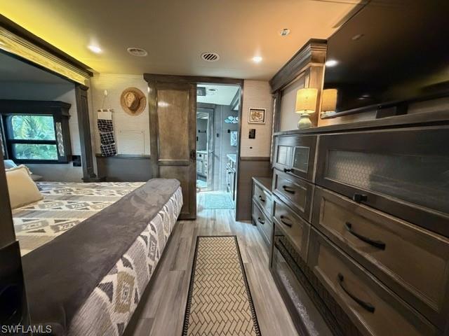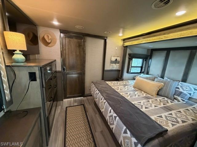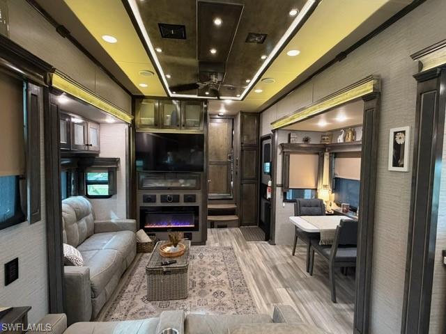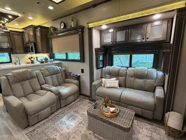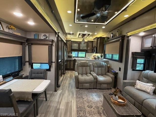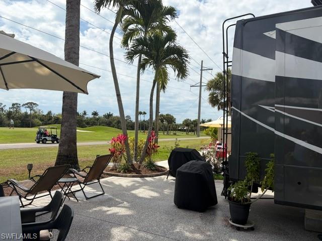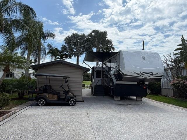 This oversized 45x90 RV site has been upgraded to make it move-in ready. This property is being sold as a full package including a 2022 Vanleigh Beacon 41LKB fifth wheel with built stairs, a newly constructed screen room with windows and an attached shed that includes a washer and dryer, sink, toilet and plenty of room for storage. The screen room is fully furnished with a pull-out couch, chairs, a dining table, a large screen tv and much more. The concrete pad is expanded to give a great deal of living area and parking area. The location of this site in Silver Lakes is near the middle of the resort and has a fantastic view of the golf course and lake. Not many opportunities to walk in to a property with all the amenities this one includes. The finishing touches to this site also include the full painted concrete pad, tasteful tropical landscaping with night lighting, and the open air patio off the back of the property to enjoy the wide open view!