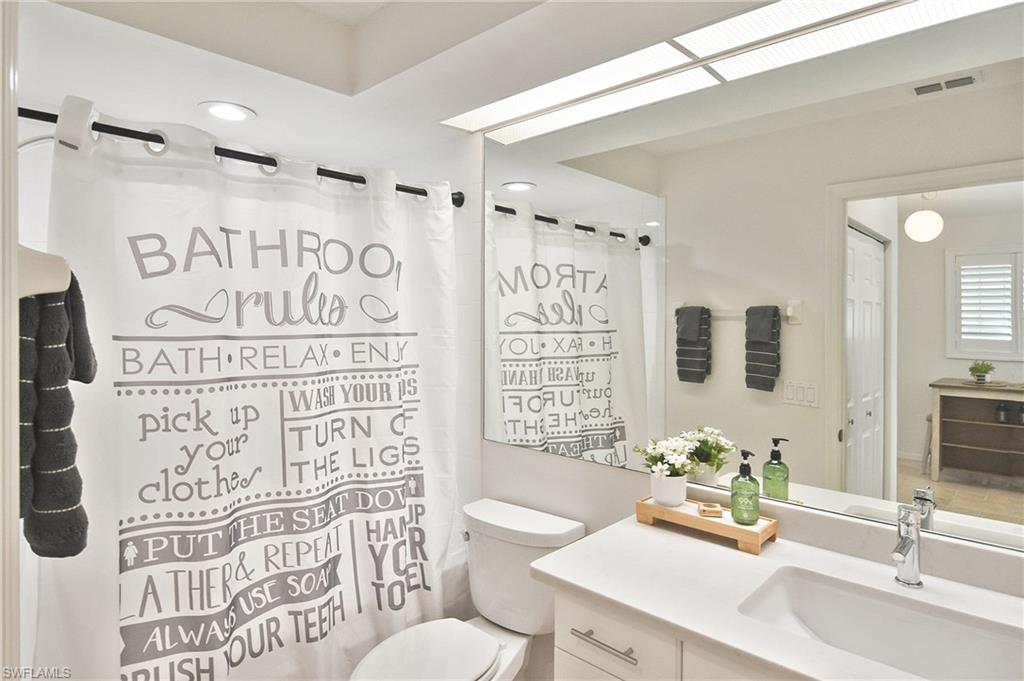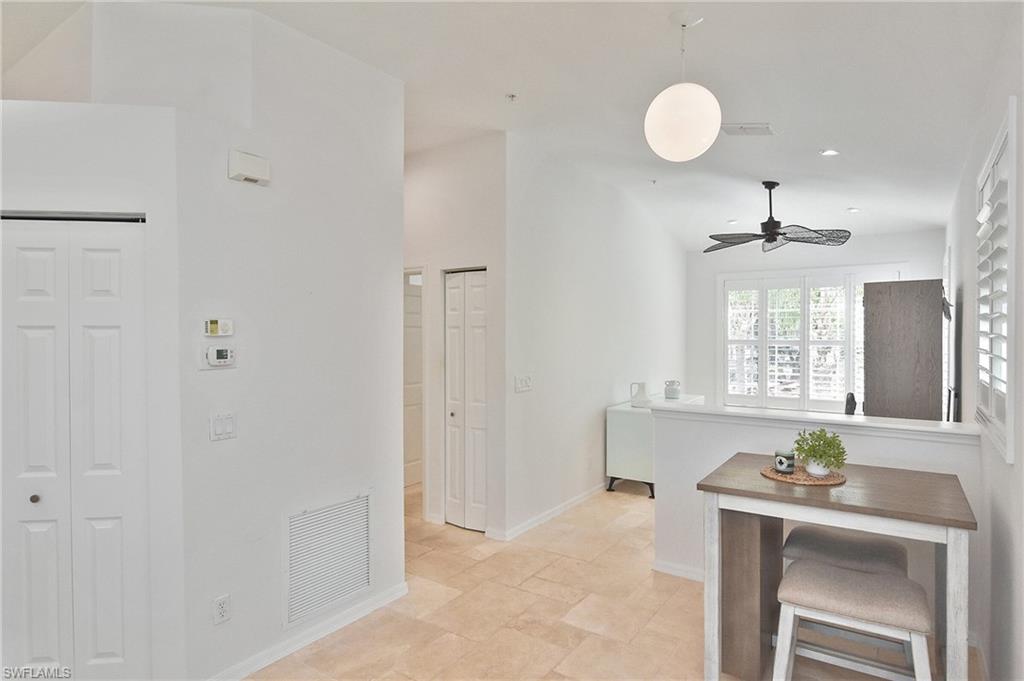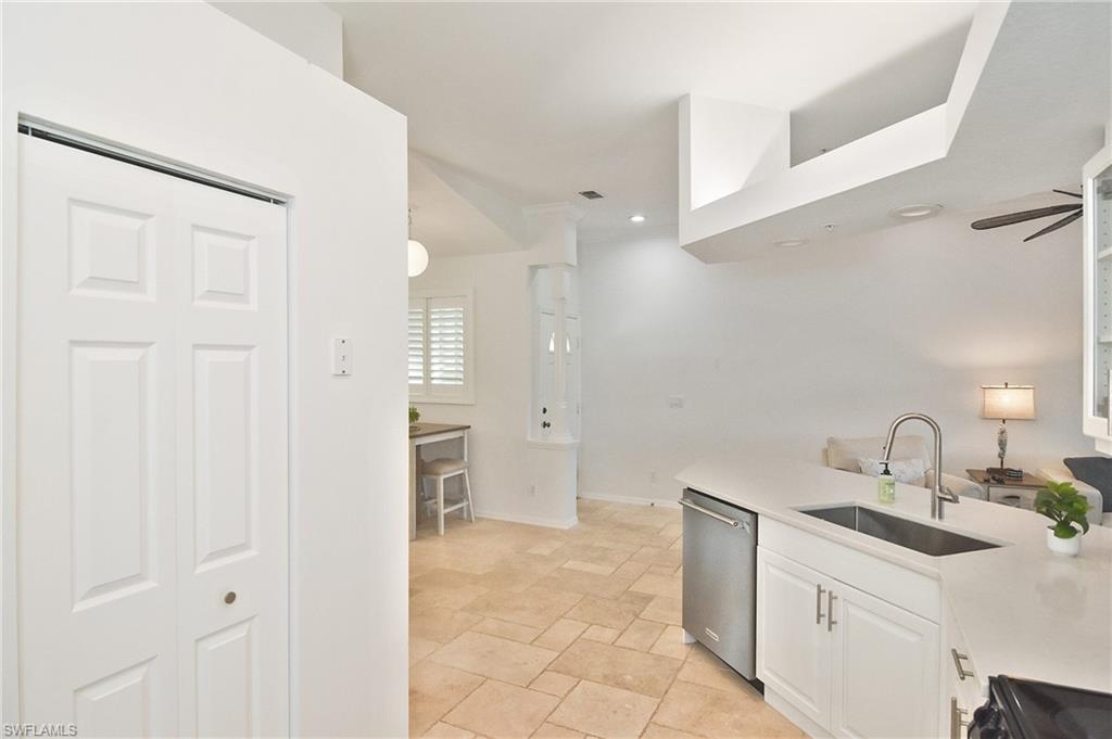 This well-appointed home is ideally located adjacent to the community pool, sport court and a fabulous view of the pond with a fountain. This 2 bedroom/2 bathroom 2nd floor unit has 9 foot ceilings, an open kitchen with quartz countertops, island, tile backsplash, stainless appliances, and under-counter lighting. Travertine floors throughout, updated bathrooms to include a Jacuzzi tub in guest bath. Plantation shutters throughout and a Storm Smart Hurricane Lanai screen. Newer AC and water heater. THIS UNIT IS MOVE-IN READY!
