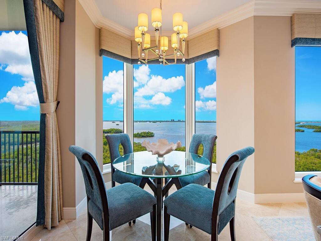 Positioned in La Scala, the closest-to-the-water high-rise in The Colony Golf & Bay Club, this exceptional 9th-floor residence offers over 3,500 square feet of interior living and more than 3,900 total square feet with two lanais—combining scale, privacy, and sweeping coastal views. Offered fully furnished, the home features glistening light neutral polished marble floors throughout, beautifully complemented by comfortable traditional-style furnishings, custom draperies, and refined wall treatments, creating a warm yet elegant interior. Walls of glass capture wide water views over Estero Bay to the Gulf, while the southwest exposure delivers spectacular sunset skies from the main living areas and primary suite. The open kitchen and family room form an inviting gathering space, enhanced by a multiple-window breakfast nook overlooking the water. The floorplan includes three spacious ensuite bedrooms, including a private primary retreat with a luxurious all-marble bath. 9’8” ceilings, generous storage, two assigned under-building parking spaces, and private secure storage enhance everyday livability. La Scala offers 24/7 attended front desk service and two levels of resort-style amenities, including a pool and spa, fitness center, private theater, guest suites, social and game rooms, library, billiards, and gathering spaces. The grand lobby with twin marble staircases sets an elegant tone on arrival. Recent significant building renovations include all-new stucco treatment across the entire building, complete exterior repainting, updated garage and private storage areas, a new roof, all-new landscaping, and more—providing both beauty and long-term peace of mind. As part of The Colony at Pelican Landing, residents enjoy access to The Bay Club with waterfront dining, a private beach park via boat shuttle, plus tennis, pickleball, kayak park, optional golf at The Colony Golf Club or Pelican Nest and more.