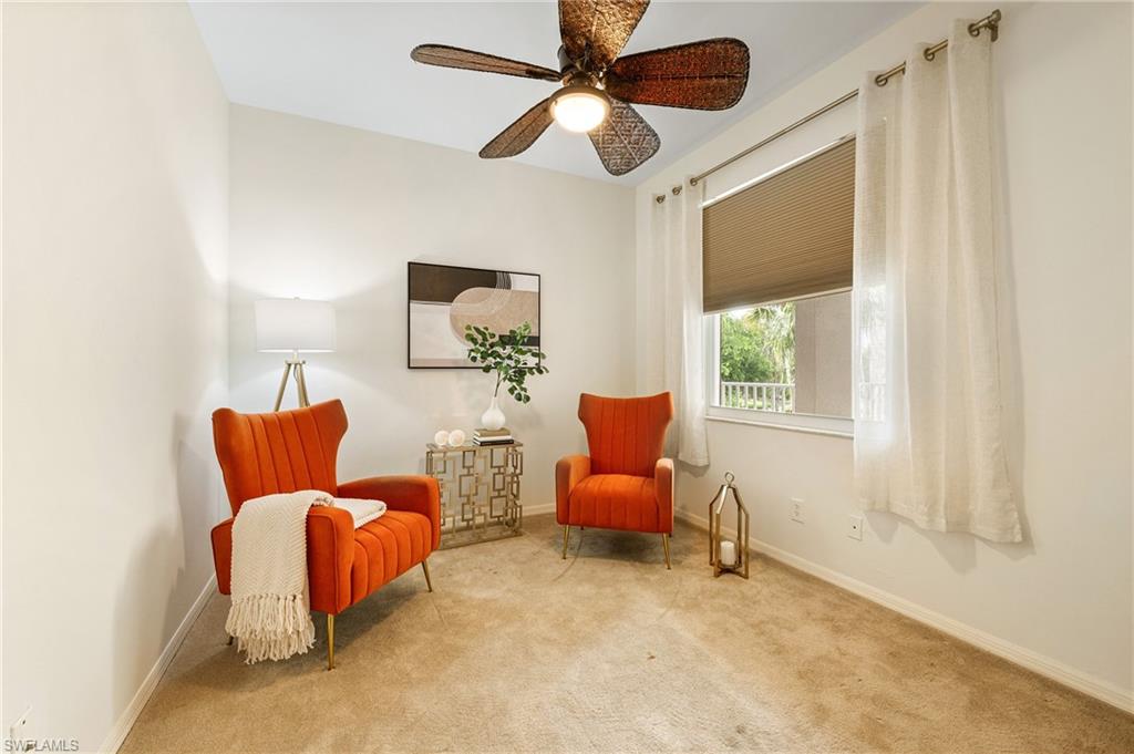 This bright and light 2-bedroom, 2-bathroom condo with spectacular golf course and lake views is now available for sale in the bundled golf community of Naples Heritage. Ideally located on the signature 12th hole (par 3), just steps from the tennis courts and satellite pool. The condo features impact-resistant storm windows on the rear side and electric storm shutters on the lanai. One covered carport is included, along with plenty of guest parking nearby. A private storage room is conveniently located right across from the front door. Furniture is negotiable. Naples Heritage is a bundled golf community featuring a Gordon Lewis–designed 18-hole course, along with a driving range and putting green. Residents enjoy an active lifestyle with resort-style amenities, including a clubhouse, four pickleball courts, six tennis courts, bocce courts, a fitness center with a wide range of classes, and poolside dining at the Palm Terrace overlooking the resort-style pool. Located just minutes from Naples’ and Marco Island’s sugar-sand beaches, as well as the Naples Botanical Garden, and Downtown Olde Naples, residents can explore premier boutiques, art galleries, interior design shops, fine dining, cafés, and a variety of entertainment options.