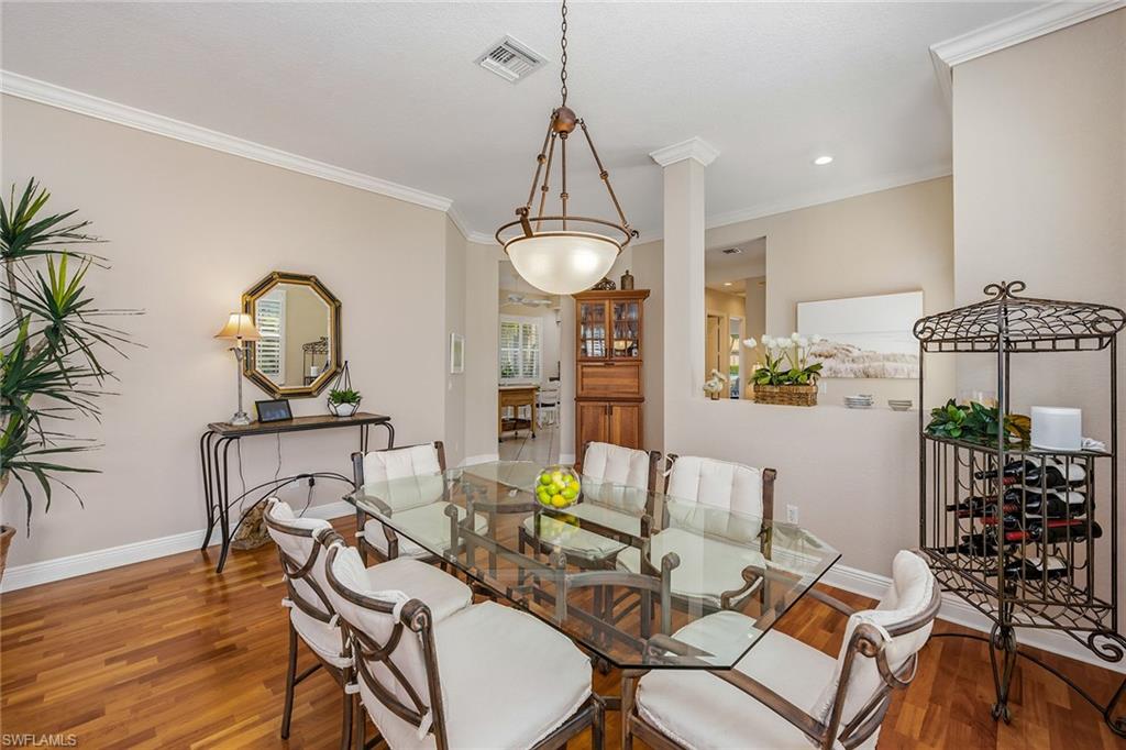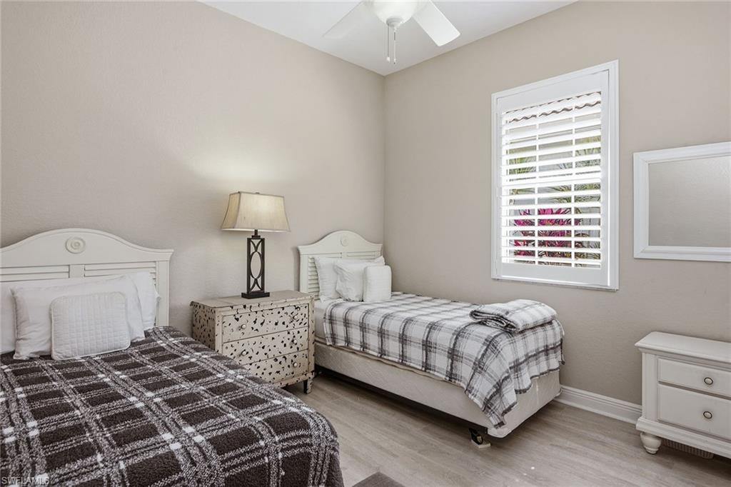 Rare (optional) opportunity, enjoy immediate full golf membership and skip the extensive waitlist at the prestigious Members Club at Marco, offering access to the regarded championship Rookery and Hammock Bay Golf courses, two elegant clubhouses, and private beach privileges at JW Marriott. Quality built by the Gulf Bay and showcasing the popular Cedarcrest floor plan, this beautifully furnished Cotton Green residence is positioned overlooking the 12th fairway of the Rookery Golf course, lush tropical landscaping, and offering coveted southwestern exposure delivering breathtaking sunset skies and plentiful natural light on your private pool. Designed for effortless luxury living, the three-bedroom, two-bath home with a two-car garage features a refined, light-filled interior with wood-look luxury vinyl plank flooring, new baseboards, arched walkways, recessed LED lighting, plantation shutters, crown molding and integrated in-ceiling speakers, all flowing seamlessly to the outdoor living space. The chef-inspired kitchen with breakfast area is elegant and functional with quartz countertops, mosaic tile backsplash, sleek cabinetry, pantry and stainless steel appliances including a double-oven range, microwave, new refrigerator with ice maker (2026), and dishwasher. The primary suite is a private retreat with a vaulted ceiling, arched window with transom, lanai access, custom walk-in closet, and a spa-style bath featuring dual quartz vanities, a soaking tub, and a glass-enclosed walk-in shower, while guest bedrooms are generously sized with new carpeting and well-appointed baths. Outdoor living is elevated on the expansive screened lanai with pavers, covered seating, ceiling fan, in-ceiling speakers and a heated pool with a pool heater replaced in 2023, enhanced by a newer picture-frame screen enclosure (2023) that maximizes the picturesque setting. Significant updates provide peace of mind, including a new roof (2024), new air handler and condenser (2024/2025), and additional system improvements. The garage is upgraded with a painted floor, LED lighting, EV-ready outlet and overhead storage. As a resident of the award-winning Fiddler’s Creek community, you will enjoy resort-style amenities including an impressive clubhouse with swimming pools with waterfalls and slides, the updated Gator Grille, Caxambas fine dining, 10 new pickleball courts, fitness with trainers and classes, tennis, spa services and a vibrant social calendar, with optional beach and marina memberships. Miles of scenic, tree-lined sidewalks wind throughout the community, creating a setting for recreation, biking and jogging in a tranquil environment. Ideally just minutes from everyday conveniences, an executive airport, and a short drive to Naples’ boutiques, dining and cultural attractions, and Marco Island’s renowned beaches, this exceptional residence offers a lifestyle defined by luxury, convenience and connection.