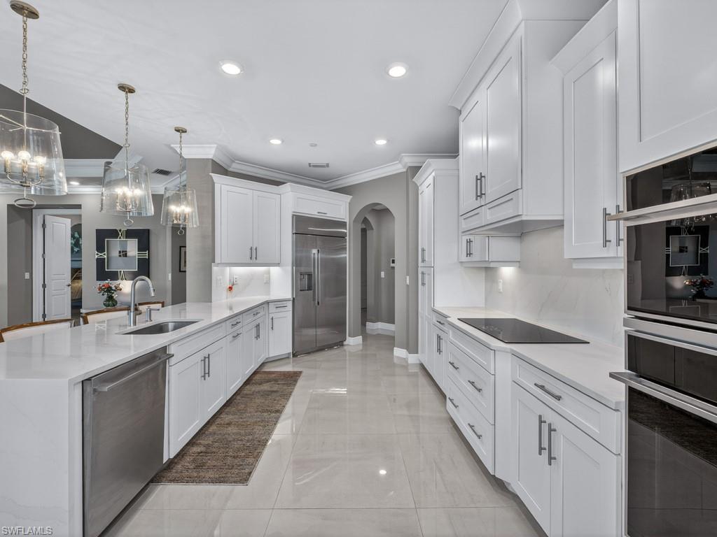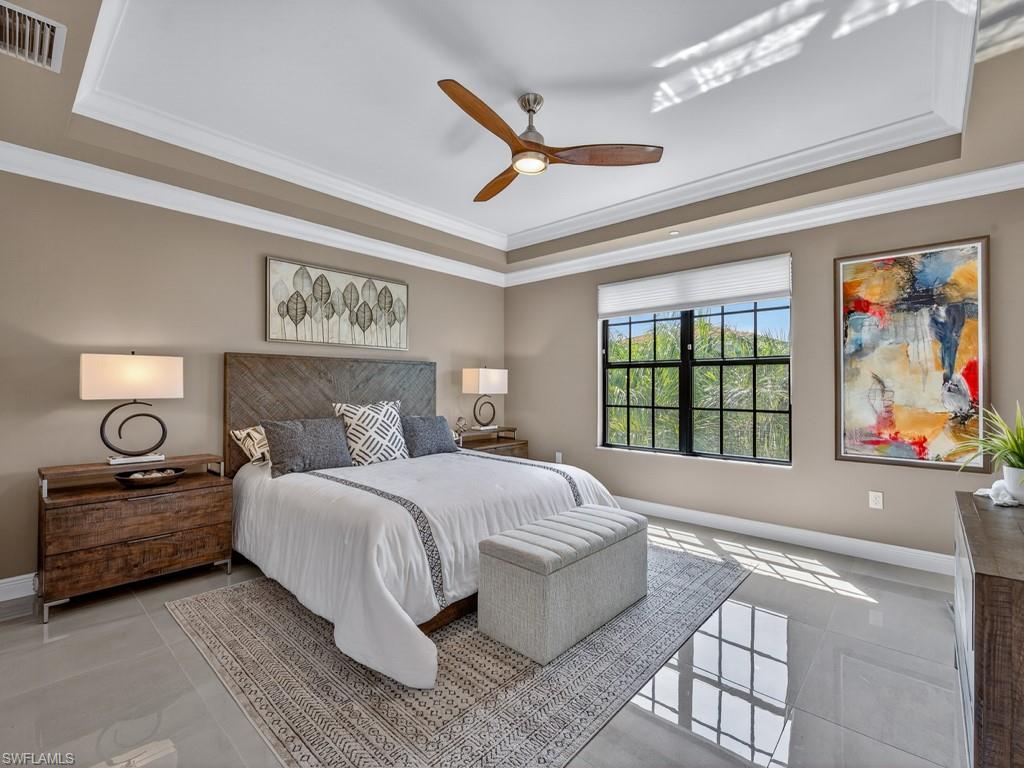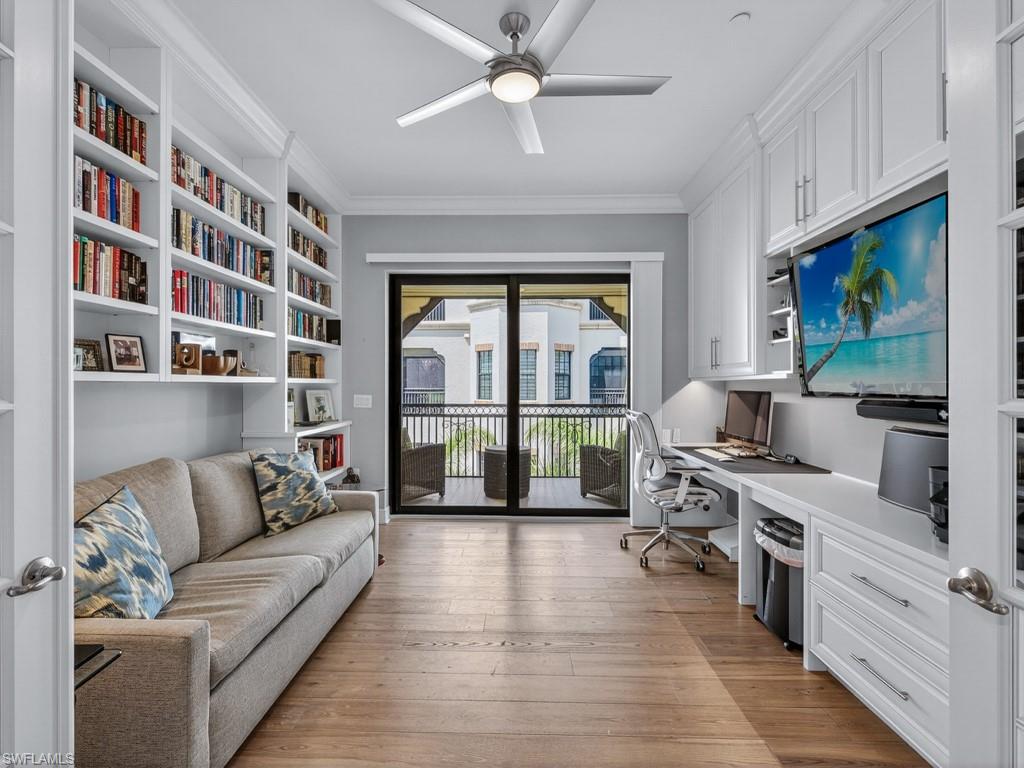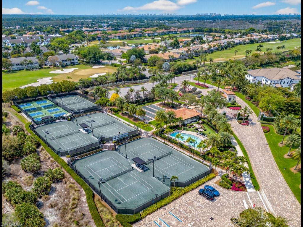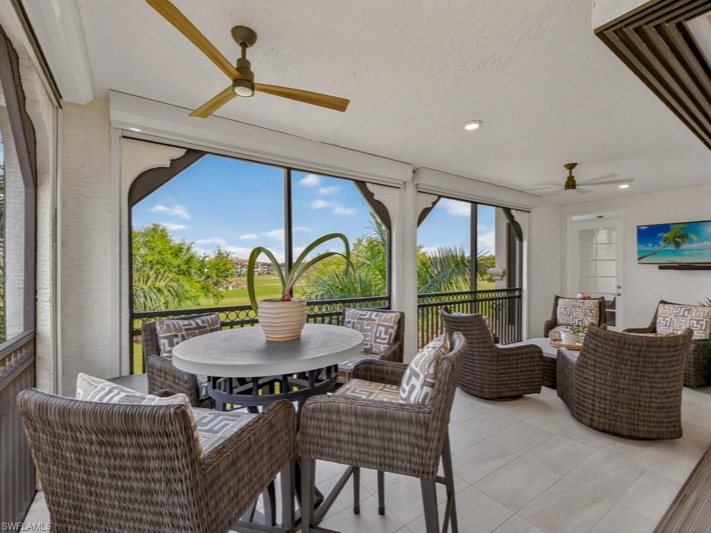 Located in the highly sought-after Viansa enclave within Talis Park, this penthouse-style residence offers nearly 3,000 square feet of luxurious living. Enjoy sweeping 180-degree views of the award-winning Norman/Dye Golf Course (2nd fairway), creating a stunning backdrop for everyday living. Built in 2019 and offered furnished, this move-in-ready home blends modern design with effortless indoor-outdoor living. A secure elevator opens to a bright, open floor plan where zero-corner sliders seamlessly extend to an expansive screened lanai. Large tile flooring, crown molding, tray ceilings, high-end lighting fixtures, and custom built-ins elevate the home throughout. The thoughtfully designed split floor plan features two en-suite guest bedrooms, along with a versatile den offering a private balcony. The kitchen is well-appointed with a new induction cooktop, newer stainless-steel appliances, and a dry bar complete with wine cooler and mini-fridge, perfect for entertaining. The primary suite serves as a private retreat with serene golf course views, a private balcony, dual vanities, a soaking tub, walk-in shower, and a spacious walk-in closet. Additional highlights include impact windows and doors, electric hurricane shutters on the lanai, two assigned spaces in the secured garage, and a large private storage unit. Residents of Talis Park enjoy resort-style amenities including the Vyne House clubhouse, lap pool, fitness center, tennis, pickleball, bocce, and multiple dining options. Golf membership available to the award-winning 18-hole championship course. Ideally located just minutes from shopping, dining, beaches, and I-75, this residence offers the perfect blend of luxury, convenience, and lifestyle.