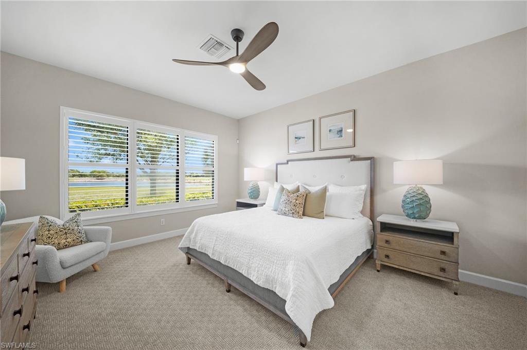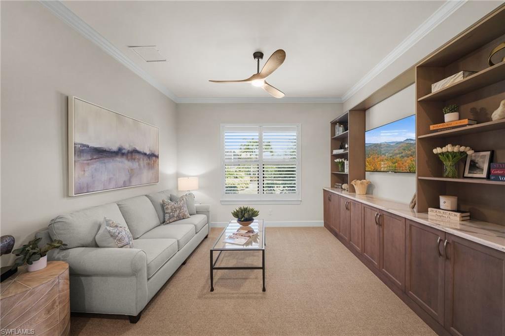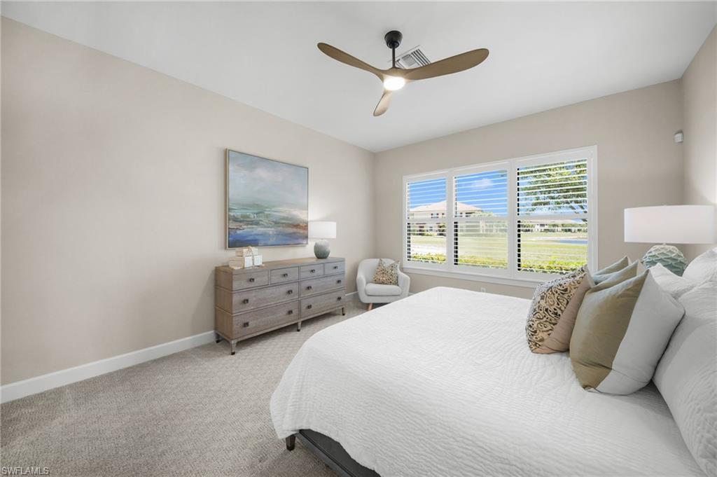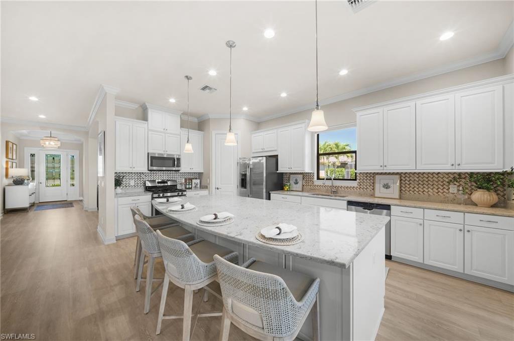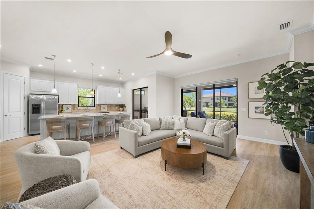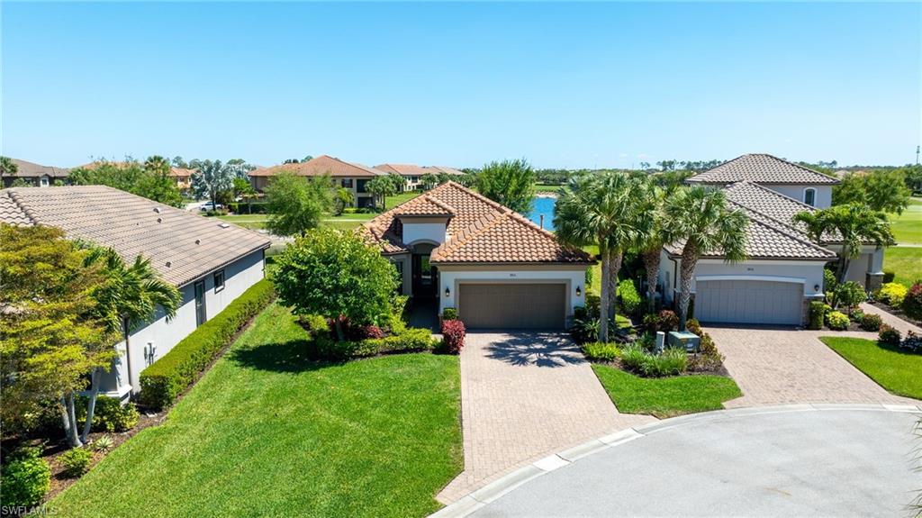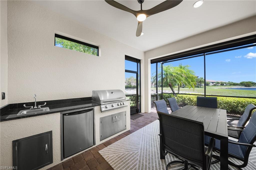 LIVE A VACATION LIFESTYLE IN ESPLANADE! FULL GOLF MEMBERSHIP INCLUDED! This immaculate and well appointed “Lazio” is situated on an oversized cul-de-sac lot overlooking two lakes and the 7th green. Inside, you will find 3 bedrooms, den, 3 full baths, and just 2300 sq ft of open concept living space. From the moment you walk in the door, you are greeted with wood floors throughout the common areas and two sets of sliding glass doors to the extended lanai complete with outdoor kitchen and can be enclosed by motorized roll down hurricane screens. The kitchen is the heart of the home and features raised panel cabinetry, Cambria quartz countertops, and stainless steel appliances including a GAS range. Other fine appointments include: oversized tandem 3 car garage; freshly painted exterior; stone detail on the front of the home; new HVAC; crown molding & wainscoting details; brand new ceiling fans throughout; master bedroom closet built-ins; plantation shutters on all windows; walk-in showers in all baths; hurricane impact front door with matching sidelights; spacious Laundry Room with cabinetry; 8' doors/10' ceilings; and more! ROOM FOR POOL/SPA/CAGE. Esplanade Golf & Country Club of North Naples offers a true “Lifestyle Community” with world-class amenities, including a resort pool with cabanas and the popular “Bahama Bar,” tennis, pickleball, bocce, a 14-mile network of bike/walking trails, and an 18-hole private golf course. The impressive 15,000 Sq Ft clubhouse features a restaurant, bar, wine-tasting room, wine lockers, and a Starbucks-style café. Best of all, the property’s landscaping, irrigation, golf membership, and all community amenities are covered under a quarterly fee of just $3,743—no additional fees or memberships required! Don't miss your opportunity to own this exceptional home in one of Naples’ most sought-after communities. Schedule your tour of this stunning home and Esplanade Golf & Country Club today! COMING SOON TO ESPLANADE (2026): Fully renovated and expanded poolside Bahama Bar; expanded outdoor bar at the Barrel House; expanded golf practice range; and an AIR CONDITIONED INDOOR PICKLEBALL COMPLEX with four indoor courts.