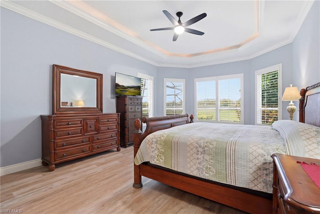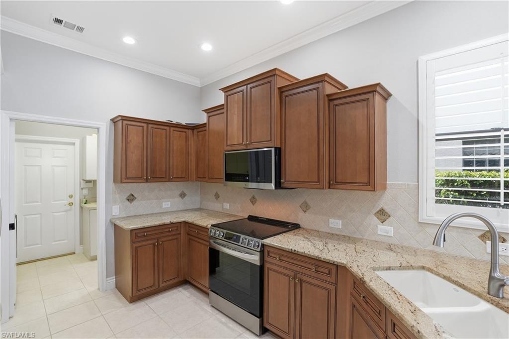 Welcome to 6039 Fairway Court in The Strand, offering a tranquil golf course view and ideally located within this sought-after gated community. This well-maintained home features a functional split-bedroom floor plan with two guest bedrooms and a spacious den, ideal for a home office or additional guest space. Recent updates include a new HVAC system, new pool equipment, a newer roof, fresh interior paint, and new LG appliances. The floor plan has also been opened up by removing the wall between the kitchen and family room, creating a more connected living space. The primary suite includes a bay window sitting area and two large walk-in closets. The main living areas and breakfast nook overlook the pool and golf course, bringing in natural light and enhancing the indoor-outdoor flow. All windows are fitted with new plantation shutters, and the sliders feature a remote-controlled shade for added convenience. The lanai offers ample space for dining and lounging, and the pool is positioned to capture sun throughout the day. Electric hurricane shutters add convenience and peace of mind, and the home is equipped with Eufy security cameras and a video doorbell. Residents of The Strand enjoy a 27-hole championship golf course, 8 tennis courts, 7 pickleball courts, a fitness center, and a recently renovated clubhouse with both casual and fine dining. Additional amenities include a resort-style pool, spa, and an active social calendar—all just minutes from Naples beaches, shopping, and dining.
