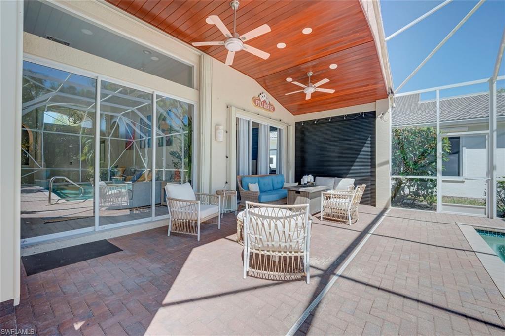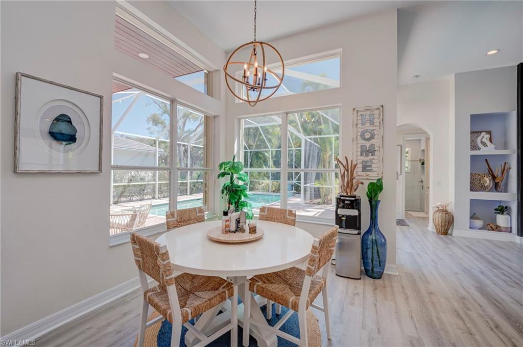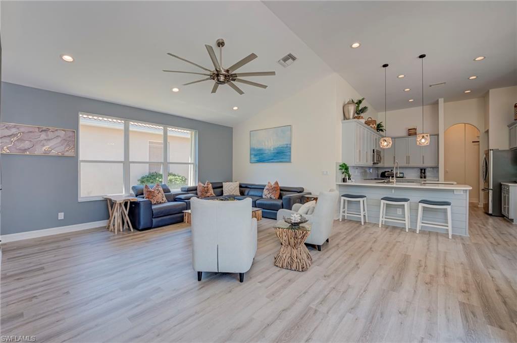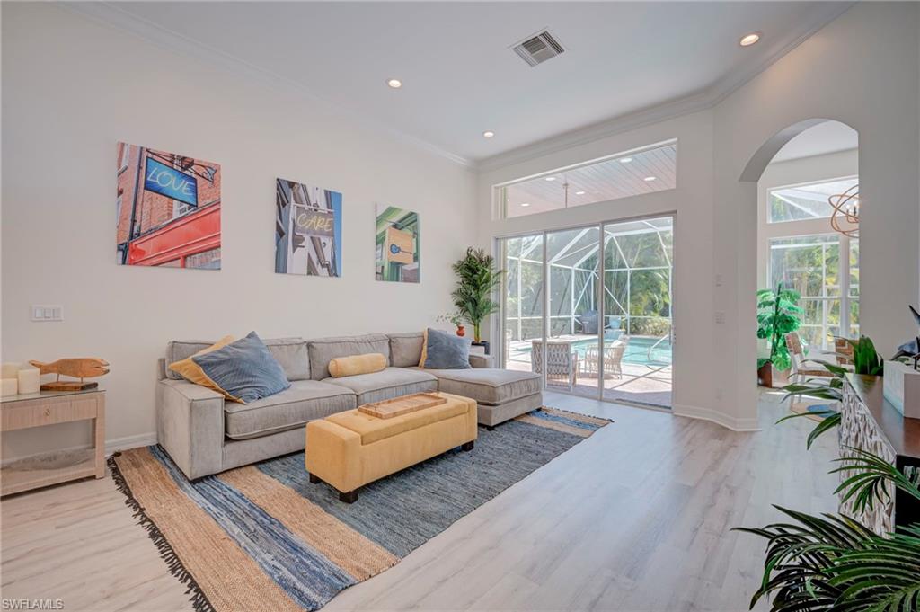 No photo can capture the privacy, the light, or the stillness of a preserve lot that makes you forget the rest of the world exists. Situated on a highly private, southern-exposure preserve lot, this extensively remodeled 2,681 sq ft Aquamarine model offers 4 bedrooms + den and 3 bathrooms with an exceptional open layout and volume ceilings. The primary suite and guest baths have been completely renovated with spa-inspired finishes, including a large walk-in shower, custom tilework, and designer vanities. The open-concept living area flows seamlessly to a screened lanai with wood-paneled ceiling, overlooking a private pool surrounded by lush preserve for maximum privacy and sunlight. Located in Saturnia Lakes, a 24-hour guard-gated community in North Naples, residents enjoy resort-style amenities including a clubhouse, fitness center, pools, tennis courts, and more. HOA includes cable, internet, security, and full exterior maintenance for simplified ownership.