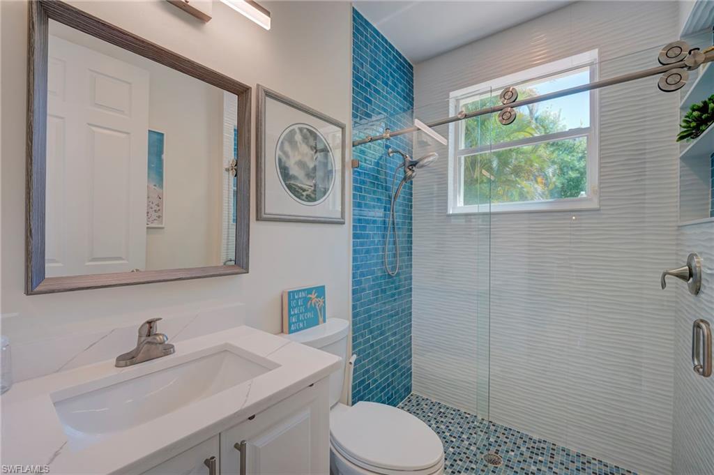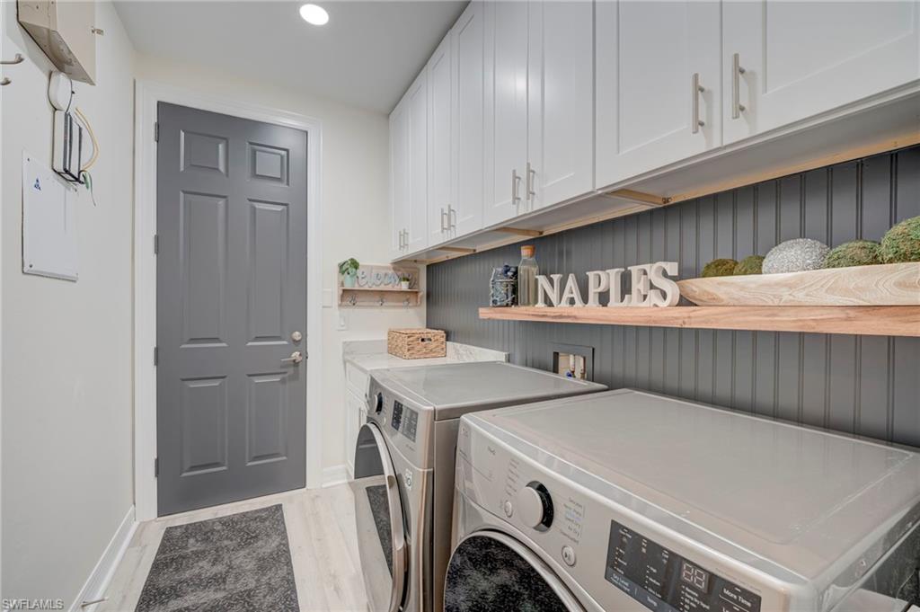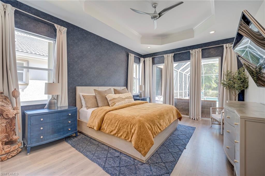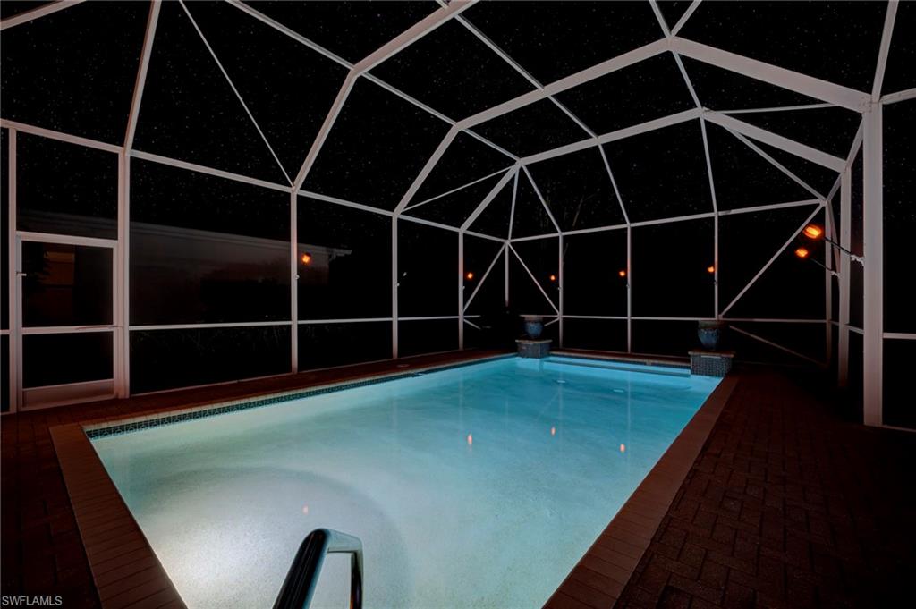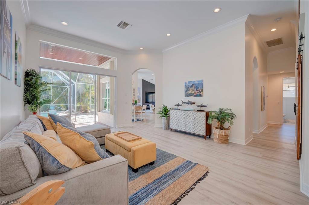 No photo can capture the privacy, the light, or the stillness of a preserve lot that makes you forget the rest of the world exists. Situated on a highly private, southern-exposure preserve lot, this extensively remodeled 2,681 sq ft Aquamarine model offers 4 bedrooms + den and 3 bathrooms with an exceptional open layout and volume ceilings. The primary suite and guest baths have been completely renovated with spa-inspired finishes, including a large walk-in shower, custom tilework, and designer vanities. The open-concept living area flows seamlessly to a screened lanai with wood-paneled ceiling, overlooking a private pool surrounded by lush preserve for maximum privacy and sunlight. Located in Saturnia Lakes, a 24-hour guard-gated community in North Naples, residents enjoy resort-style amenities including a clubhouse, fitness center, pools, tennis courts, and more. HOA includes cable, internet, security, and full exterior maintenance for simplified ownership.