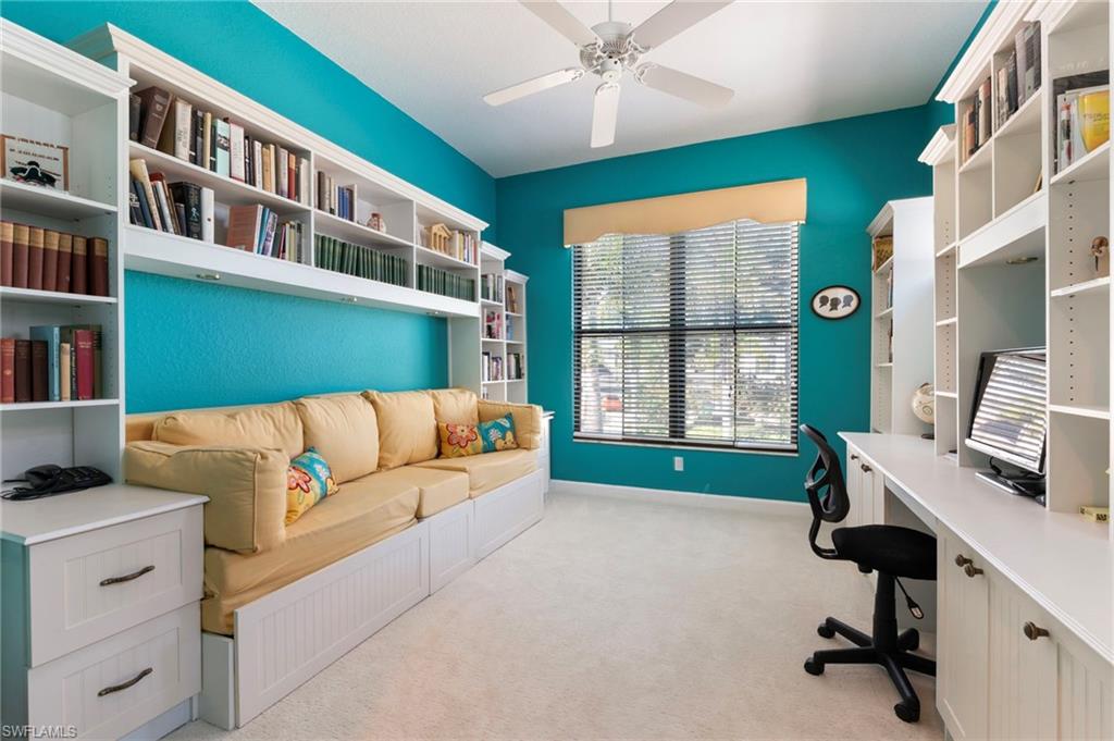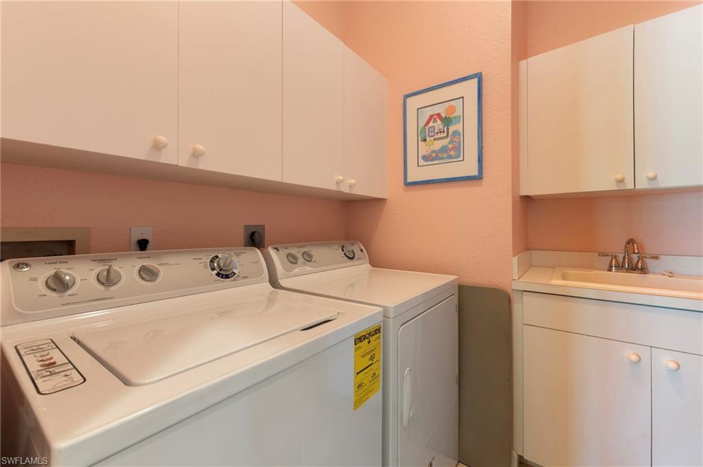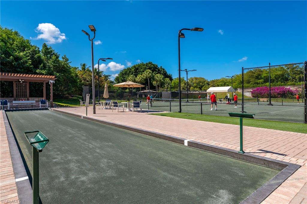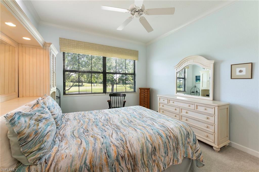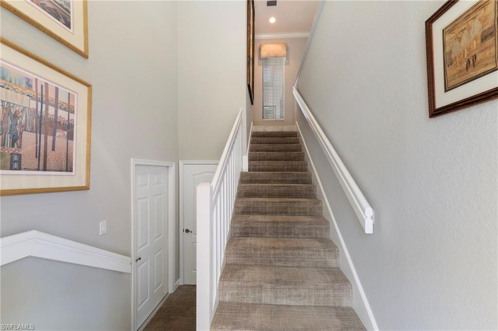 SPECTACULAR panoramic views of the lake and golf course await from the lanai with breathtaking sunrises and wildlife galore! This well maintained home is nestled in the idyllic setting of Ravenna. The second floor unit has volume ceilings and abundant natural light. Kitchen has been updated with floor to ceiling custom cabinets for storage galore. Boasting 2 guest suites this home is ready for hosting family and friends offering comfort and privacy. The primary bedroom closet has been custom designed providing organized and convenient storage. Elevator ready with dual storage closets positioned for future installation. Totally redesigned in 2023, Ravenna showcases a cohesive, coastal aesthetic as you enter. New hurricane rated windows, doors, (including garage and front door) and a new roof along with clubhouse, pool and gym renovations that offer peace of mind and long term value. There is also street parking for guests along the beautifully landscaped median. Residents of Pelican Marsh enjoy resort style amenities including tennis, pickleball, bocce, state of the art fitness center and spa, 24 hour gated security and miles of scenic walking and bike paths. Extremely social community with activities galore. Courtside onsite restaurant is a wonderful option to enjoy lunch or dinners with new neighbors and friends. Optional various level golf memberships (wait list) at the prestigious Pelican Marsh Golf Club. Ideally located just minutes to Mercato, Waterside Shops and the pristine beaches of Vanderbilt Beach . This home is move in ready offering refined coastal living in the charming, sought after community of Pelican Marsh!