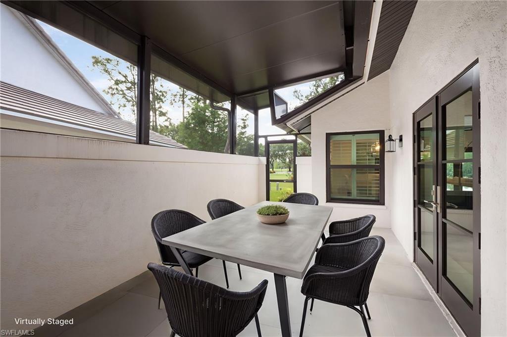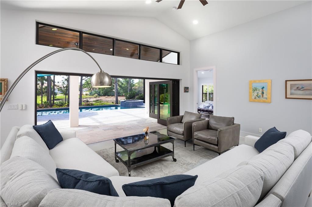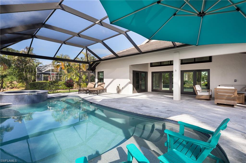 Stunning home with a full golf membership within the Montclair Estates neighborhood of Glen Eagle Golf & Country Club. One of 46 residences, Montclair Estates offers an intimate community design with beautiful landscaping, upscale appeal, and a sense of privacy. The home has been extensively remodeled both inside and out, with the interior offering an open floor plan, 2,355 sq ft of living space, and features 3 bedrooms, 2 baths, and a powder room for guests. Glass doors lead to a patio conveniently located off of a multi-use flex space, and the additional covered lanai off the kitchen is perfect for an outdoor grill area and additional outdoor use in a more private setting. The expansive lanai offers 283 sq ft of covered living space, and an additional 1168 sq ft of open deck. The newly built custom-designed pool, spa, and sun shelf are enclosed with panoramic screening, taking full advantage of the gorgeous view from every angle. A coveted southern exposure provides wonderful light throughout the day and into the evening. Enter through the glass front doors into an expanded foyer that flows beautifully into the great room area. With vaulted ceilings throughout, the chef's kitchen includes extensive custom wood cabinetry, spectacular dense granite counters, retractable cooktop exhaust, a wine cooler, an ice maker, a separate bar and coffee areas, and expansive prep space. The pantry/utility room houses the washer/dryer, utility sink, and even more storage and work space, all of which lead to the 2-car garage, and is cleverly hidden behind cabinet-style doors. Additional highlights include beautiful recessed lighting, impact windows and entry doors, and custom bi-fold impact doors that fold neatly to the side, fully opening the great room to the outside areas. Wi-Fi-enabled pool equipment, a newly replaced air conditioner and roof, an impact garage door, and being located within the X-flood zone add even more to the value. Glen Eagle Golf & Country Club is conveniently located within 5 miles of downtown Naples, is close to Naples beaches, and offers a gated, country club lifestyle paired with reasonable Master, Golf, and HOA fees. This is a rarely available opportunity in Montclair Estates for the discriminating buyer.