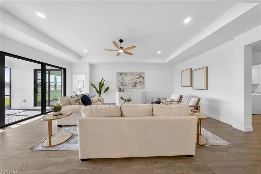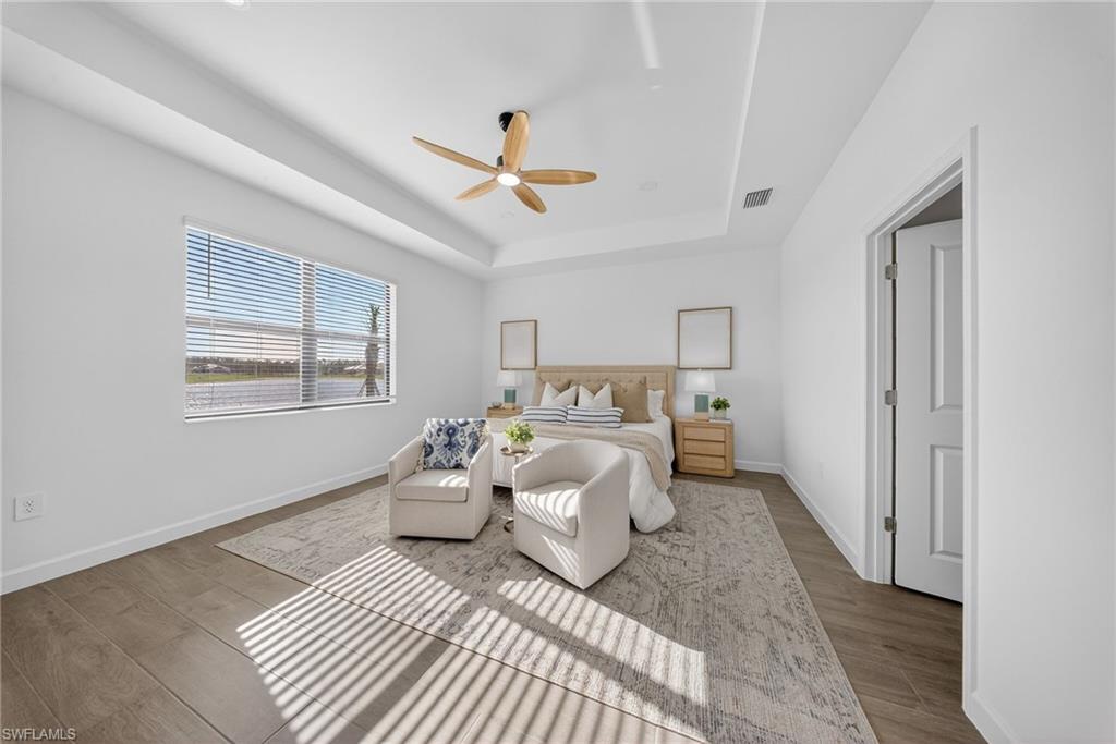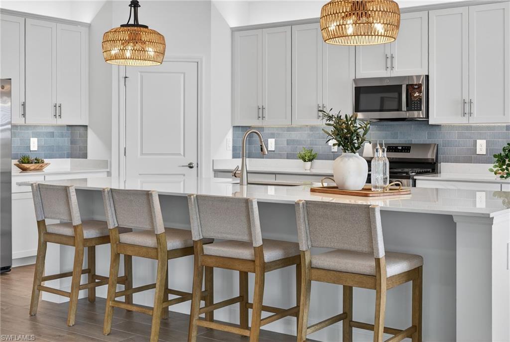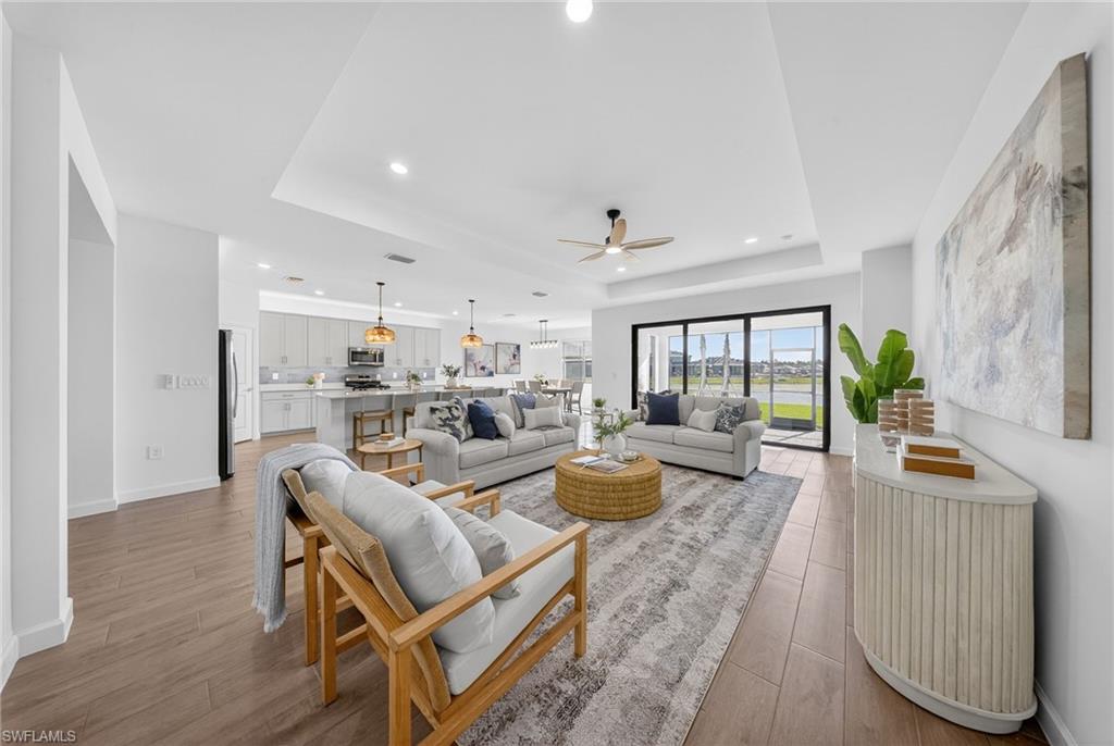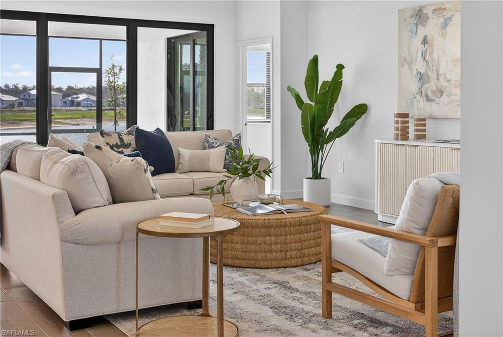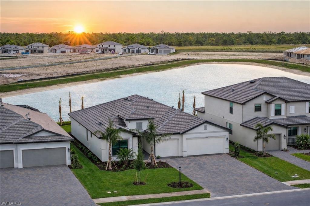 WIDE WATER VIEWS, NEVER LIVED IN, & the POPULAR SUMMERVILLE FLOOR PLAN + SELLER PAYS CLOSING COSTS! Positioned on a PRIME WATERFRONT HOMESITE in Verdana Village, this BRAND NEW 3 BEDROOM + DEN, 3 BATH residence offers 2,445 sqft of upgraded living without the wait for new construction! The EXPANSIVE REAR YARD captures peaceful SUNRISE VIEWS across the lake and offers room to create your own OUTDOOR OASIS with a custom pool (ask us for affordable quotes and renderings!). Inside, the Summerville floor plan impresses with DOUBLE GLASS ENTRY DOORS, an OPEN CONCEPT LAYOUT, UPGRADED FINISHES, and PLANK WOOD-LOOK TILE throughout. FRESH COASTAL LIGHTING, DESIGNER CEILING FANS in the living room, bedrooms, den, and lanai, plus professional staging with the OPTION to purchase all FURNITURE SEPARATELY for an EASY MOVE-IN EXPERIENCE! The kitchen features WHITE CABINETRY with SOFT-CLOSE CABINETS, UNDER-CABINET & OVER-CABINET LIGHTING, WHITE QUARTZ COUNTERTOPS, a BRAND NEW COASTAL TILE BACKSPLASH, CUSTOM PENDANT LIGHTING, a large island, MODERN DINING CHANDELIER, and all NATURAL GAS APPLIANCES. Natural gas service is rare to find in Southwest Florida! Privately located at the rear of the home, the primary suite enjoys tranquil LAKE VIEWS, morning sun and direct lanai access. The spacious bath offers SPLIT DUAL VANITIES, QUARTZ COUNTERTOPS, a LARGE WALK-IN SHOWER, and TWO WALK-IN CLOSETS. The split bedroom design includes a guest room with a full bath at the front of the home, while the second guest suite enjoys its own wing with a PRIVATE EN SUITE BATH and WALK-IN SHOWER—perfect for longer-term guests or anyone wanting their own space. The DEN, with solid double doors, is ideal for a HOME OFFICE, MEDIA ROOM, or additional guest area. Additional features include a laundry room with ADDED UPPER CABINETRY and a UTILITY SINK, plus a 3-CAR GARAGE with EPOXY FLOORING, a TANKLESS water heater, and plenty of room for storage, beach gear, bicycles, and a golf cart. Residents of Verdana Village enjoy RESORT-STYLE POOLS, a FITNESS CENTER, INDOOR & OUTDOOR PICKLEBALL, TENNIS, BASKETBALL, BOCCE, a PLAYGROUND, DOG PARK, RESTAURANT, CAFE, and CRAFT COCKTAIL BAR. Just outside the gates is a brand-new Publix plaza featuring Dunkin’, a UPS Store, nail and hair salons, physical therapy, a dentist, fine Italian dining, and a bank coming soon! Yes, you can grocery shop from your golf cart! Minutes from Old Corkscrew Golf Club, Stoneybrook Golf Club, Miromar Outlets, Gulf Coast Town Center, and approximately 20 minutes from Southwest Florida International Airport. The seller is offering assistance with buyer closing costs, and with all the upgrades already done plus the option to purchase the furniture, this is an easy, move-right-in opportunity!!! One or more photo(s) has been virtually staged, AI generated or rendered.