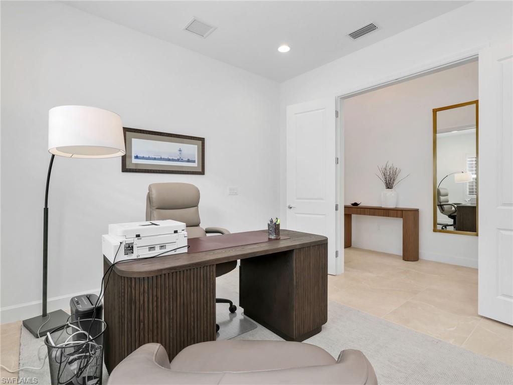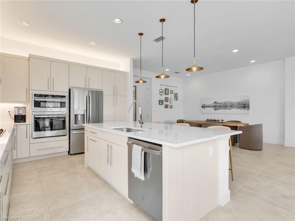 One year home warranty included!! This upgraded 3 bedroom plus den, 3 bathroom home, built in 2025, stands out with an oversized homesite with room for a pool, a private guest suite with ensuite bath, and a designer kitchen featuring natural gas cooking and custom illuminated cabinetry. The main living area is bright and open, filled with natural light and enhanced by tile flooring throughout and striking designer light fixtures that create a polished, upscale feel. The kitchen is designed for both everyday living and entertaining, offering a large island, natural gas cooktop, wall oven, stainless steel appliances, and custom cabinetry with under and over lighting. The backsplash and countertops are perfectly matched for a clean, cohesive finish, while both a breakfast area and a separate dining space provide flexibility for casual and formal gatherings. Sliding glass doors lead to a screened lanai, creating a seamless indoor outdoor flow and offering plenty of space to design your own private pool and outdoor retreat on this premium lot. The primary suite is a private retreat, featuring a tray ceiling, abundant natural light, and dual walk in closets. The ensuite bath is designed for comfort with dual vanities, a soaking tub, and a separate walk in shower. A well appointed guest suite includes its own private bath, creating an ideal setup for visitors, while the third bedroom is conveniently located near an additional full bathroom. The den, set behind double doors, offers a flexible space for a home office, media room, or additional guest area. Plantation shutters throughout the bedrooms, bathrooms, and den add a refined, cohesive look while enhancing privacy and light control. A paver driveway and welcoming foyer lead into a thoughtfully designed layout that provides separation between the guest areas and main living spaces while maintaining an easy, natural flow throughout the home. Valencia Trails is a 55+ community that offers a premier resort style lifestyle centered around its expansive clubhouse, featuring a full service restaurant and bar, resort style pool, lap pool, and a state of the art fitness center with group classes and wellness programs. Residents enjoy tennis, pickleball, and bocce courts, scenic walking and biking paths, and a full calendar of social events, clubs, and activities that create an active and connected community atmosphere.