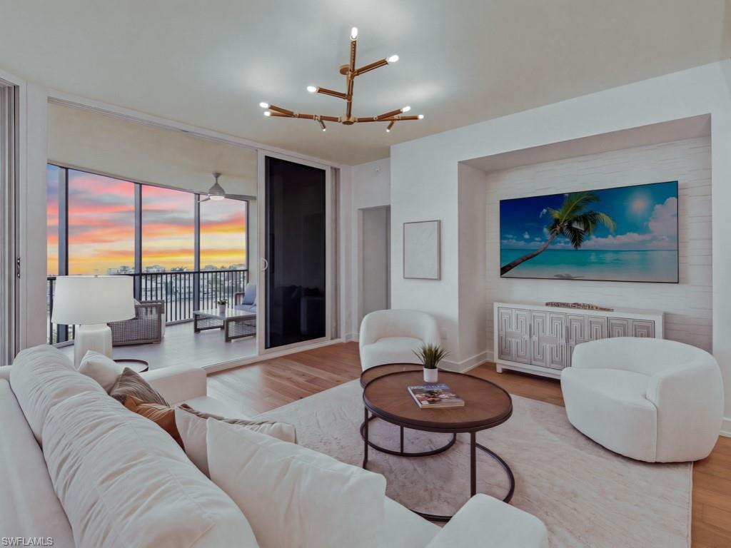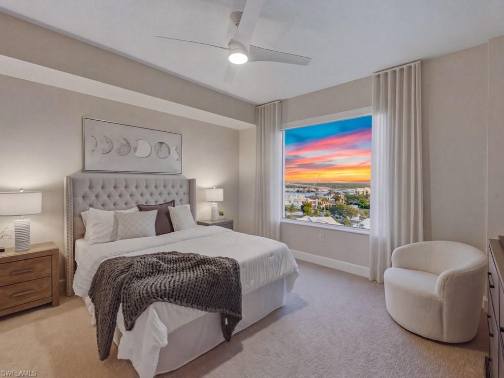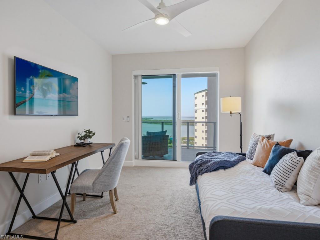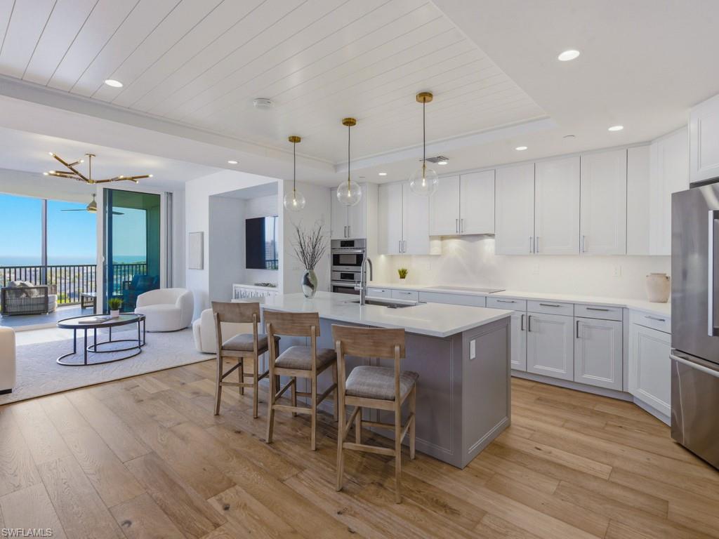 One or more photo(s) has been virtually staged, AI generated or rendered. Welcome to exceptional coastal elegance in the much sought after Grandview at Bay Beach positioned at the peaceful southern tip of Fort Myers Beach. Offered furnished, this exceptional 4-bedroom, 3 full baths plus powder room condo, showcases 2,767 sq. ft. of under-air living space and a total of 3,262 sq. ft. that includes an expansive lanai and balconies overlooking multiple water views in many directions. Built in 2023, the unit features tailored finishes and current state-of-the-art construction throughout, including $125,000.00+ in upgrades that include designer lighting, featured wood panel walls & ceiling.This 8th floor unit location provides expansive visuals of a variety of bay, gulf and canal water views that mesmerize both day and night as you span the surrounding areas. As the sun shines, the days are bright, crisp, vibrant and fresh. Sunsets are glorious and memorable, while evenings become a kaleidoscope of colors. Designed with casual comfort or a more formal feel for entertaining, you set the tone. The open floor plan flows smoothly from one living area to the next and transitions accordingly, day and night. The spacious primary suite invites privacy and relaxation, and three additional bedrooms extend an invitation to your family and guests to enjoy their own quarters, each with a water view and 2 with a shared open-air balcony. Each of the bathrooms are exceptionally designed and spacious. Note too, the condo has its own full-size laundry room. This residence is available for immediate enjoyment, as ti is being offered furnished. One convenient under-the-building assigned garage parking space & an extra storage area add to the offering. Amenities for your enjoyment include a Resort-style pool & spa, state-of-the-art fitness center with side studio for yoga, stretching or Tai Chi. Tennis & pickleball courts, active social club room with bar, outdoor grilling & social areas with seating & firepits. Enjoy walking paths, biking with storage, running/jogging & much more. There is also 2 guest suites for reservation in the building for guests coming to town. This is the lifestyle & the setting you've always dreamed of, now, is your time.