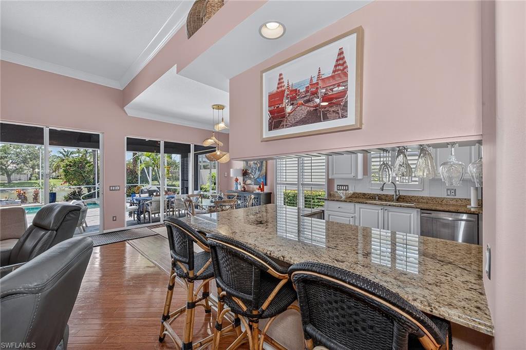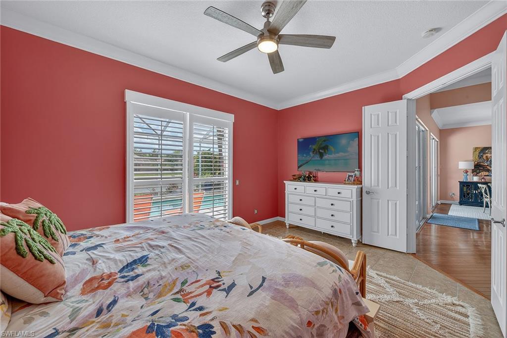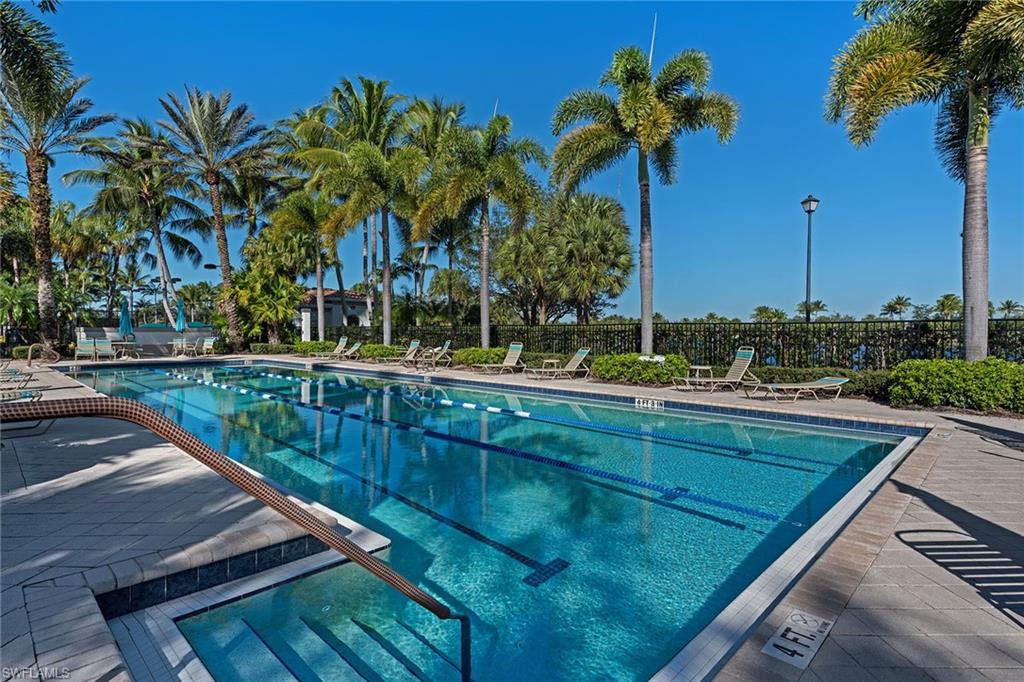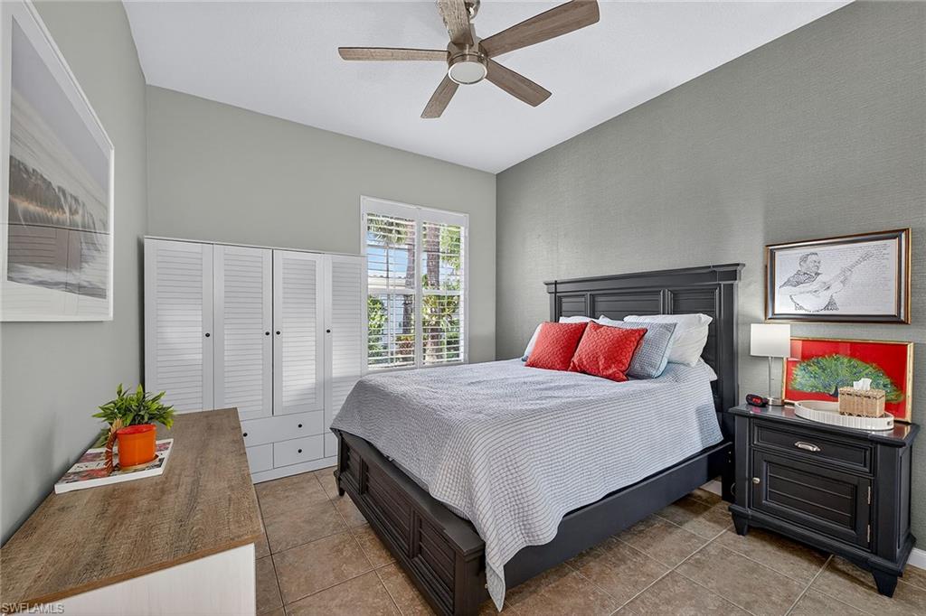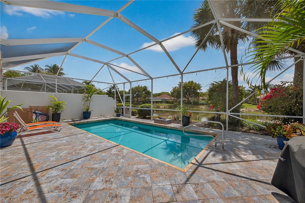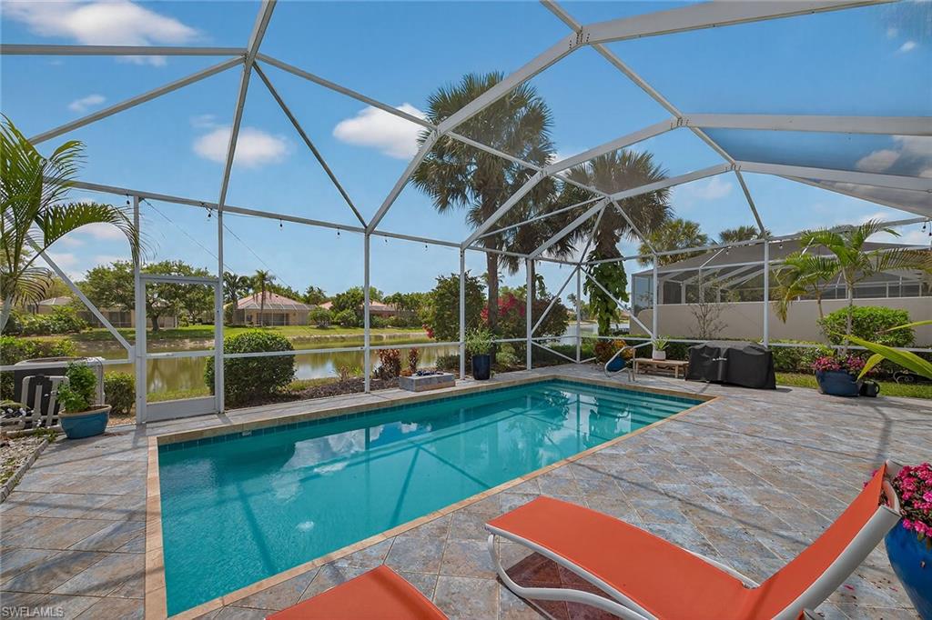 Welcome to this breezy Island-like living, in the Oakmont floorplan, where sunshine is an exclusive part of every day, and the colors of home strike a delightful mood. Its southern exposure and wide lake view will captivate you, while warmth of the gracious residence will keep you in the happiest of places. Hardwood floors throughout are complemented by tile in all bedrooms, and the elevated ceilings and abundant windows bring all the natural light year-round. The kitchen boasts white raised-panel cabinets, stainless steel appliances and luxurious granite countertops. The resident’s suite features dual walk-in closets, dual marble sinks and a floor-to-ceiling walk-in tile shower. A decorative non-slip tile surrounds the pool and outdoor spaces, while the home provides solar and electric heating for optimal efficiency and swimming pleasure. Hurricane and easy-close accordion shutters offer peace of mind, no matter what time of year. You will enjoy world-class amenities at the club, the social heart of Island Walk, such as resort pool, tennis and pickleball courts, fitness center, bocce, putting greens, salon, gas station, car wash and onsite restaurant. You will have it all and a slice of the incomparable life.