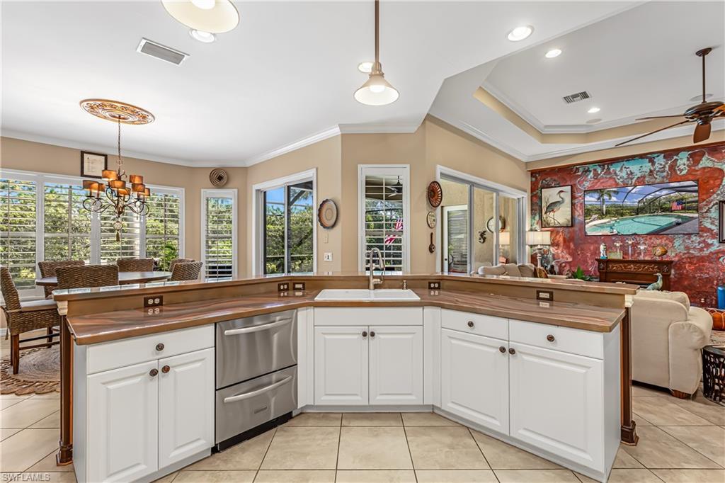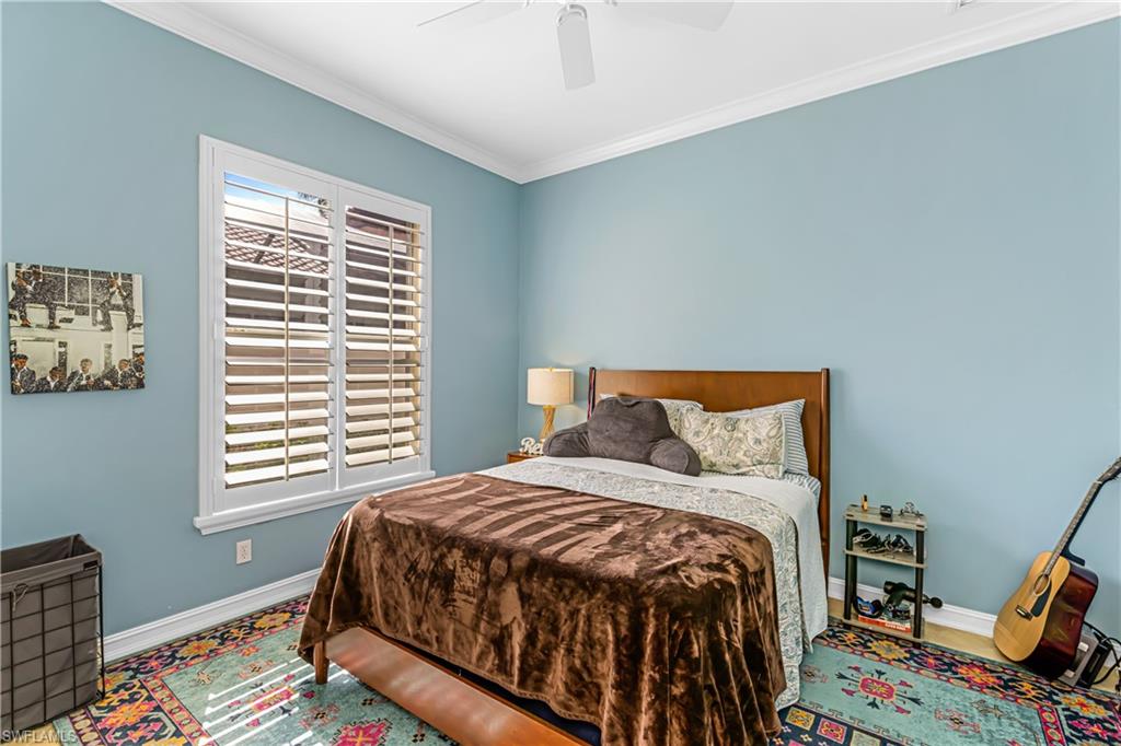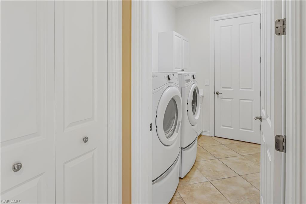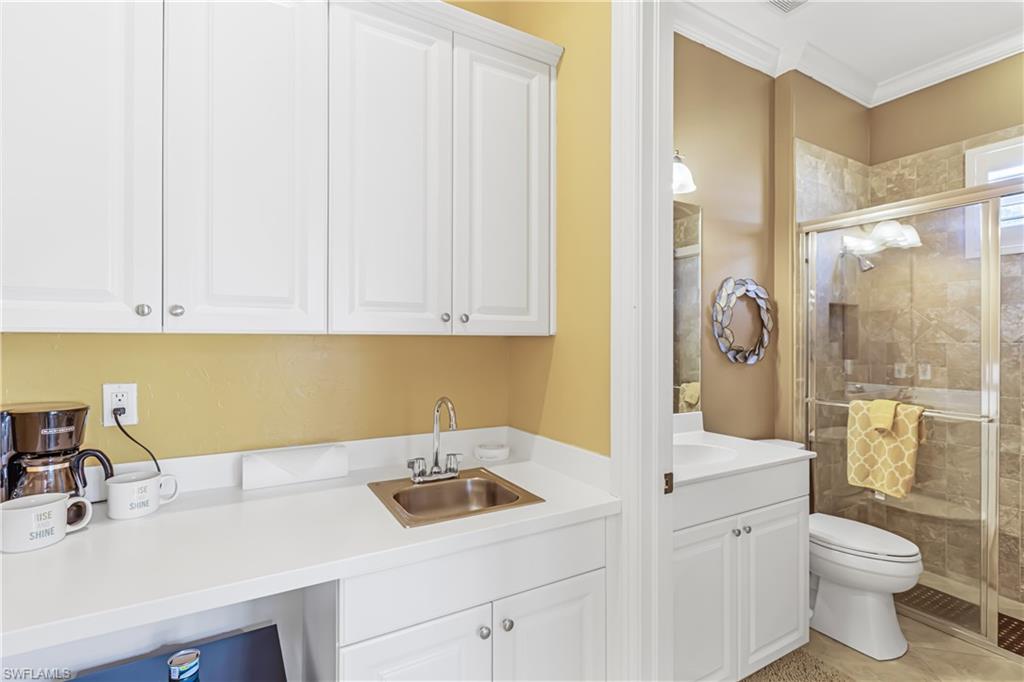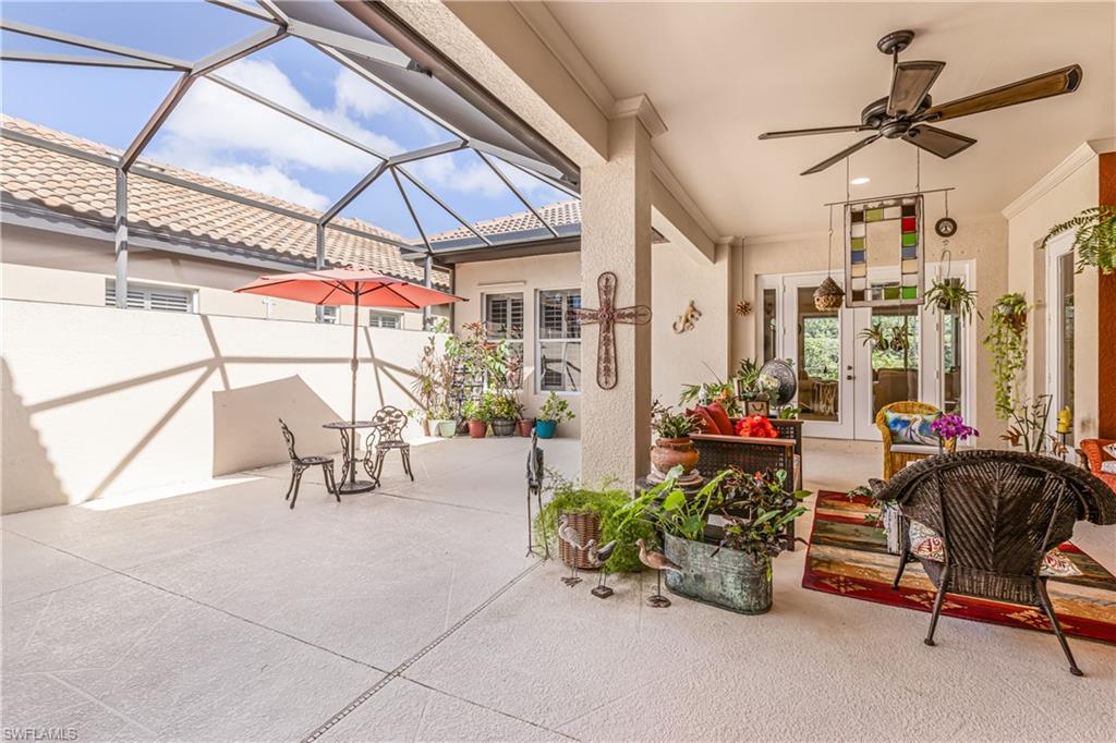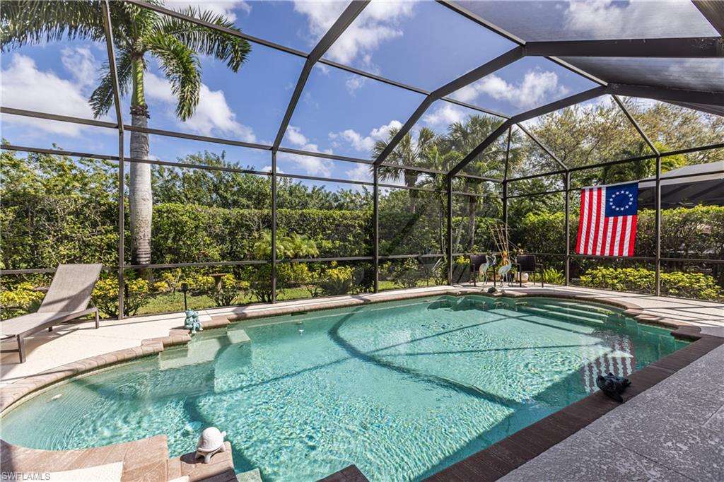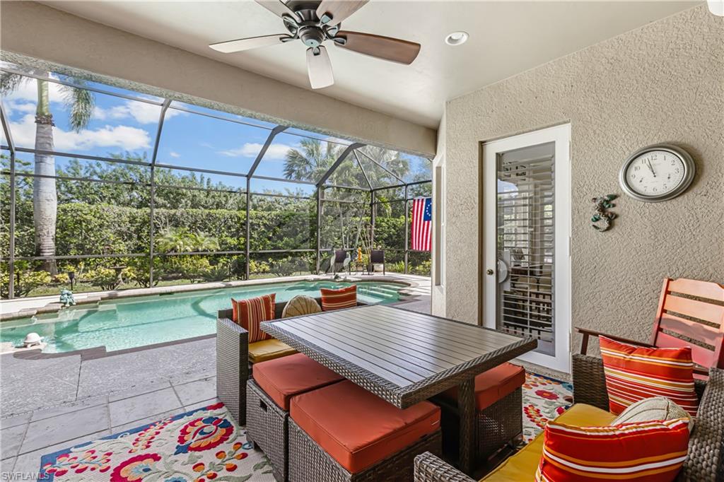 First time since the spring of 2022 a most popular "Salerno" larger courtyard floor plan style home such as this has been offered on the market in the Savona section of Grandezza! Enjoy a spacious courtyard to entertain w/cabana for your guests + your pool is desirably located at the rear lanai for added enjoyment. The back yard is nicely landscaped. The great room has a large open kitchen with a rich epoxy finish countertop, stainless steel appliances, & light cabinetry. A closet has been added to the study, making this a true 4 bedroom home. Also featured are plantation shutters, crown molding, walk-in closets , tray ceiling, electric storm shutter, wall tv's included + garage wall boards & cabinets in this fine home. All within beautiful Grandezza, a year-round active community , with a fine private golf course not mandatory to join, a 53,000 sq. ft. clubhouse in a prime SW Florida location, near shopping, Hertz Arena, FGCU, the airport, hotels, restaurants & more to come.