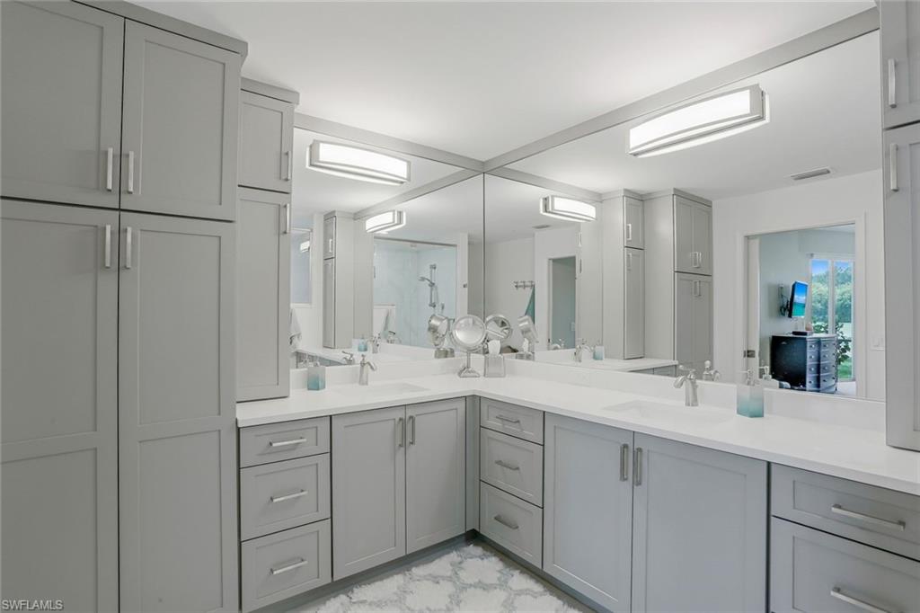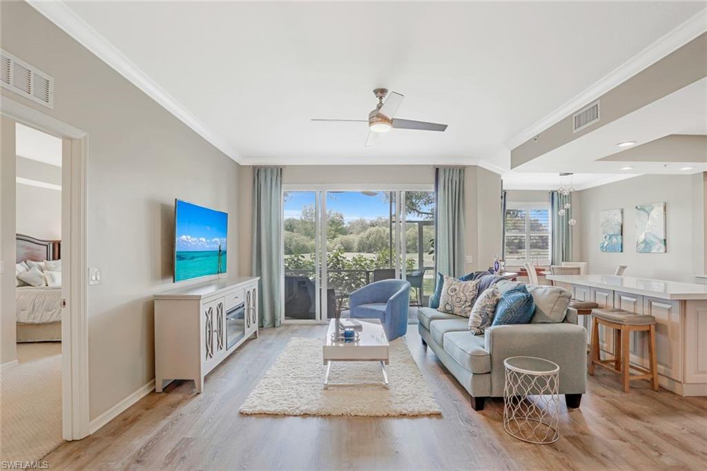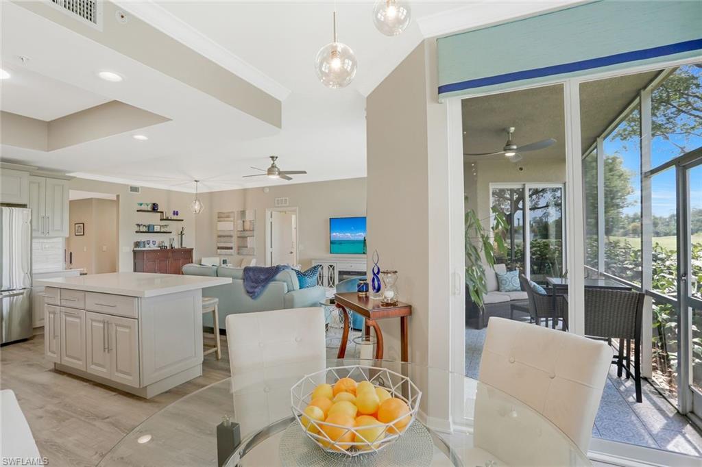 Nestled within a beautiful natural setting, this charming bundled golf community features a championship 18-hole golf course designed by Gordon Lewis. This first-floor carriage home offers a spacious great room floor plan with three split bedrooms, two bathrooms, and a one-car attached garage, all complemented by golf course views and spectacular sunset vistas from the private lanai. The residence showcases a beautifully updated kitchen featuring white solid-surface countertops, gorgeous cabinetry, abundant storage, and a separate breakfast nook, along with a convenient breakfast bar ideal for casual dining and entertaining. Both bathrooms have also been tastefully updated with quality finishes, including a sleek frameless glass shower enclosure, modern fixtures, and elegant details that create a clean, contemporary feel. The great room with adjoining dining area provides an inviting space for gathering, while the spacious primary suite offers direct lanai access, a walk-in closet plus linen storage, dual vanities, and a separate walk-in shower. Amenities within walking distance include a clubhouse with restaurant and bar, a large heated resort-style pool, lap pool, spa, four lighted tennis courts, and a well-equipped fitness center. Cypress Woods is ideally located near the area’s best attractions, including Gulf beaches and nature preserves, Mercato, abundant shopping and dining, and entertainment, making this an exceptional opportunity to enjoy the Naples lifestyle.