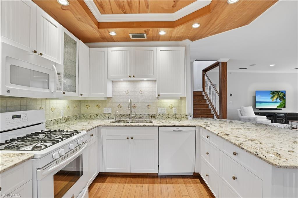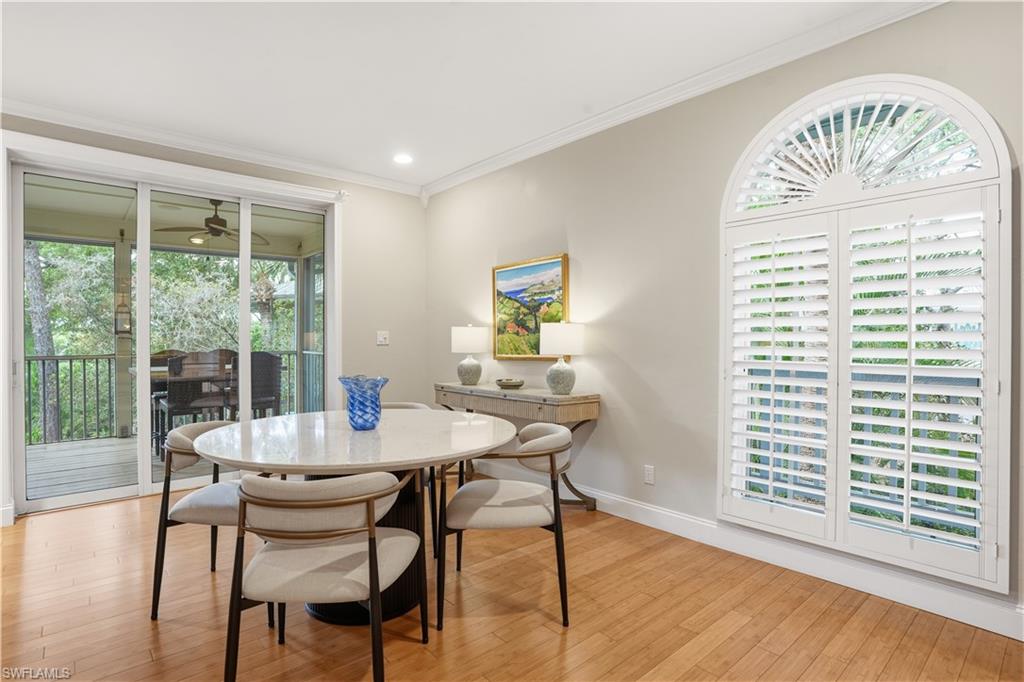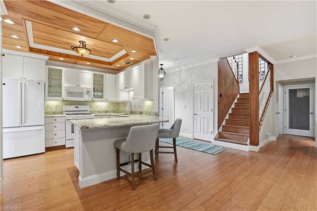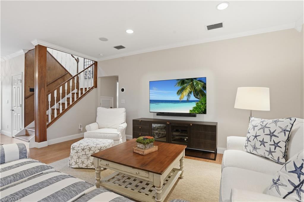 Tucked within the quiet, well-maintained Cracker Cove community of Bonita Bay, this Key West–style home offers effortless Florida living with a functional, multi-level design. The open-concept second floor features a bright living area, kitchen with gas cooktop and wood ceiling detail, dining space, two guest bedrooms, full bath, and laundry. The third-floor primary suite is a private retreat with sitting area, full bathroom, and balcony with serene, tree-top views. Southern exposure enhances the home’s natural light and outdoor enjoyment. The first level includes an oversized 4-car garage with epoxy floors, room for boats and toys, 540 sq ft of finished A/C storage or studio space, a half bath, and private elevator access to all levels. Additional features include bamboo flooring, plantation shutters and landscape lighting.