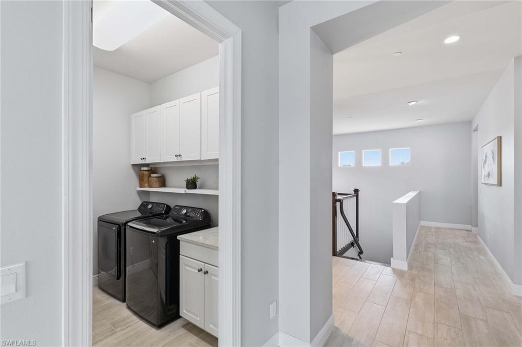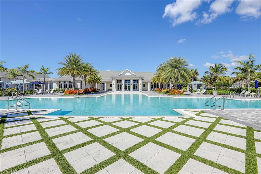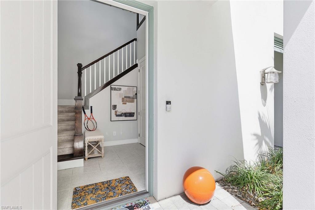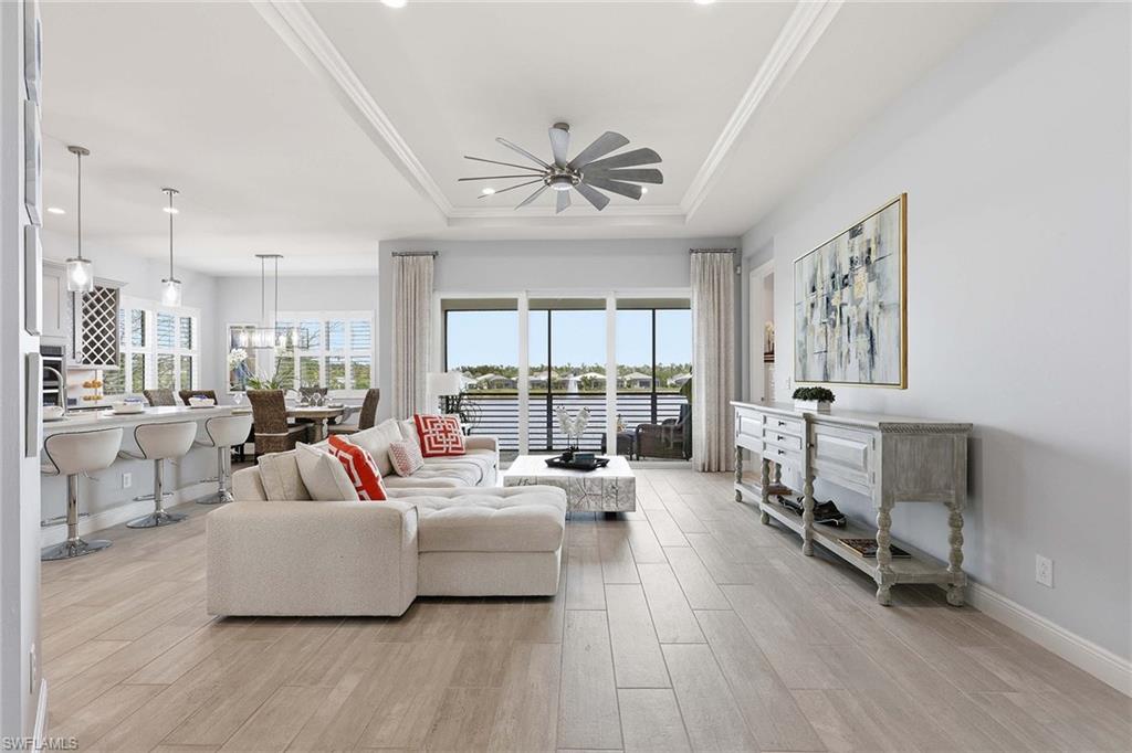 Experience elevated coastal living in this impeccably designed, furnished second-floor coach residence, set in one of Naples sought-after Toll Brothers communities, known for quality construction and cohesive architectural design. The home lives with the ease and scale of a single-family residence with soaring ceilings, an open layout, and walls of impact glass framing long lake and fountain views. Wood-look tile runs throughout the main living areas, complemented by tray ceilings, crown molding, plantation shutters and refined lighting. The kitchen is a design focal point and functional, featuring a large natural gas cooktop, dual wall ovens, quartz surfaces, shaker-style cabinetry, stainless appliances and a substantial island. Upgraded refrigerator makes jumbo ice spheres to chill your favorite beverage. Slide-out pantry shelving and soft-close pot drawers enhance everyday usability, while a custom bar with wine storage supports effortless entertaining. Living and dining areas extend to the screened lanai with serene water views. The primary suite offers a sense of quiet separation and refined comfort, with two walk-in closets with custom built-ins. The bath features a walk-in shower with upgraded drain, soaking tub, and extended dual vanity with added storage. Guest bedrooms are positioned as private quarters, ideal for visitors, while a flexible den offers workspace or retreat. Natural light is abundant with volume ceilings and upgraded lighting and fans. Exceptional storage, rare for Naples, with custom closets, additional interior storage and a spacious two-car garage set this residence apart. Additional features include a tankless water heater and full-impact windows and doors. This is currently the only available four-bedroom residence (third bedroom with closet shown as den) in Azure, offering over 2,600 square feet of living space, an uncommon combination of size, layout and lakefront setting. Residents enjoy a staffed guardhouse and secondary automated entry, along with resort-style amenities including tennis, pickleball, beach-entry pool and spa, fitness center and clubhouse with social spaces. Conveniently near dining, shopping, Interstate 75, and Naples and Marco Island beaches.