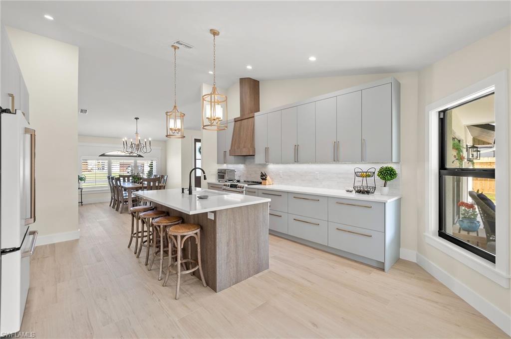 This fully renovated single-family residence has been thoughtfully redesigned with everyday living, entertaining, and safety in mind. The completely reimagined kitchen serves as the heart of the home, featuring custom cabinetry, quartz countertops, a large island, GE Café Series appliances (2022), a custom vented hood, generous pantry storage, and a dedicated coffee bar for added convenience. Throughout the home, plank-style porcelain tile flooring creates a seamless, modern look, complemented by downlighting in every room and plantation shutters for both comfort and style. The primary suite offers a private retreat with direct access to the expanded lanai, a beautifully updated en-suite bath, two custom-designed closets, and remote privacy shades for added comfort and convenience. Additional guest bedrooms provide flexibility for family, visitors, or a home office, while the guest bathroom has been fully renovated with a Kohler cast iron tub. Beyond aesthetics, the home offers exceptional peace of mind with extensive upgrades throughout, including NEW ROOF 2024, NEW PLUMBING 2024 (FULL REPIPE), NEW ALLINI WATER FILTRATION SYSTEM, NEW PAINT INSIDE AND OUT 2024, NEW AC AND DUCTWORK 2024, UPGRADED ELECTRICAL 2024, NEW IMPACT WINDOWS AND DOORS THROUGHOUT 2024, and a NEW HURRICANE-RATED CUSTOM GARAGE DOOR 2025, along with new insulation (2024), interior doors, trim, and additional thoughtful improvements designed for long-term reliability. Functionality continues with a well-appointed laundry area featuring a mudroom-style setup and utility sink, along with epoxy-coated garage floors that provide a clean, durable, and polished finish. Step outside and experience a property designed for gathering and enjoying the Florida lifestyle. The expanded lanai flows seamlessly into a NEW EXPANDED LANAI and outdoor living space featuring a NEW BUILT-IN OUTDOOR BAR with seating for four, a firepit area, and a spacious backyard with room to add a large pool. The NEW CIRCULAR DRIVEWAY, walkway, and rear patio elevate both curb appeal and functionality, while fresh landscaping and low-voltage lighting create a warm, inviting setting day and night. This home has truly been a place for connection and celebration, offering ample space to host everything from relaxed evenings by the firepit to larger gatherings, with room for outdoor entertainment, bounce houses, and even a temporary pool setup for family fun. Boca Palms offers residents a gated entrance, community pool, tennis and pickleball courts, and is located within a highly regarded school district. Just minutes from Naples’ white sand beaches, shopping, dining, and entertainment, this location delivers both convenience and lifestyle. This is a rare opportunity to own a move-in-ready home where the hard work has already been done.